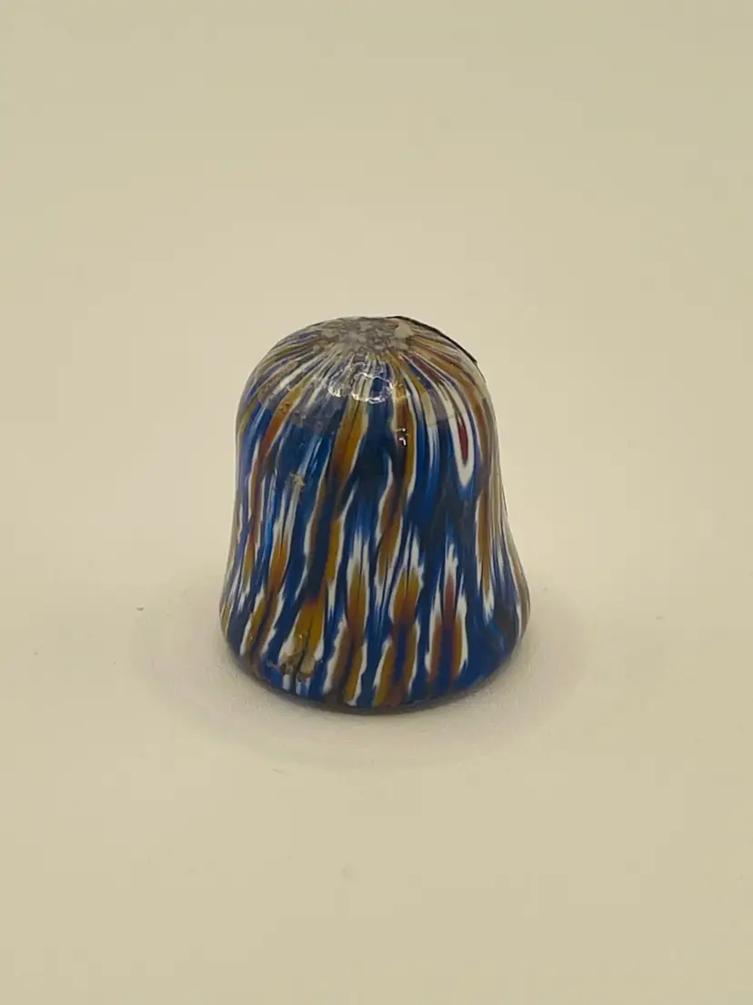 La Serenissima Murano glass thimble. Multicolored, handblown, glass thimble. This was most likely made between 1970 and the 1990s. This stands 1 inch tall. There are no chips or cracks.