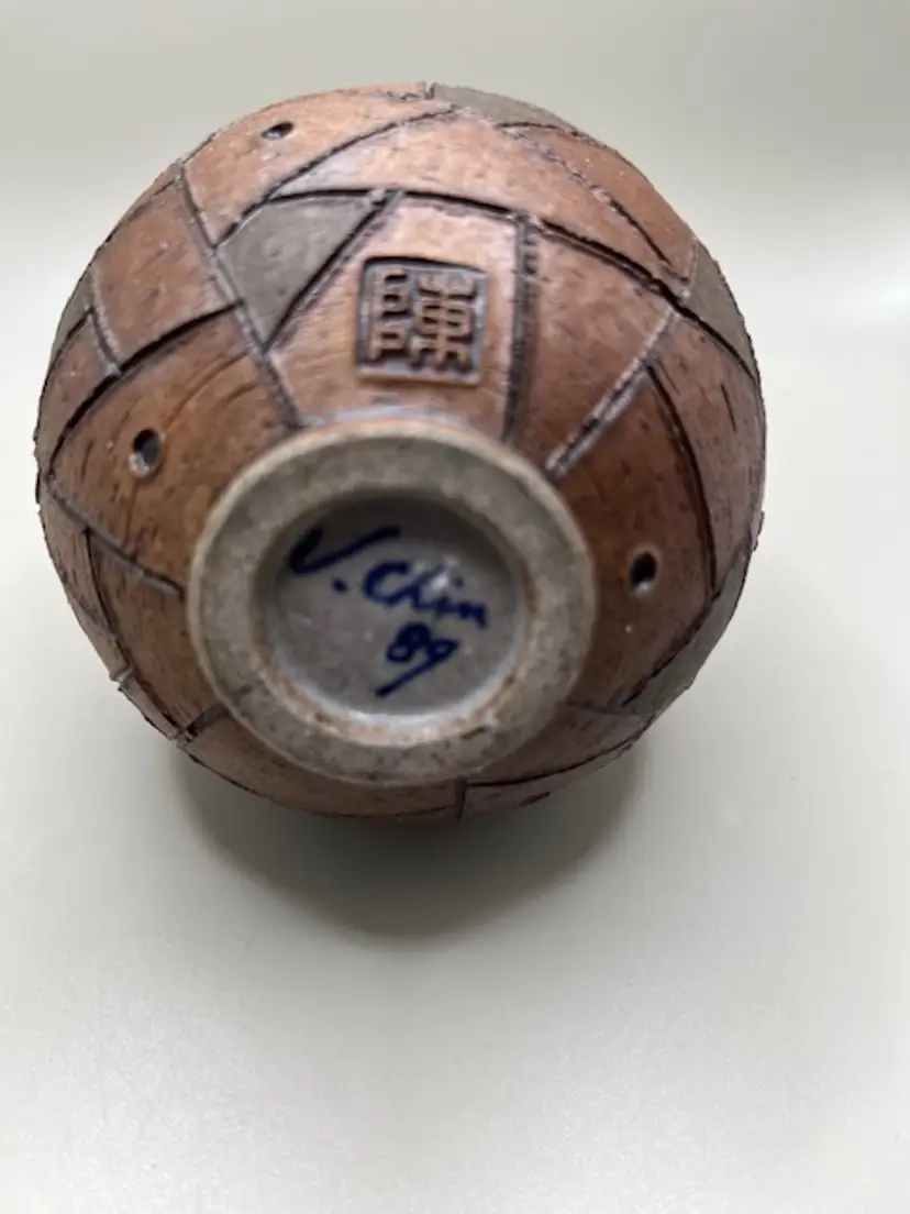 Vase features a square seal-script mark, likely a maker's mark or artist signature, as seen in pictures. Measures 6 inches tall.