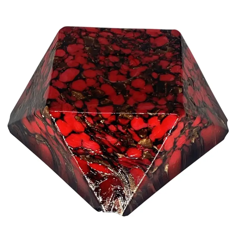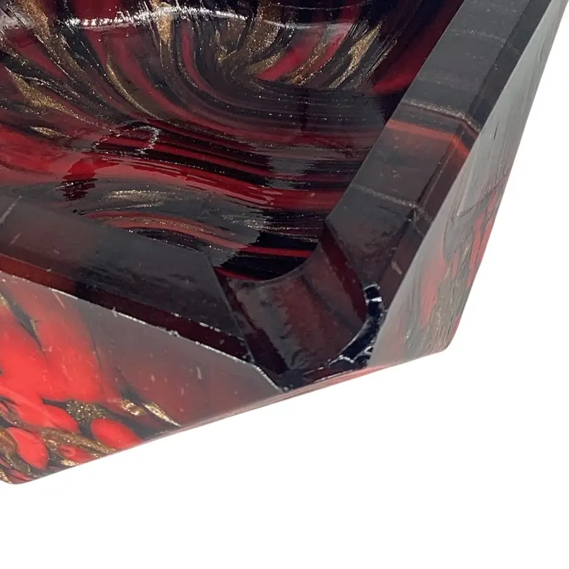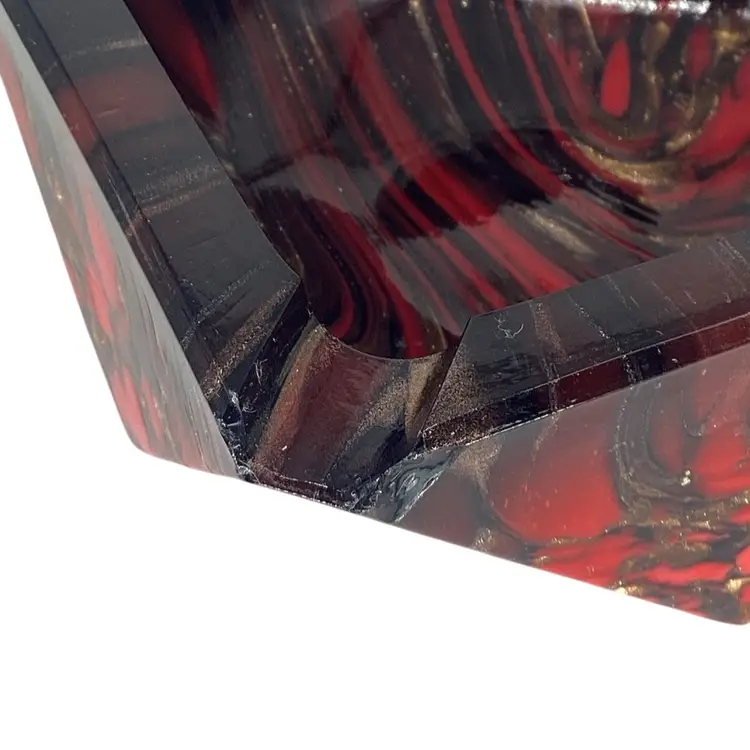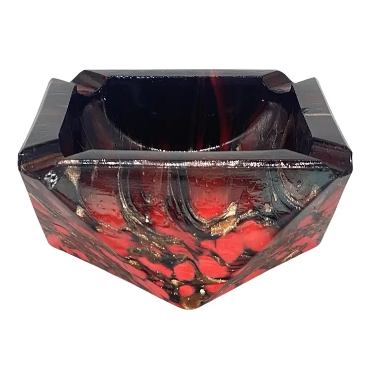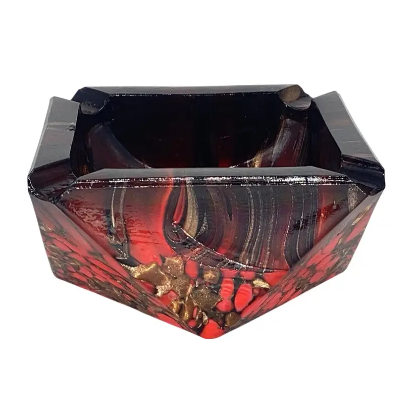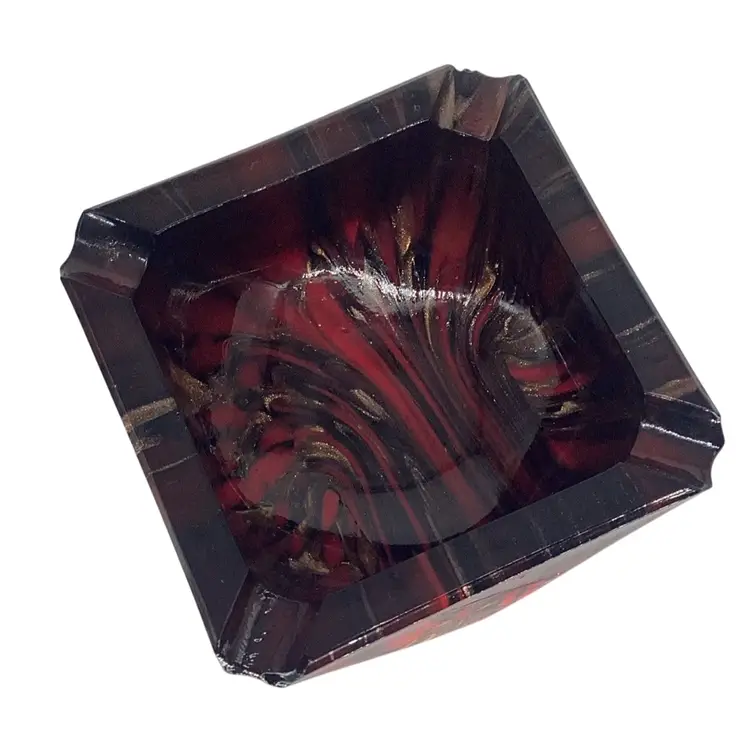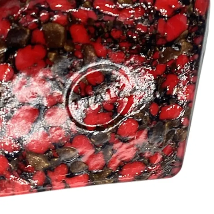 Beautiful shades of red and black mixed with copper. Slightly textured on the outside, but smooth on the inside Measures roughly 4 inches square by 2 inches tall Marked Italy on the bottom Please note that there are some small chips in the corners, shown in the photographs