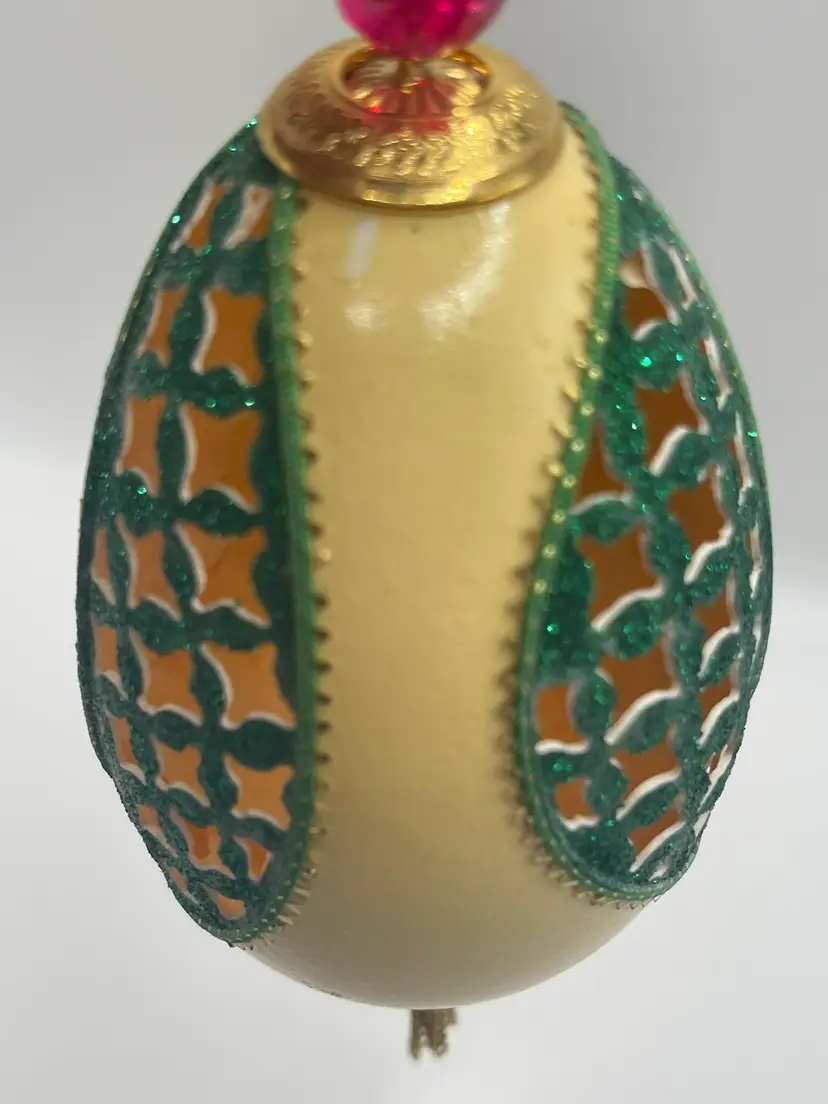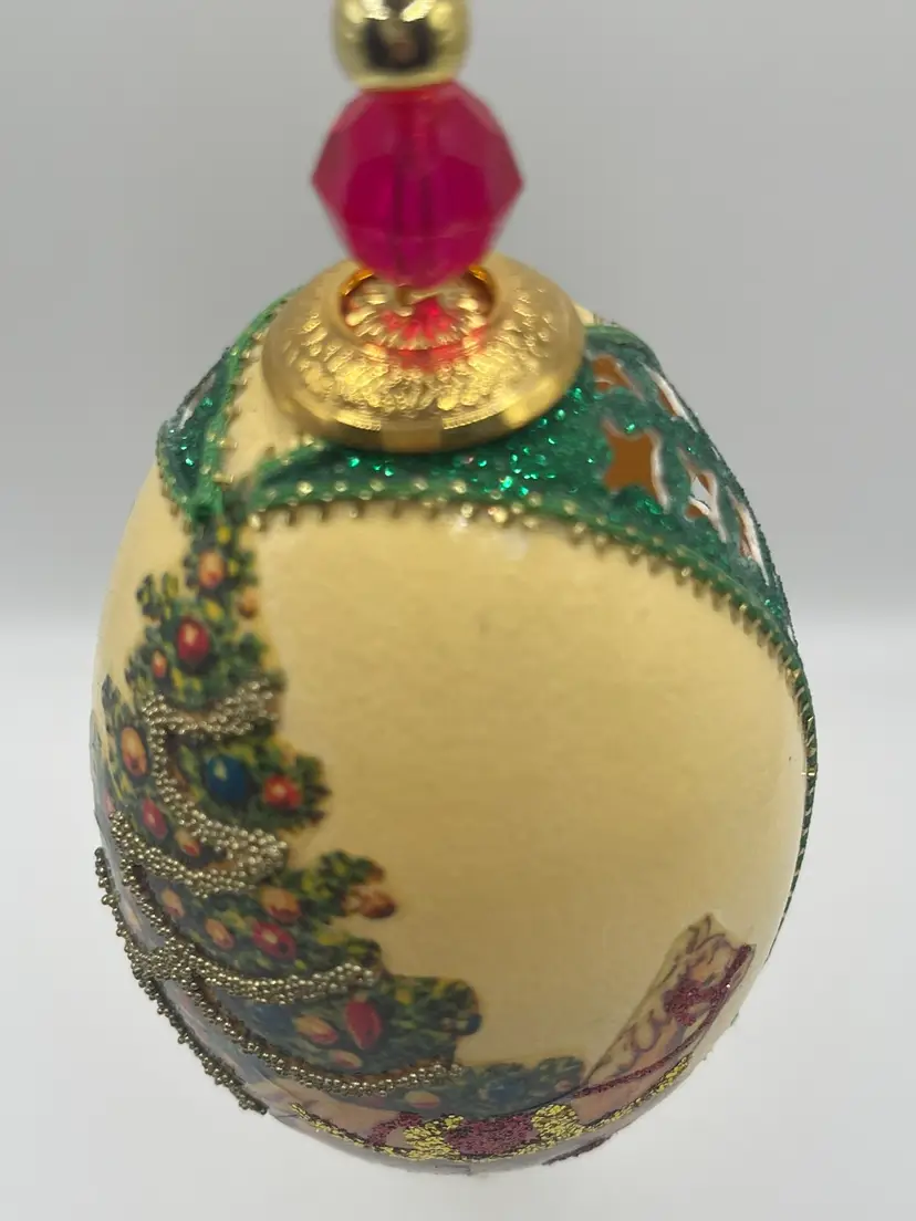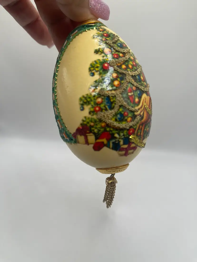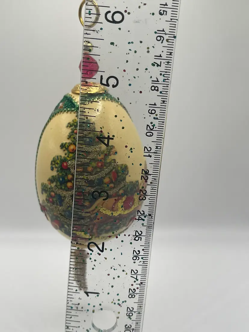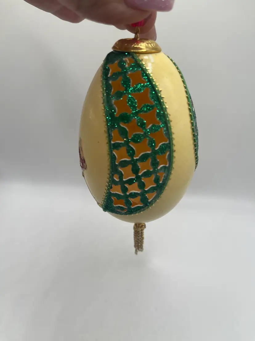 This Estate find ornament is perfect for any Christmas occasion and will add a touch of whimsy to your holiday decor. Whether you're a collector of ornaments or just looking for a special decoration, this vintage piece is sure to delight. The egg measures 6 inches in length, 3.5 inches in height, and 2.5 inches in width. Celebrate the holiday season with this beautiful and timeless ornament.