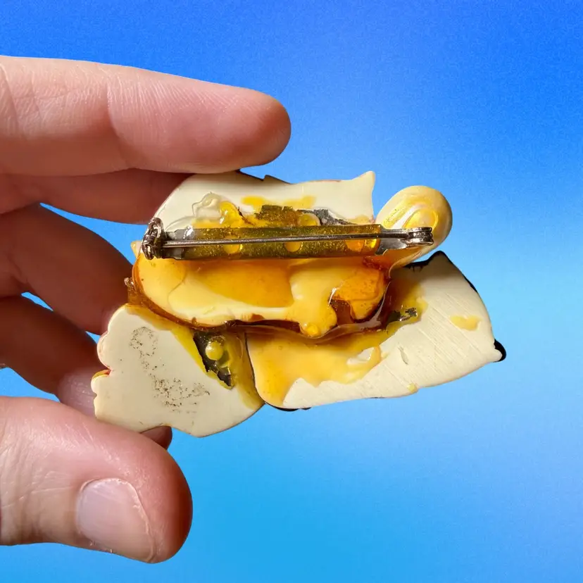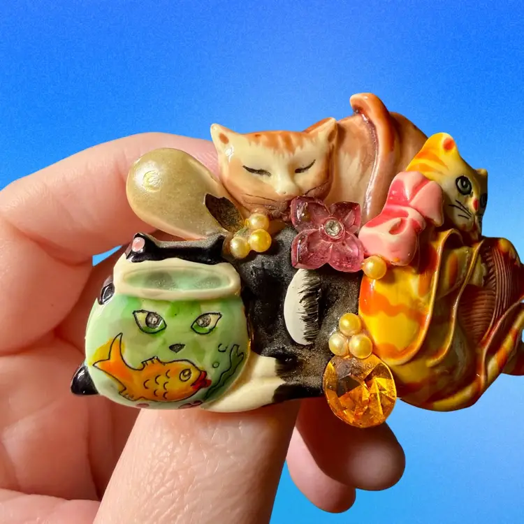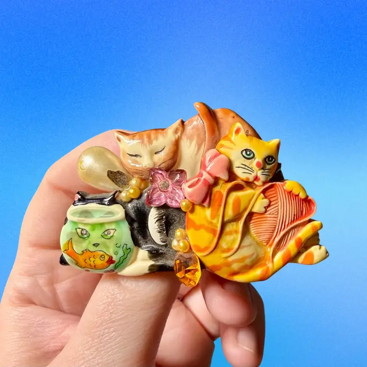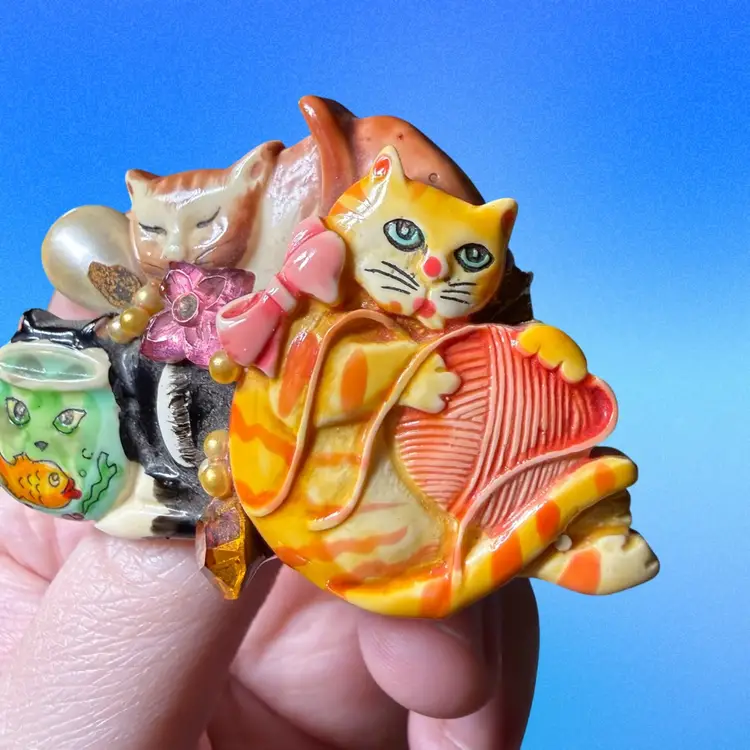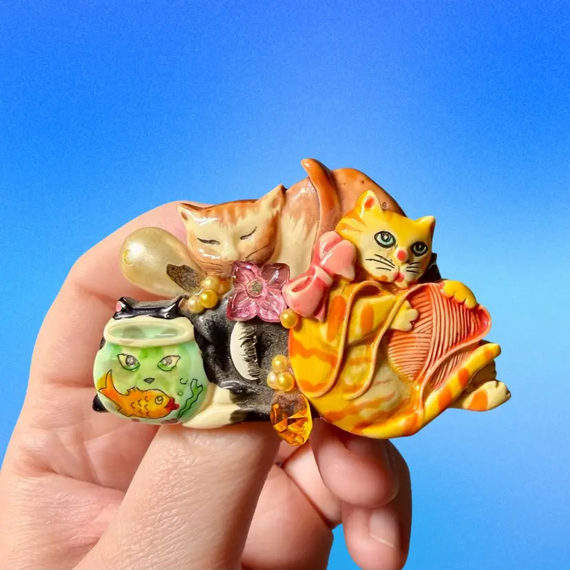 2.5”x1.75”x0.5”. Darling vintage brooch pin featuring three mischievous cats, one peeking through a fishbowl! Is also embellished with a few beads - a faux pearl, a pink flower, an amber rhinestone. Backside looks like there may have been a carved signature, but it’s illegible and I can’t quite tell! Backside has a good amount of brown glue visible. No issues other than being a little dusty!