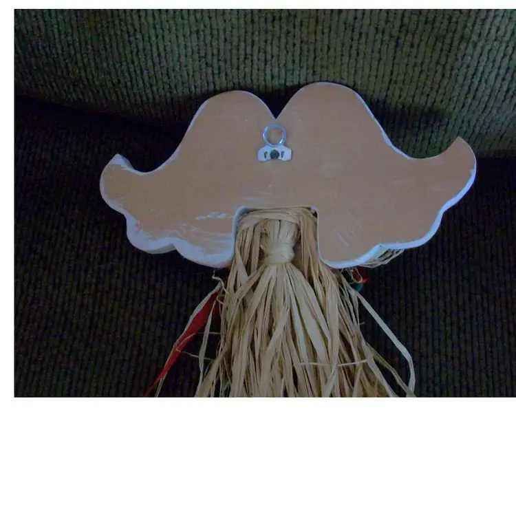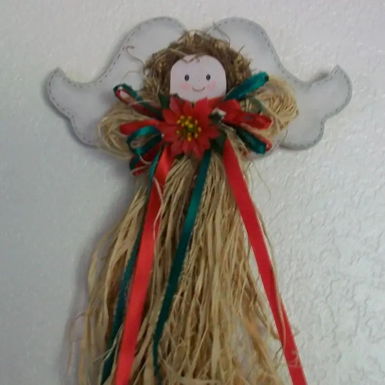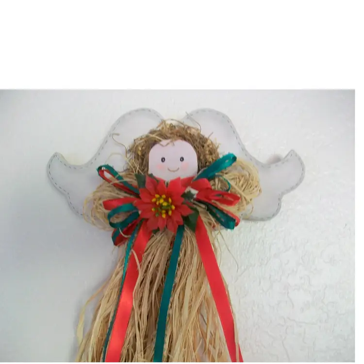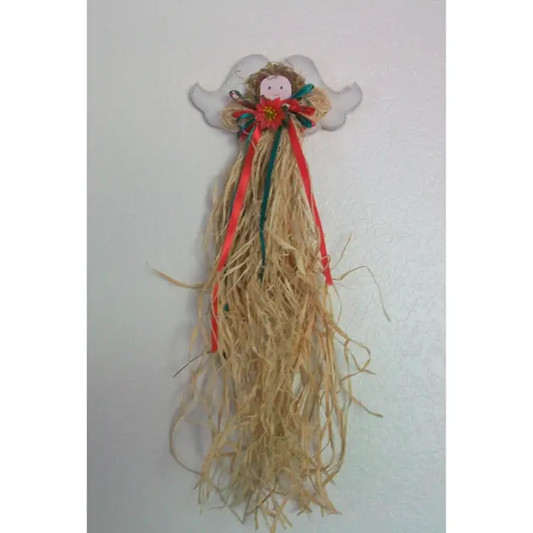 Charming handcrafted raffia angel wall hanging, perfect for adding a touch of rustic charm to your home decor. Features a cute hand painted face, red and green ribbons, and a flower accent. Ideal for Christmas or year-round decoration. Approx. 21" tall.