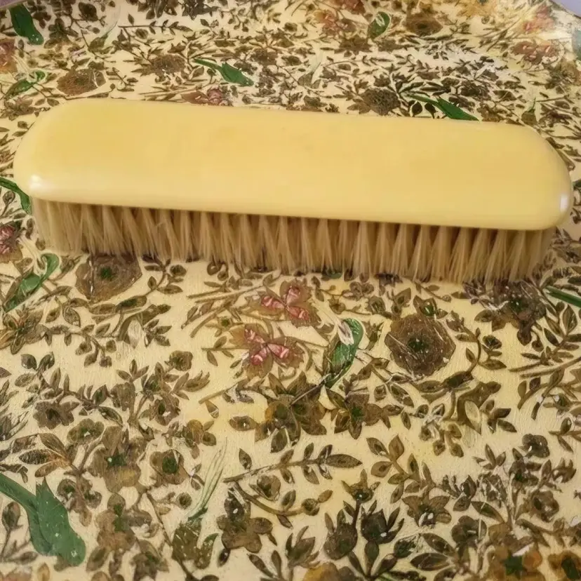 Classic vintage handheld clothes brush with a smooth yellow handle. Perfect for keeping your garments looking fresh and lint-free. Measures approximately 8 inches long.
