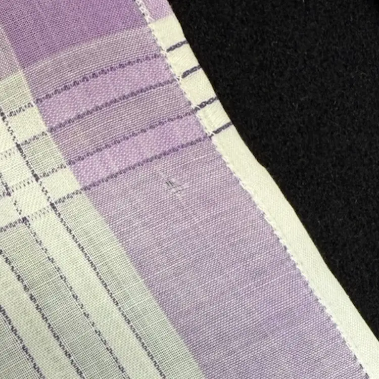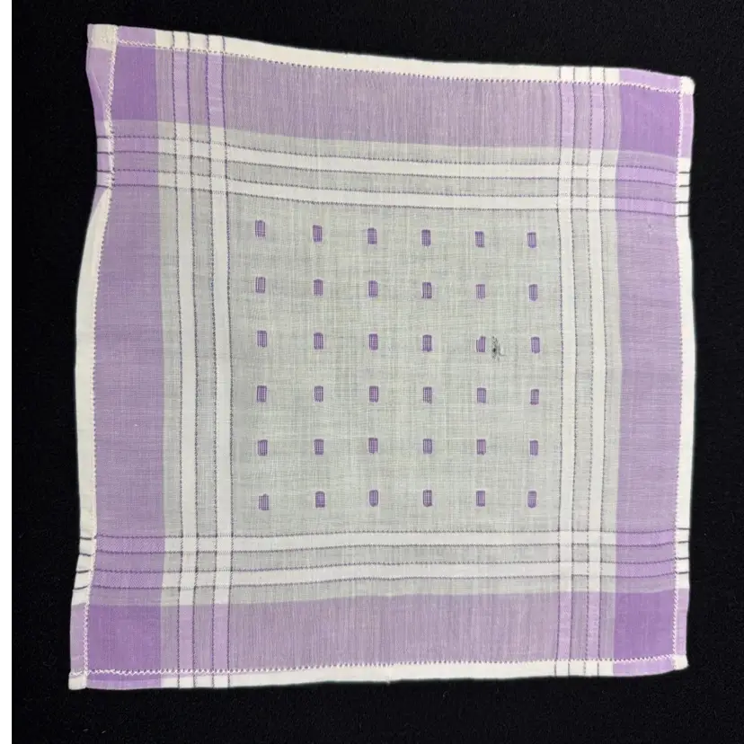 Purple and white woven cotton handkerchief. Striped around the edges, bars in the center. One small hole and a wonky seam on part of one edge as seen in photos. 8 ½”x8 ½”