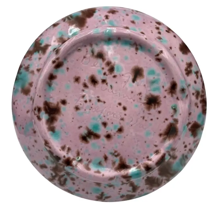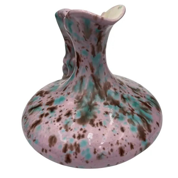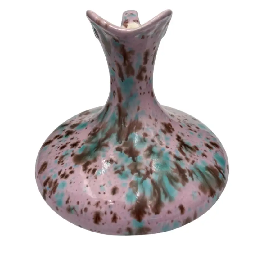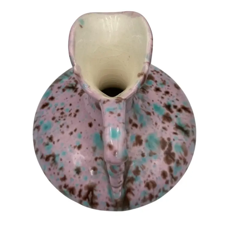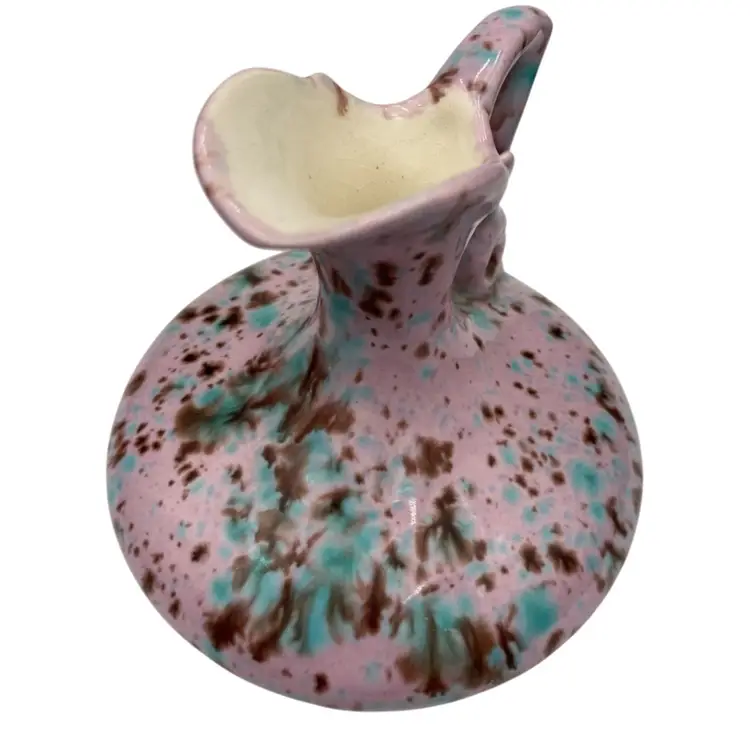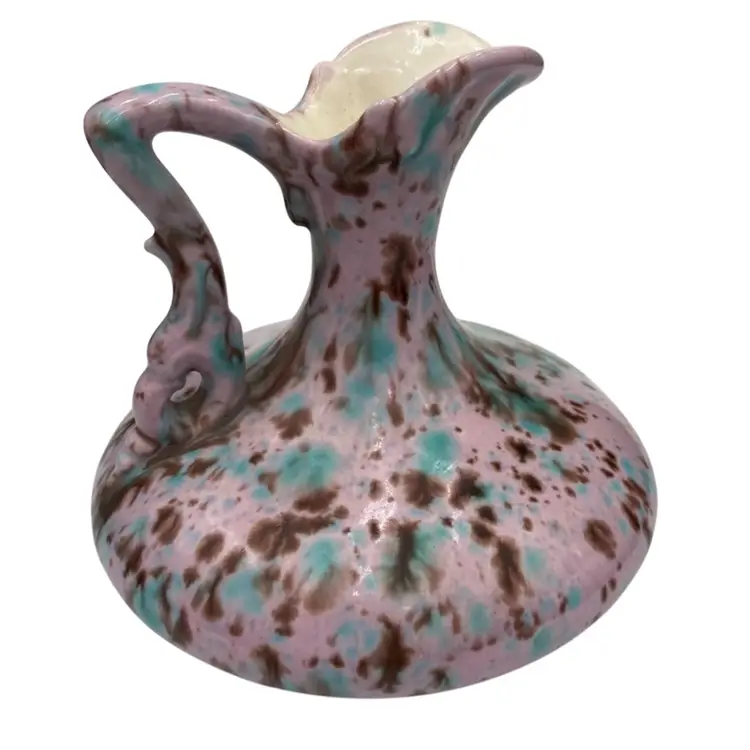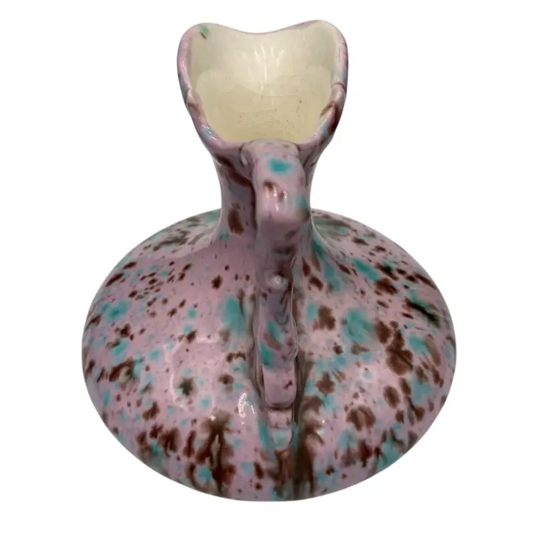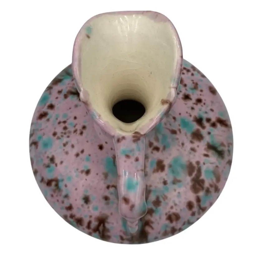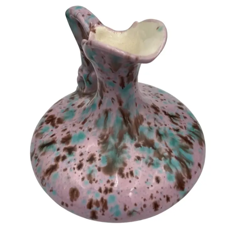 This unique handmade ceramic pitcher is a beautiful piece. The lavender-pink base glaze sets off the aqua and brown dripped glaze to create an eye-catching decorative piece that could also be used as a bud vase. The sculpted handle and spout create additional interest. Measuring 4.5 inches in height and 4.25 inches in width, this original art pottery piece is lightweight at just 8 ounces. The glossy finish and incised backstamp add to its charm, and the fact that it is handmade in Bedford, Virginia makes it even more special.
