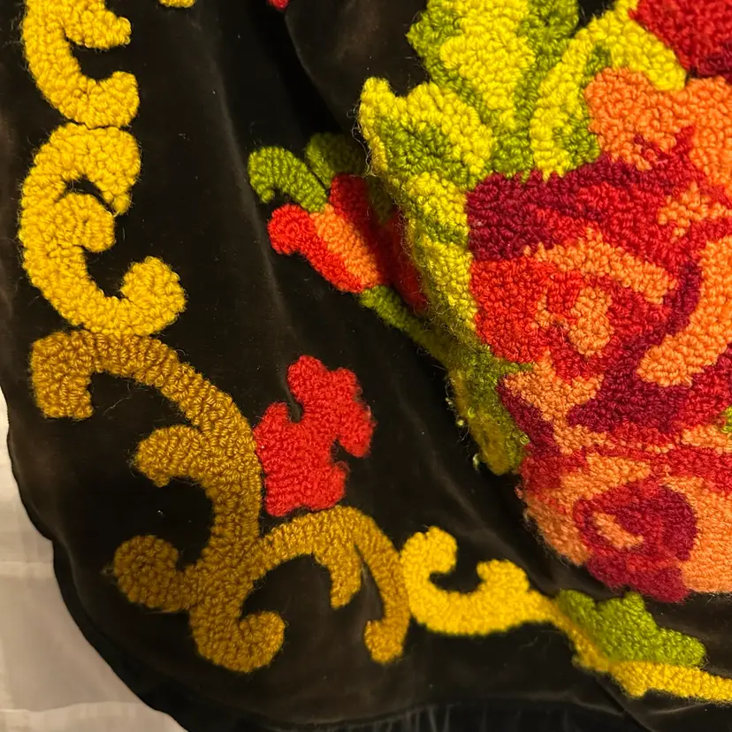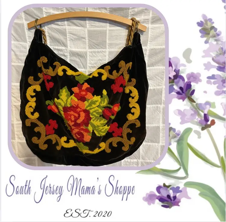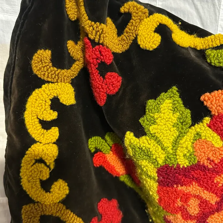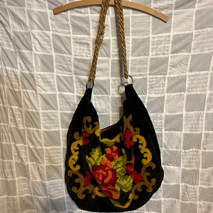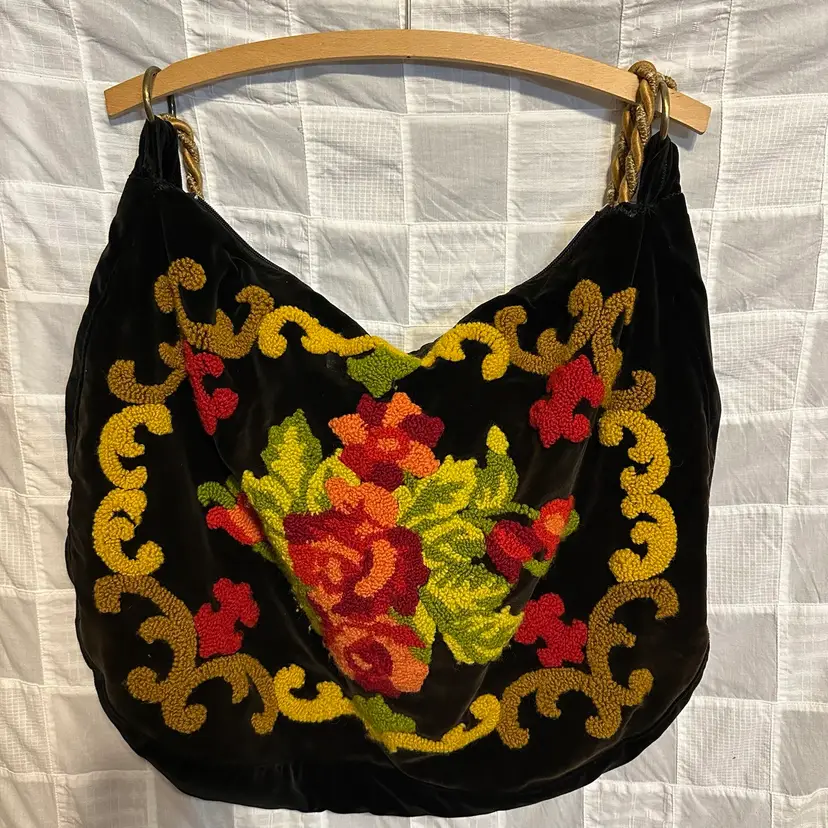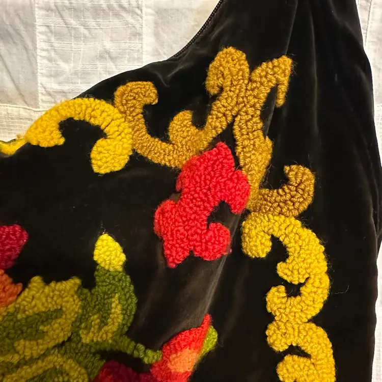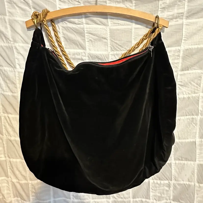Absolutely gorgeous! I’m fairly certain it’s a true velvet. The gal I got it from said her Lithuanian grandmother had handmade it. It does need zipper work, as well as you can some wear on the rope like cording she used to make the straps. She just knotted it, and that’s frayed. The inside has a smaller zippered pocket as well as a larger pouch. The inside is corduroy. No odors that I can smell, and I’m very sensitive to smells. Measures approx. 20 x 16 c 4. Overall, a gem!