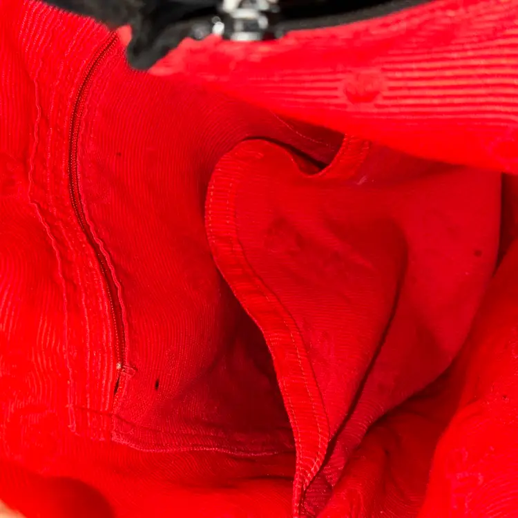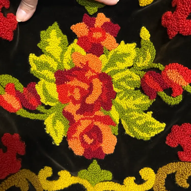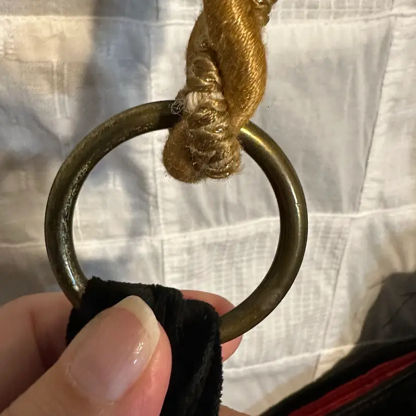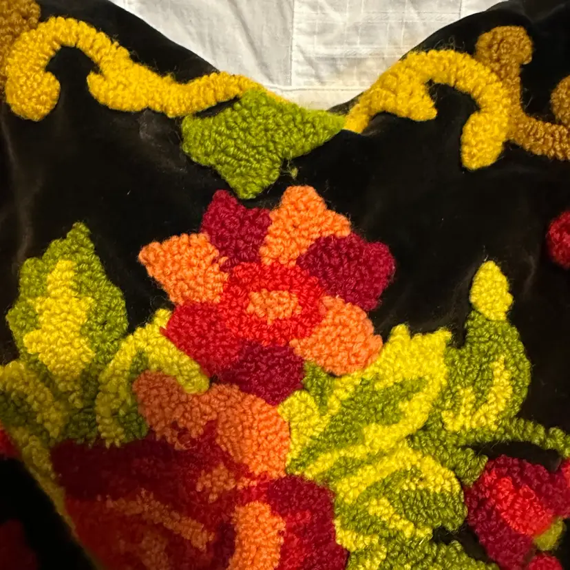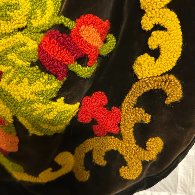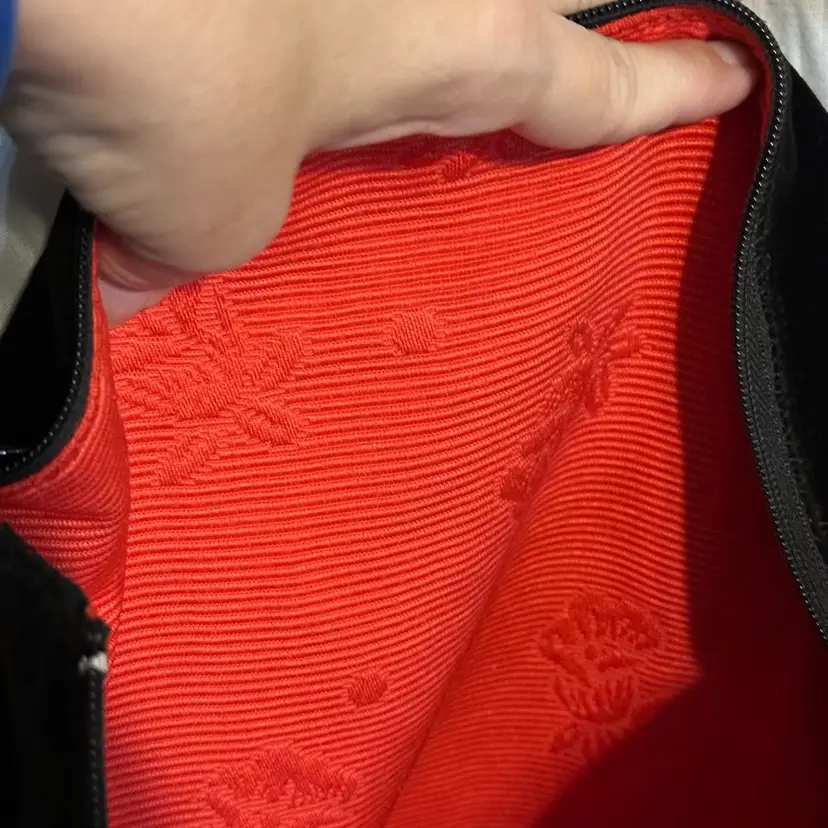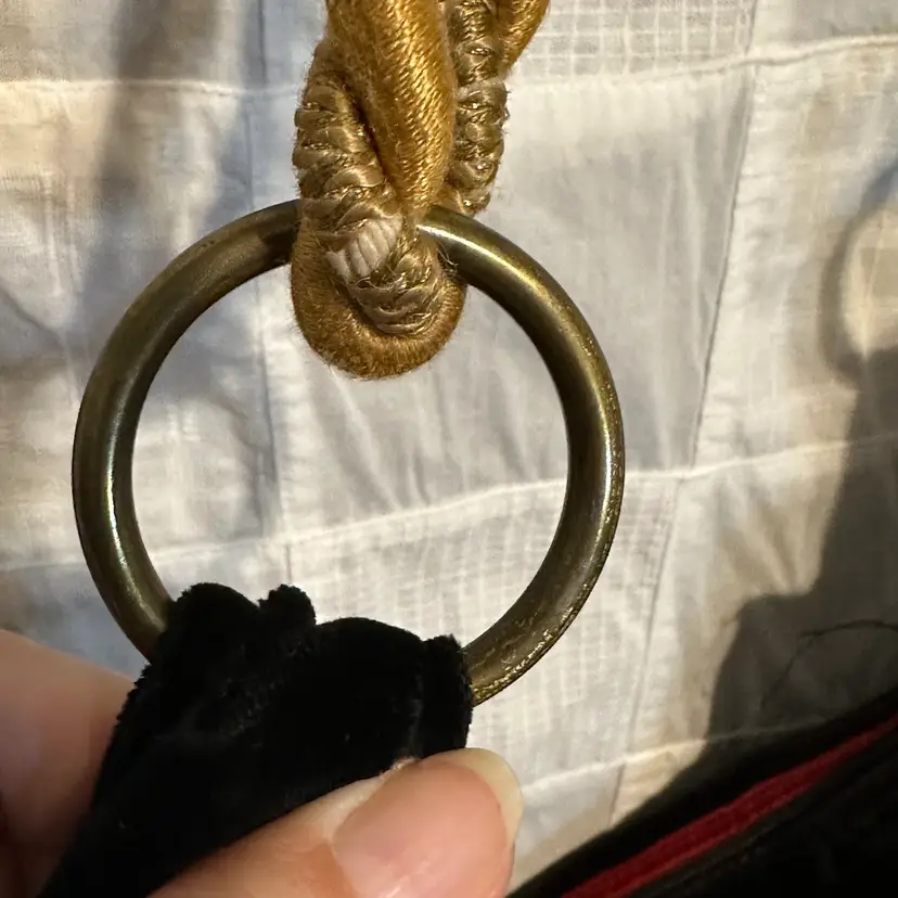 Absolutely gorgeous! I’m fairly certain it’s a true velvet. The gal I got it from said her Lithuanian grandmother had handmade it. It does need zipper work, as well as you can some wear on the rope like cording she used to make the straps. She just knotted it, and that’s frayed. The inside has a smaller zippered pocket as well as a larger pouch. The inside is corduroy. No odors that I can smell, and I’m very sensitive to smells. Measures approx. 20 x 16 c 4. Overall, a gem!