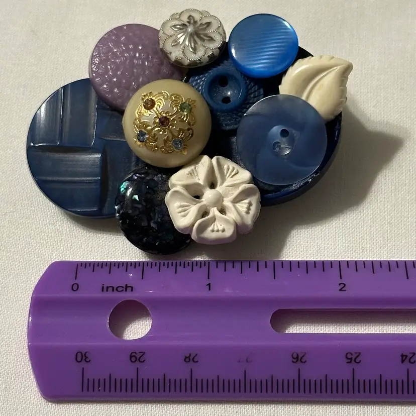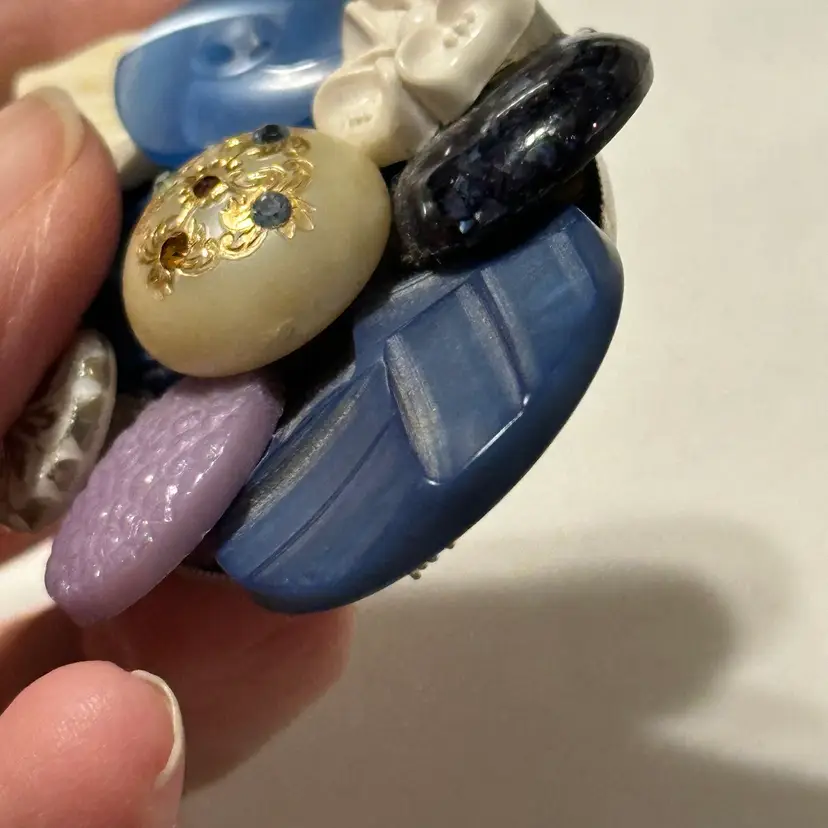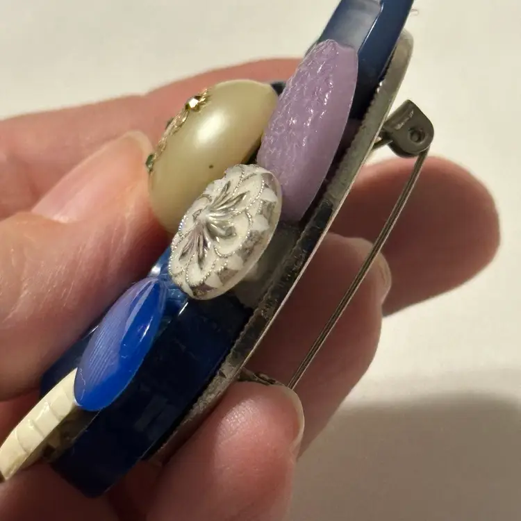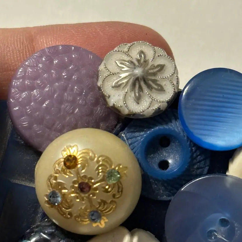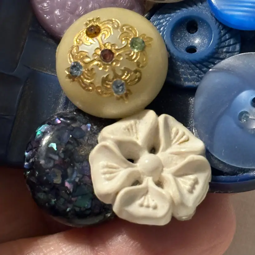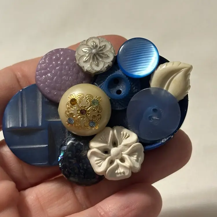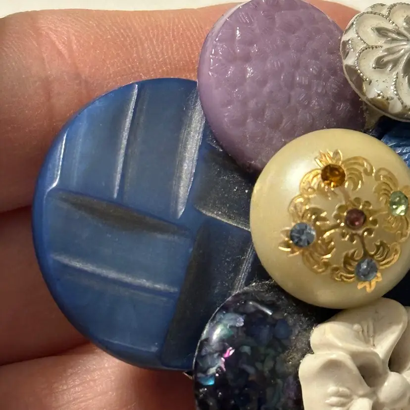 So much fun! The buttons are very pretty. One is a confetti lucite. Glue residue on back. Minor wear, but overall nice. Would look amazing on a denim blue jean jacket.