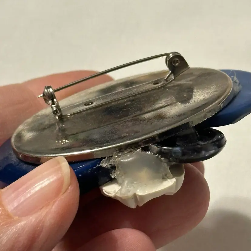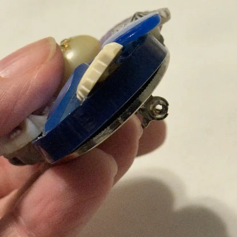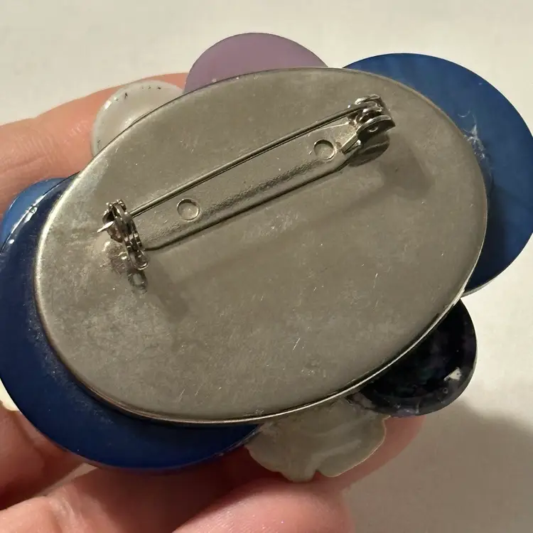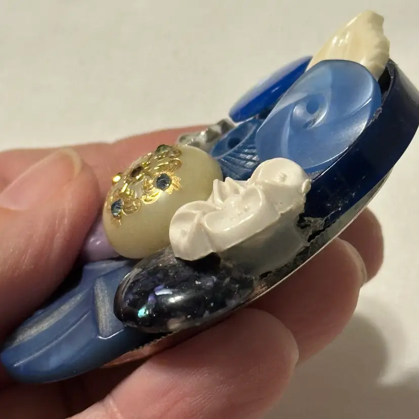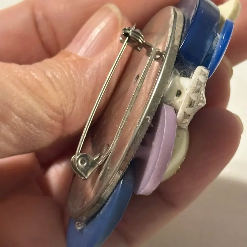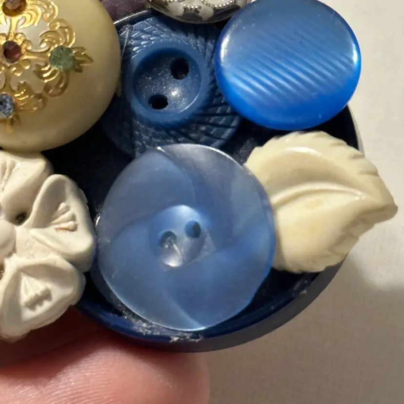 So much fun! The buttons are very pretty. One is a confetti lucite. Glue residue on back. Minor wear, but overall nice. Would look amazing on a denim blue jean jacket.