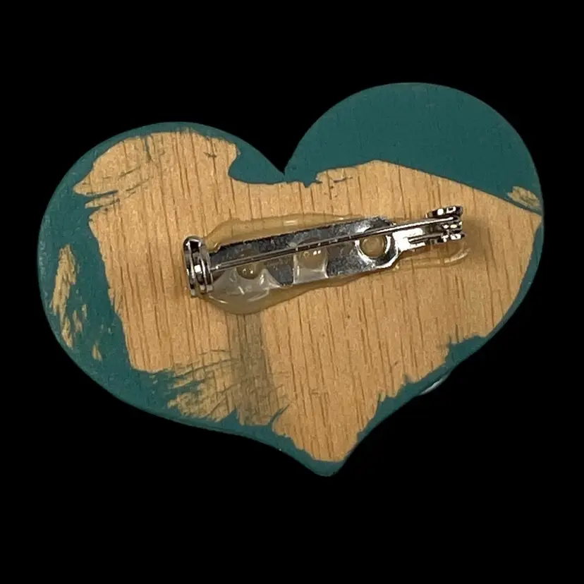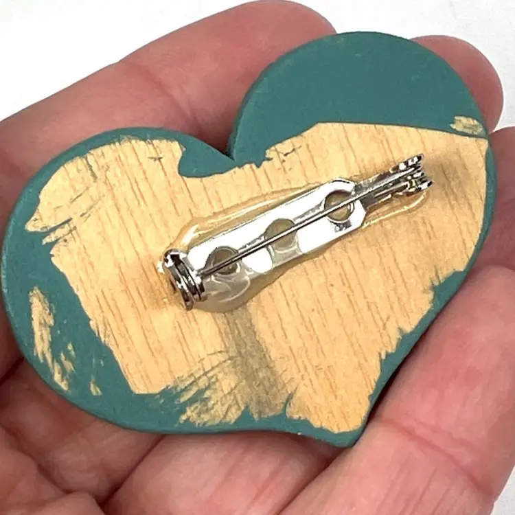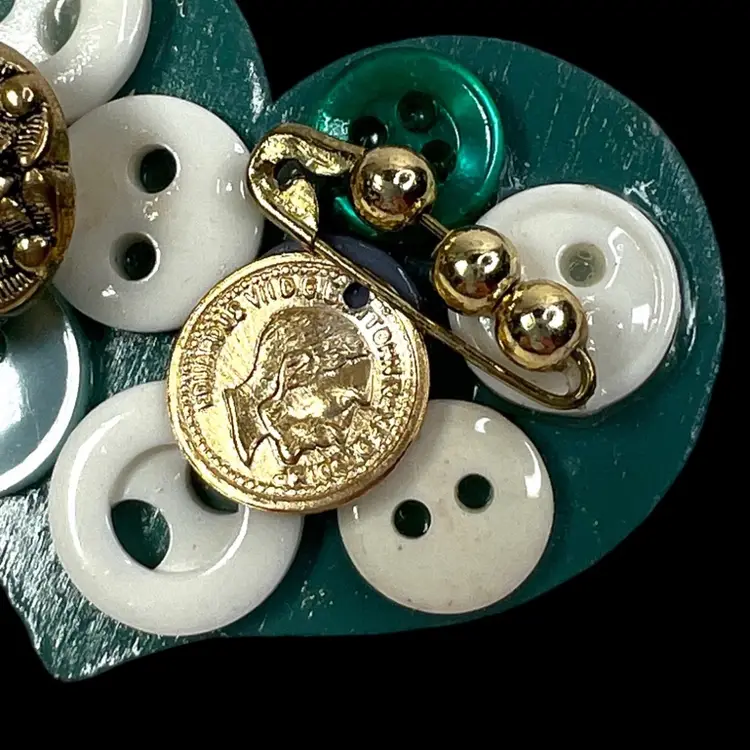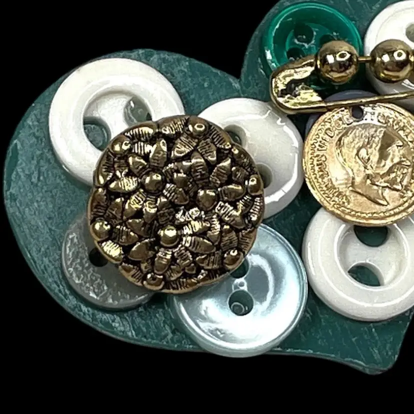 Vintage Handmade Button Wooden Heart Hand-painted Brooch Pin Perfect For St. Patrick’s Day ☘️ or Mother’s Day ❤️ Green heart with buttons & adornments Green color on heart is not emerald green, more blue-gray-green 1-1/2” H x 2” W Condition: Not painted fully on back