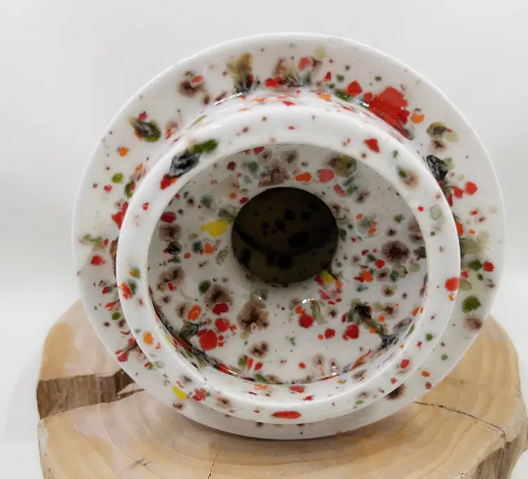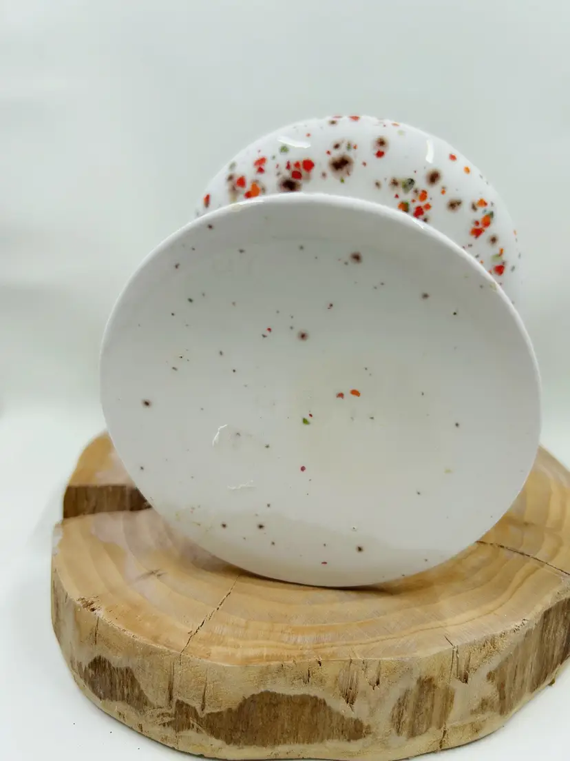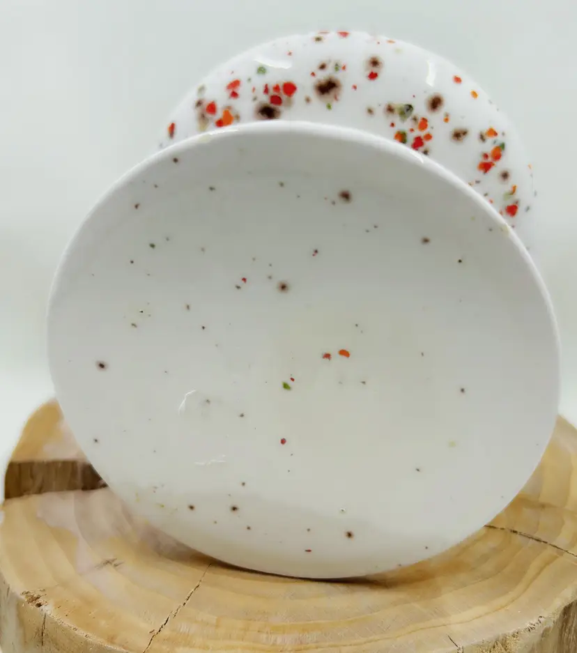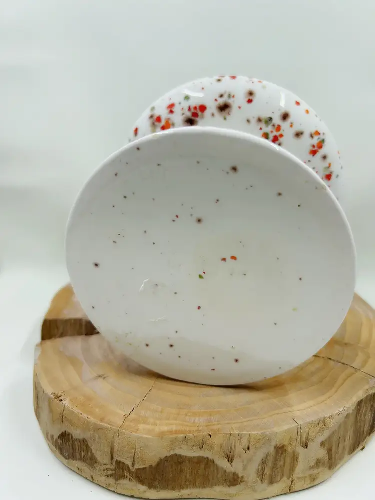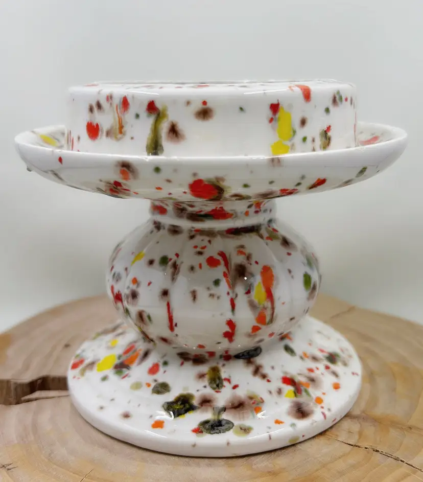 This vintage hobbyist ceramic candle holder has all the 70s vibes with burnt orange, avocado green, brown, and harvest gold speckled in cream glaze. It could hold a chunky pillar candle, a jar candle or a glass globe. Would be cute used as a base for a pumpkin too!
