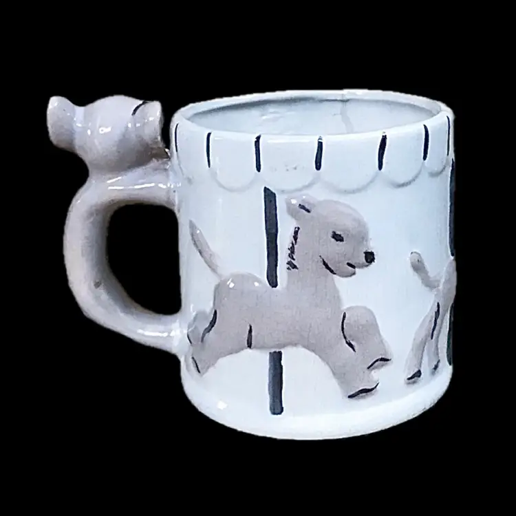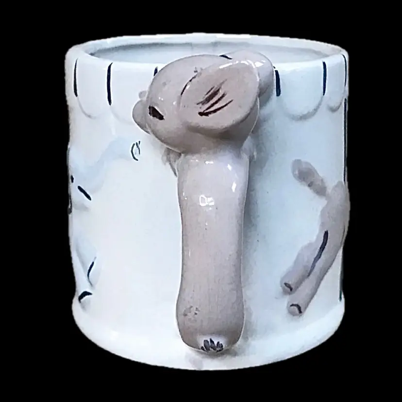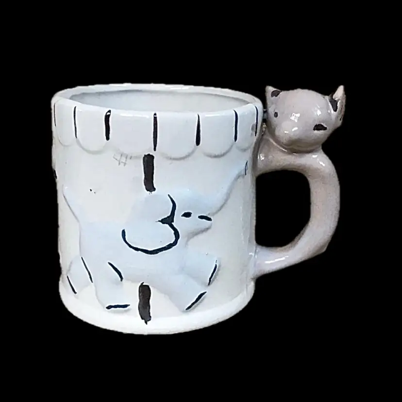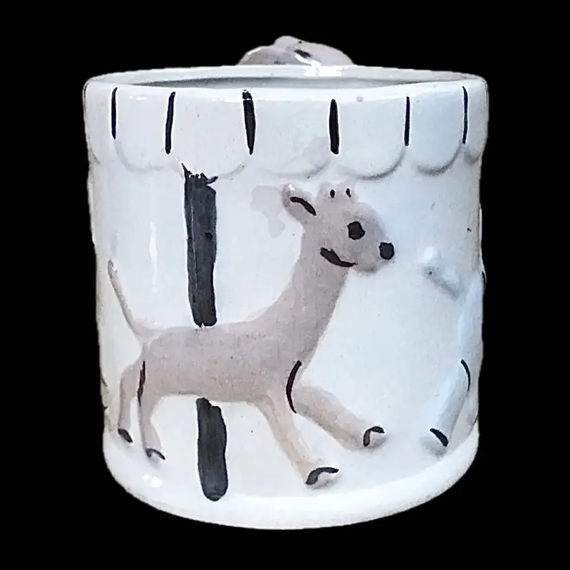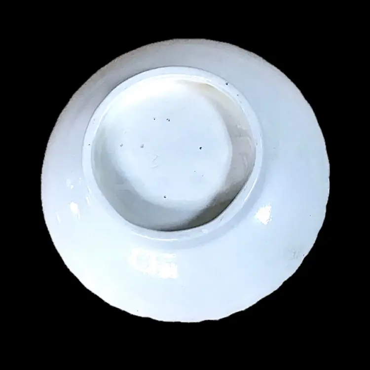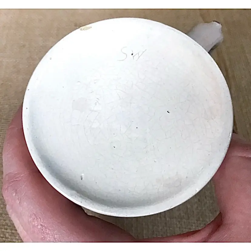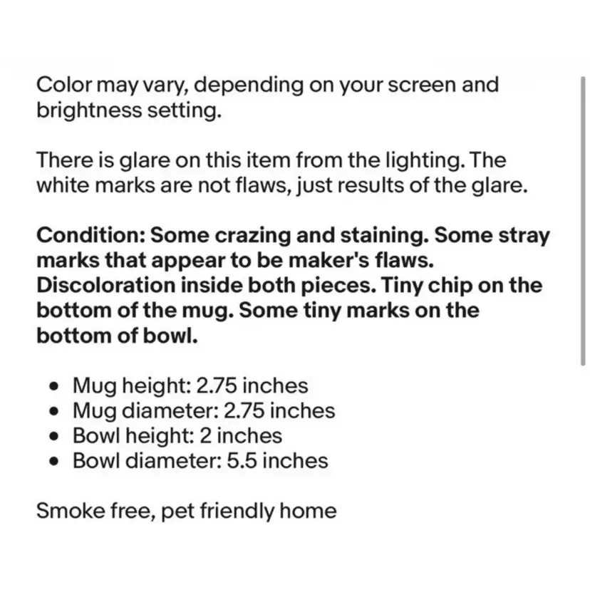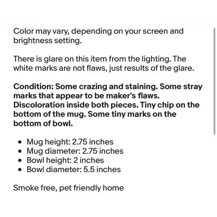 Condition: Some crazing and staining. Some stray marks that appear to be maker's flaws. Discoloration inside both pieces. Tiny chip on the bottom of the mug. Some tiny marks on the bottom of bowl.
