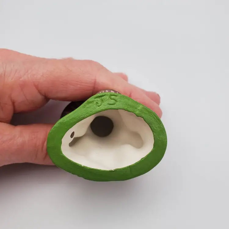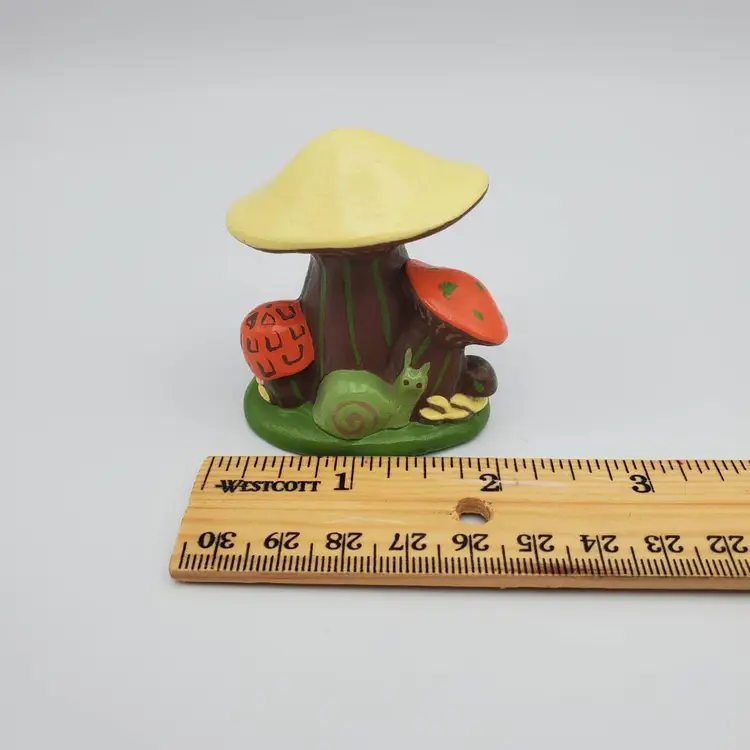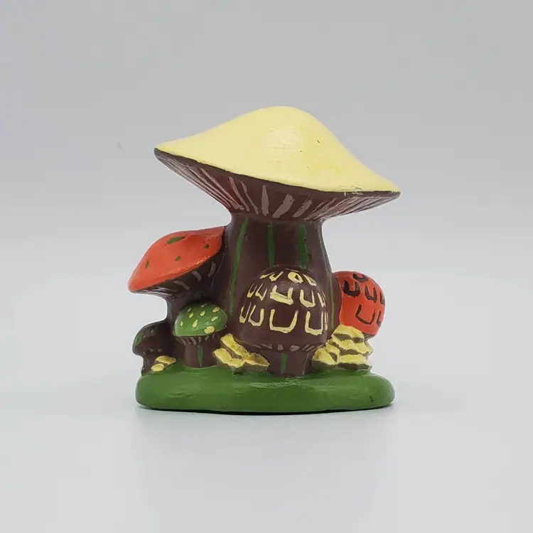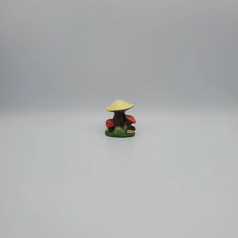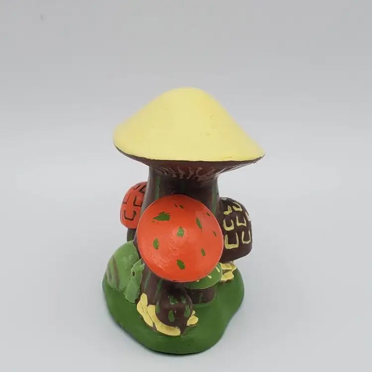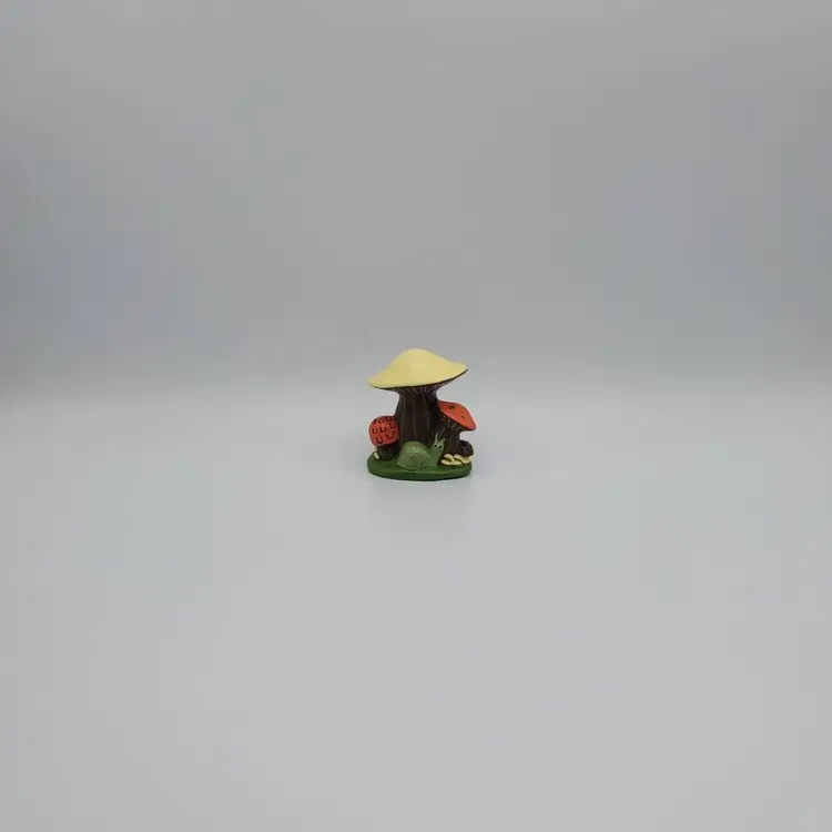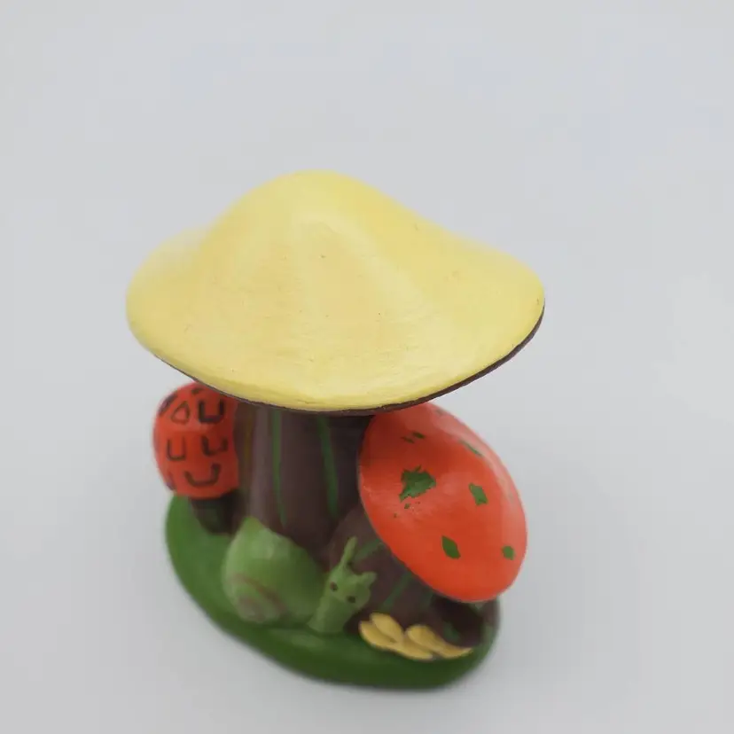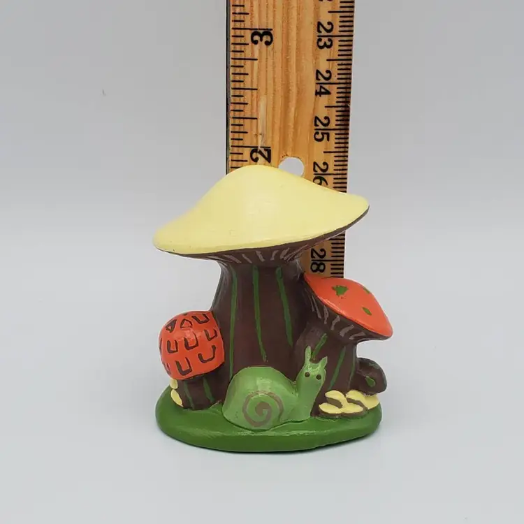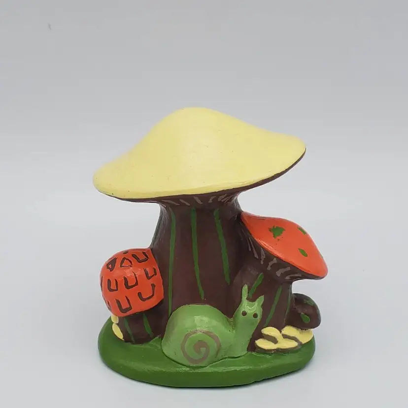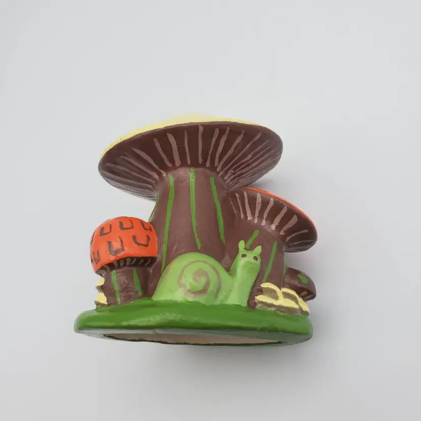 Small handmade ceramic vintage Mushroom figurine with a charming snail friend. Retro colors of orange, brown,green and pale yellow. It measure 2 in. tall and 2 in. wide and is signed by the creator J.S. It is very good vintage condition no chips, cracks or scratches.