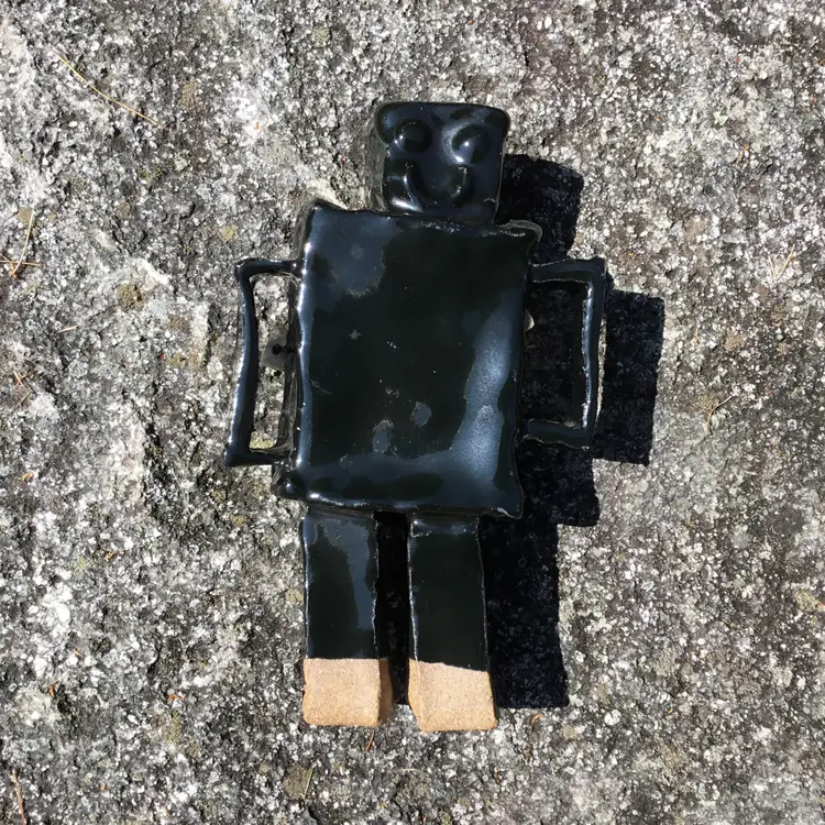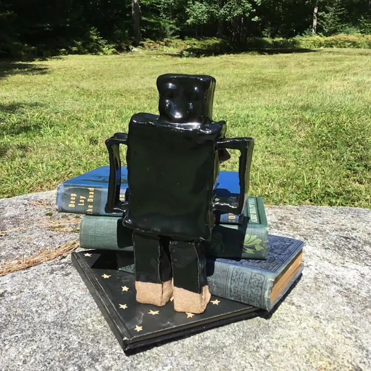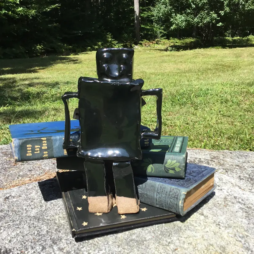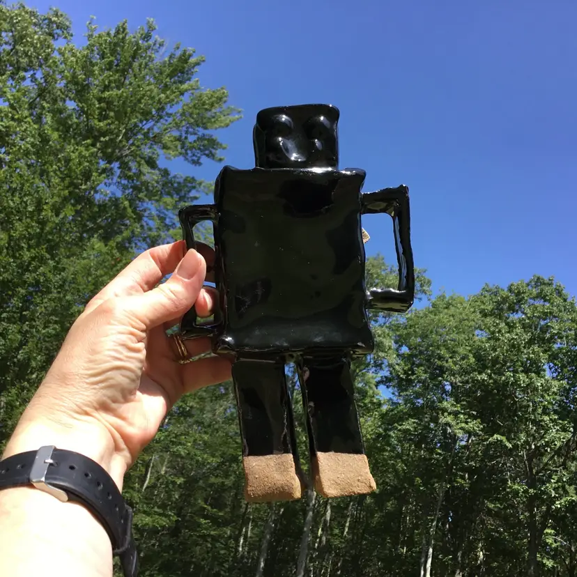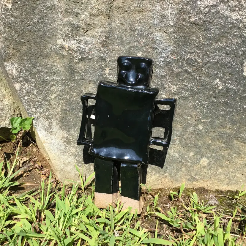 This is for a fantastically fun handmade studio art pottery figurine of a robot. Probably a student piece. It has a shiny black glaze other than the bottom of its two legs which are not glazed. This wonderful robot appears to have its kiln stilt attached onto its backside. Not sure if it was done on purpose or if it happened by chance during the kiln process? Due to this he does stand but is NOT steady on his feet and may need to be propped up by something in order to not fall over if bumped. There is pockets of space in spots between the robot itself & the kiln stilt where some type of hanging wire or something of the sort could be used to possibly hang if so choose although, keep in mind he is a little hefty in weight weighing 2 pounds 5 ounces on its own. Will not come with any type of hanging hardware.