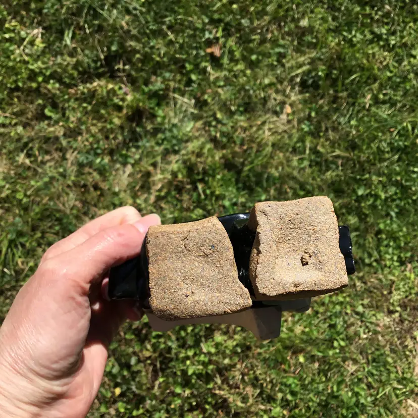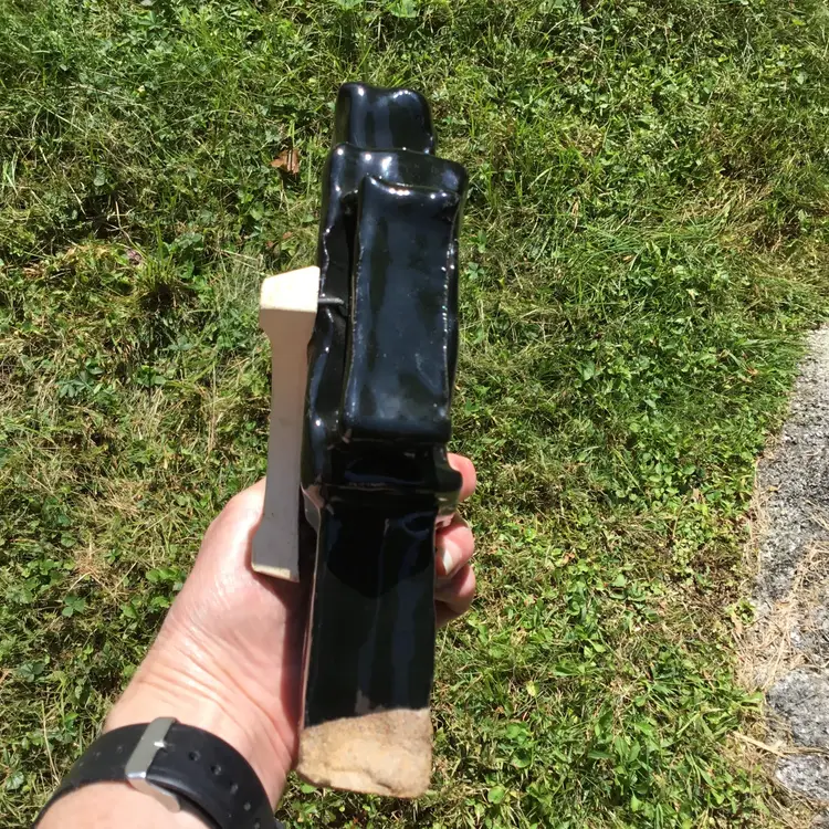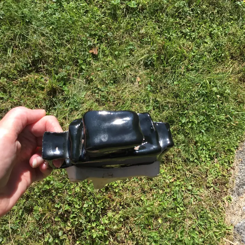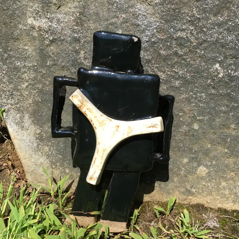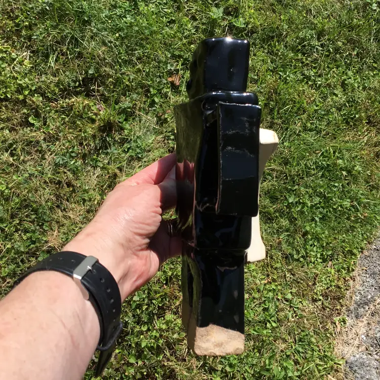 This is for a fantastically fun handmade studio art pottery figurine of a robot. Probably a student piece. It has a shiny black glaze other than the bottom of its two legs which are not glazed. This wonderful robot appears to have its kiln stilt attached onto its backside. Not sure if it was done on purpose or if it happened by chance during the kiln process? Due to this he does stand but is NOT steady on his feet and may need to be propped up by something in order to not fall over if bumped. There is pockets of space in spots between the robot itself & the kiln stilt where some type of hanging wire or something of the sort could be used to possibly hang if so choose although, keep in mind he is a little hefty in weight weighing 2 pounds 5 ounces on its own. Will not come with any type of hanging hardware.