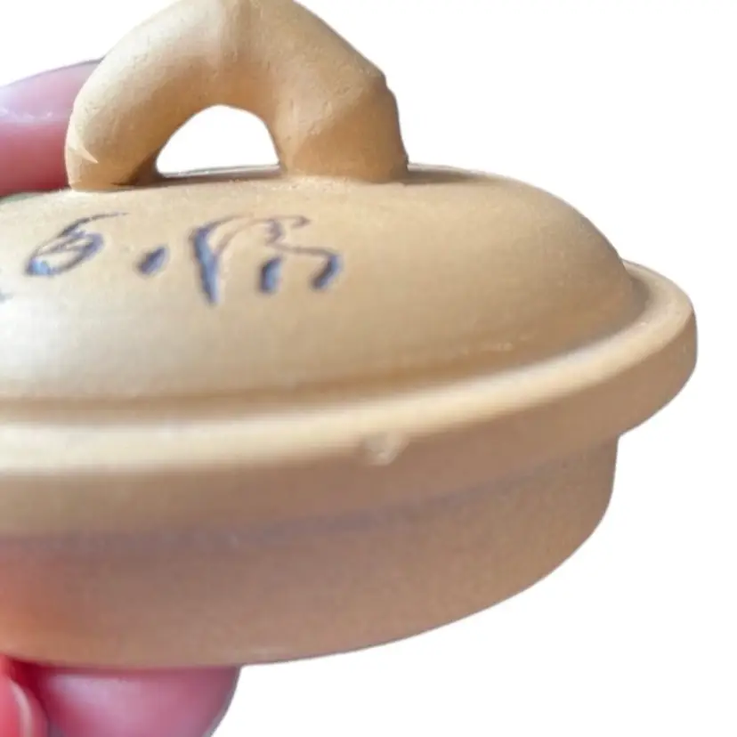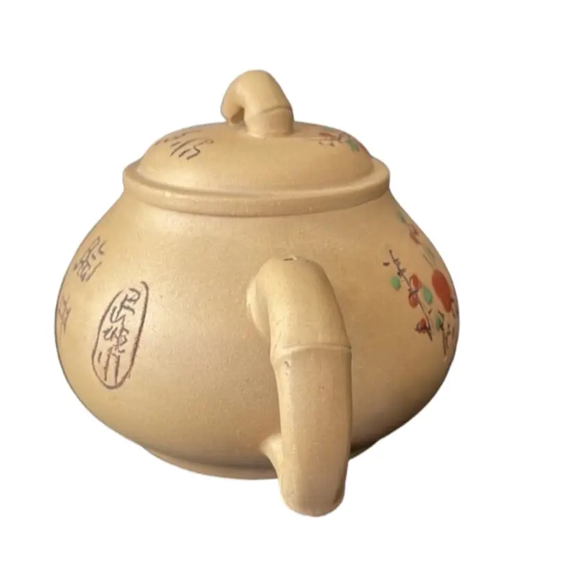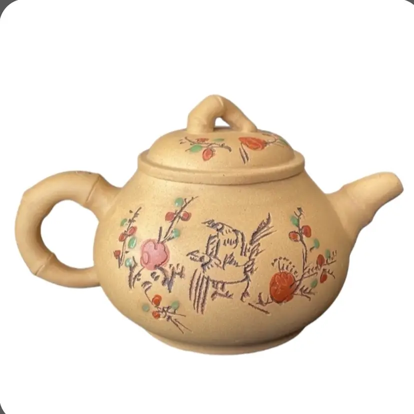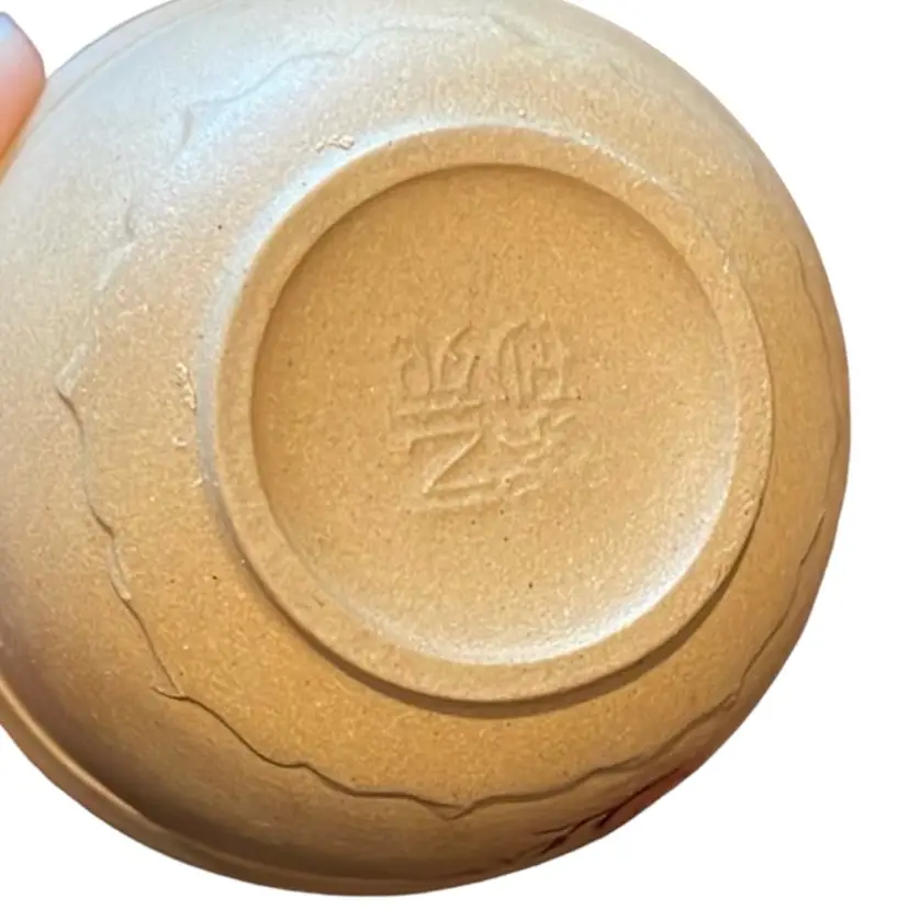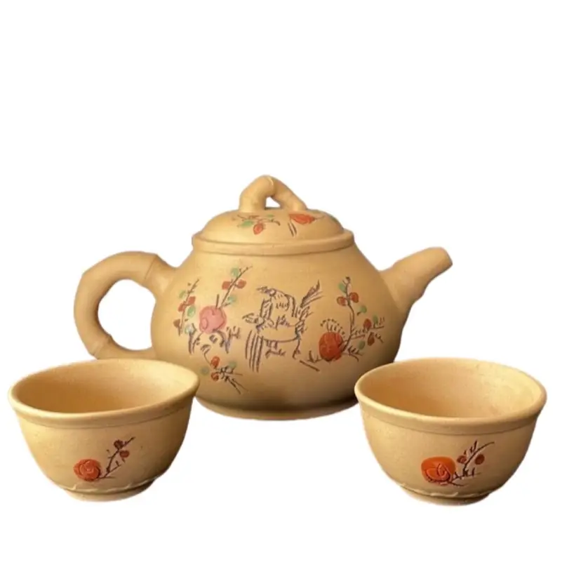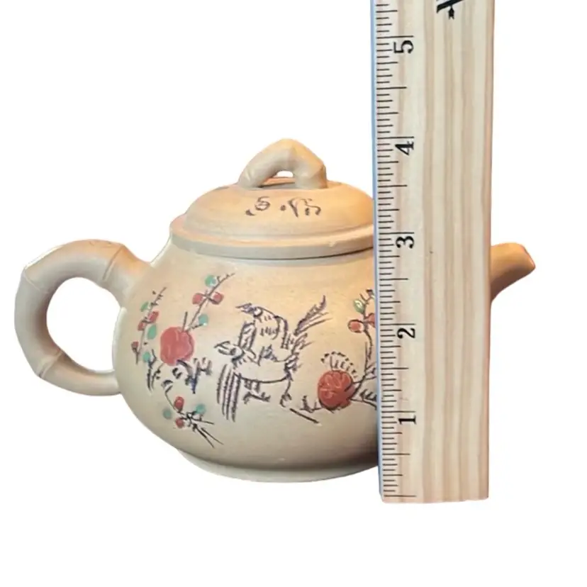 This is a vintage small handmade Yixing Zisha Clay singing teapot with two matching cups. One side has a bird and cherry blossoms, and the other has script. Both cups have a cherry blossom on one side. Teapot measures 6.5” long from spout to handle, and is 4” tall from lid handle to base. Both cups measure approximately 1.75" tall x 2.25" across. There are a couple of chips on lid as shown in pictures.