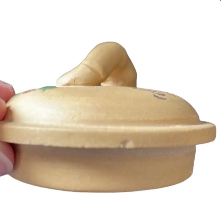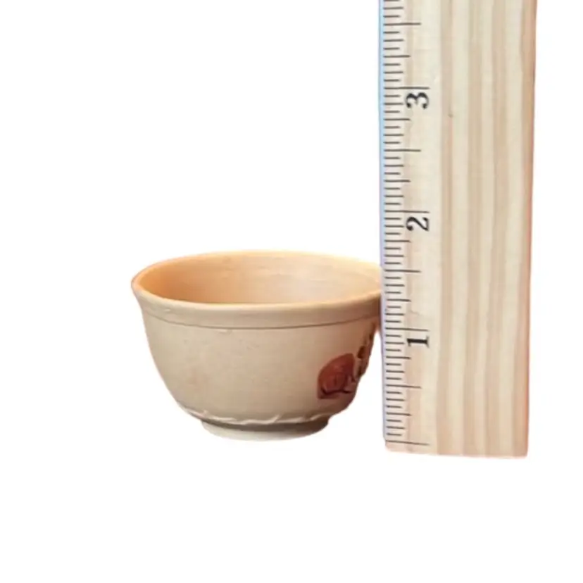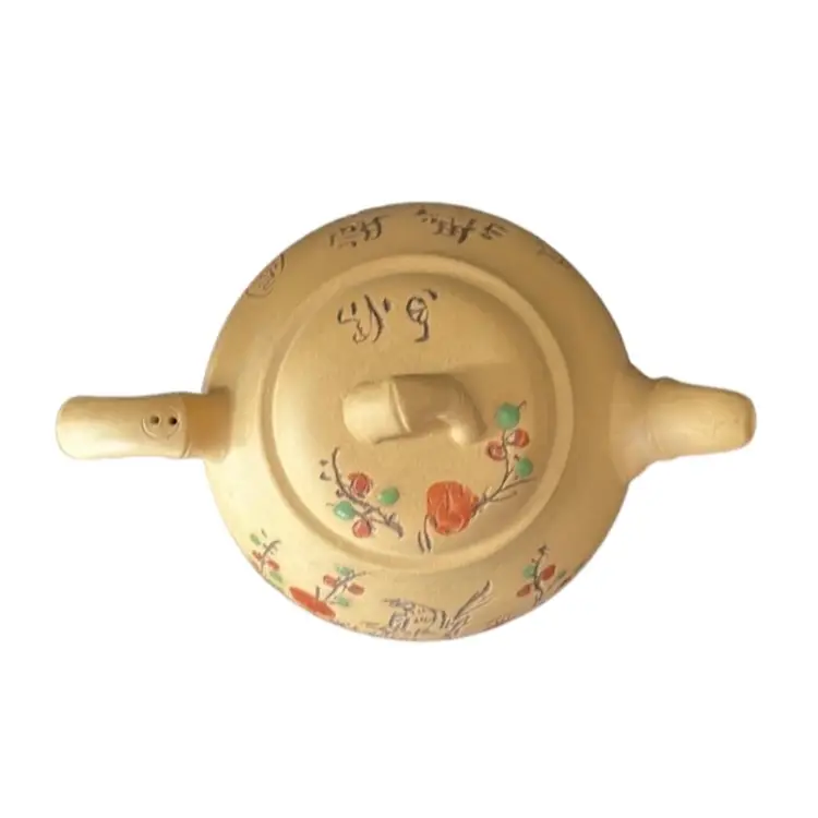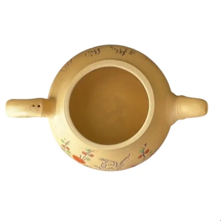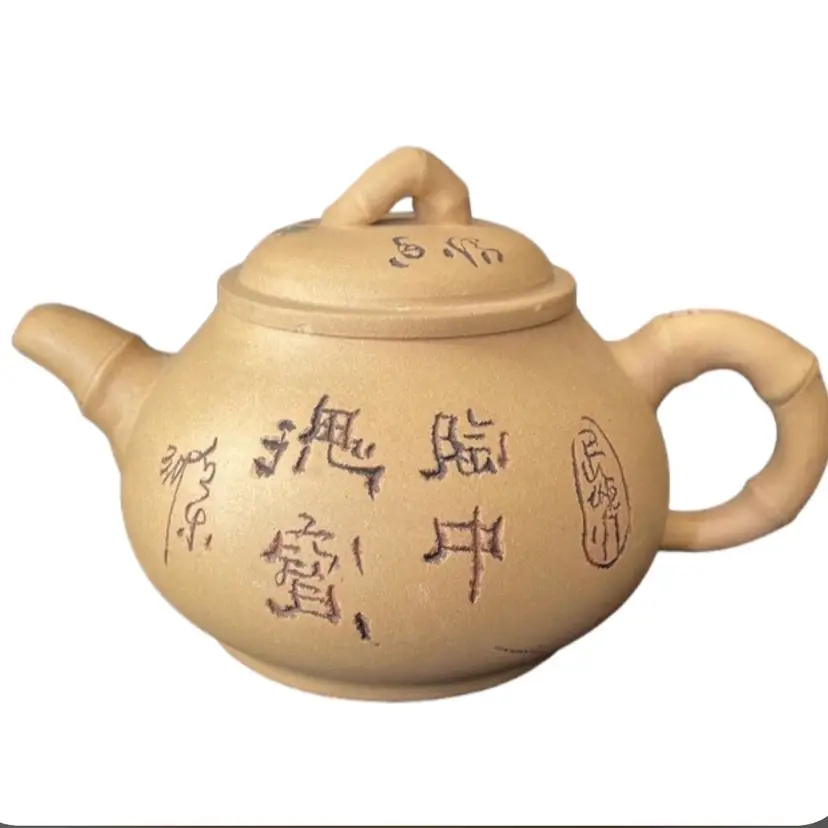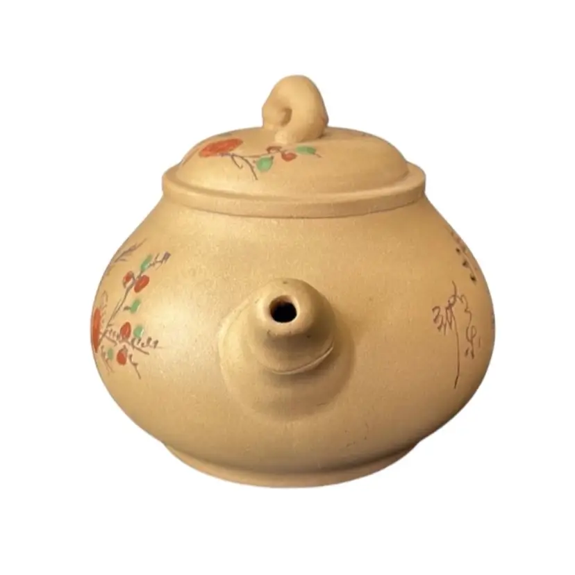 This is a vintage small handmade Yixing Zisha Clay singing teapot with two matching cups. One side has a bird and cherry blossoms, and the other has script. Both cups have a cherry blossom on one side. Teapot measures 6.5” long from spout to handle, and is 4” tall from lid handle to base. Both cups measure approximately 1.75" tall x 2.25" across. There are a couple of chips on lid as shown in pictures.
