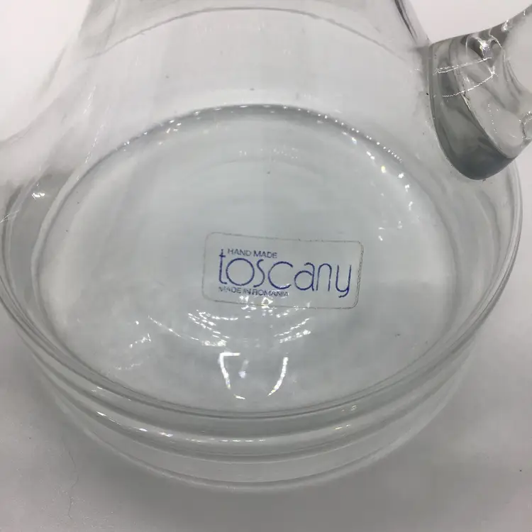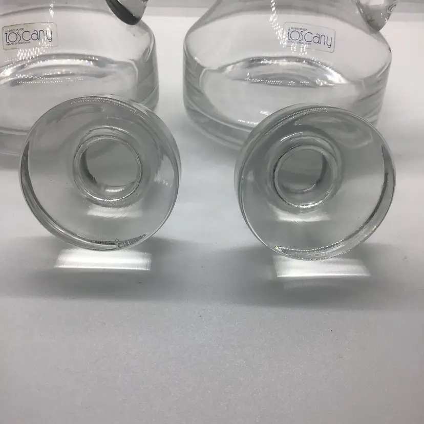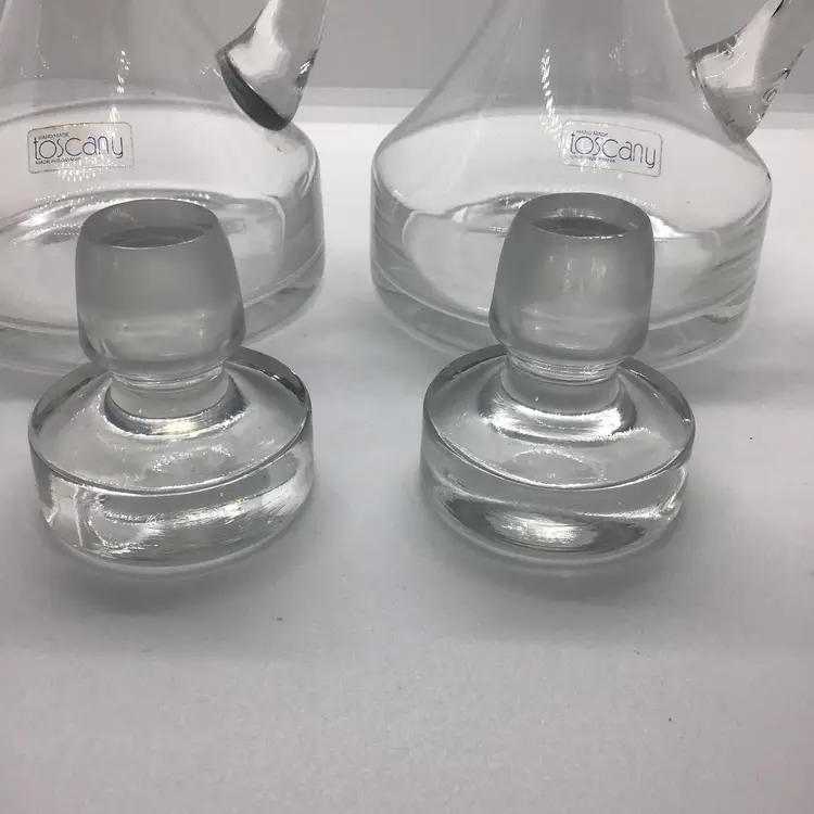 Vintage Handmade Clear Glass Oil And Vinegar Decanter. Toscany Romania Cruet. I have owned these for years. Glass set with lids. One super tiny “flea bite” on one of the lids. Otherwise in excellent condition. Comes from a non smoking home.
