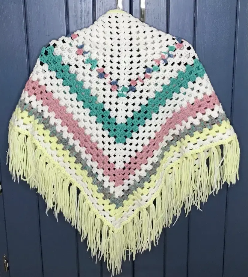 White, green, yellow, pink, with some marbled yarn and some metallic threads. Fringe trim. Great boho and hippie vibes. Condition: A lot of fuzz from wash and wear. Some of the metallic threads are splitting or frayed. Minor fray on the ends of some of the the fringe pieces.