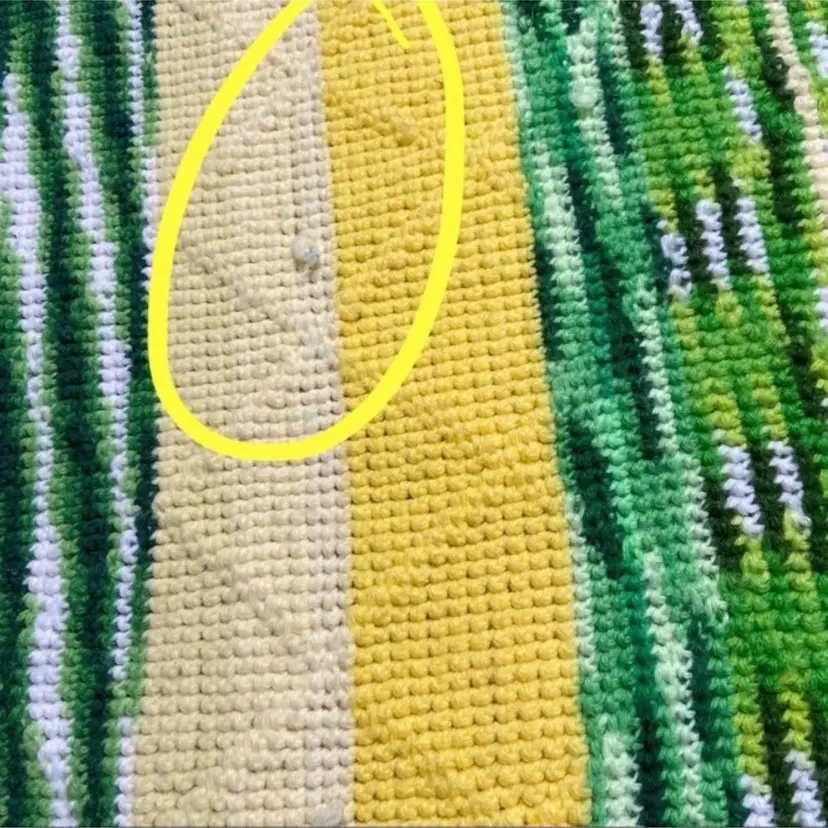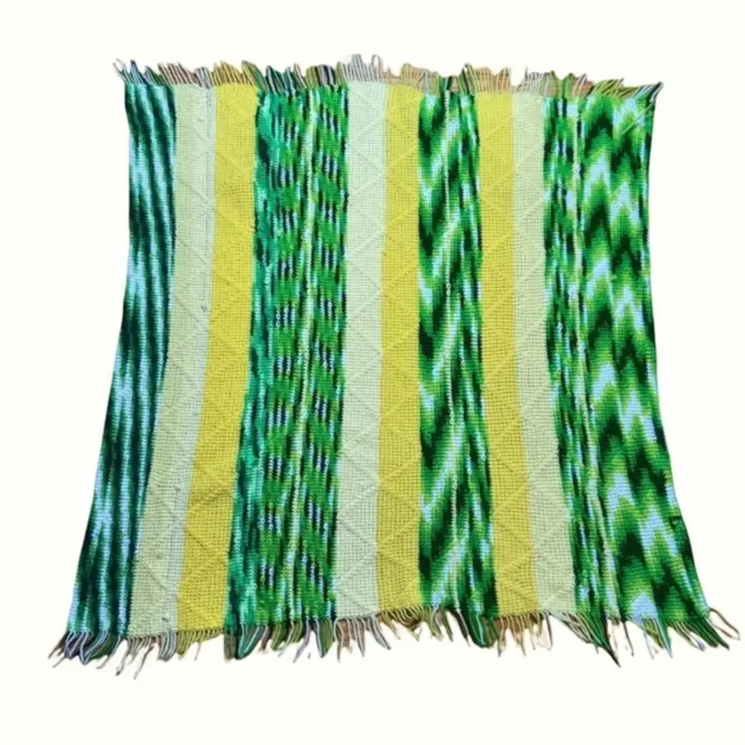 Vintage Handmade Crocheted Yellow, Green & White Striped Blanket With Fringe. A smaller Afghan, maybe for a child’s bed, to throw on the back of a chair or a lap blanket. There is a darkened spot at the top right corner but otherwise in good used vintage condition. You can tell it’s handmade due to the finished ends tied together underneath. Has a Diamond pattern crocheted in. Note: this blanket is handmade so it may not be perfect.