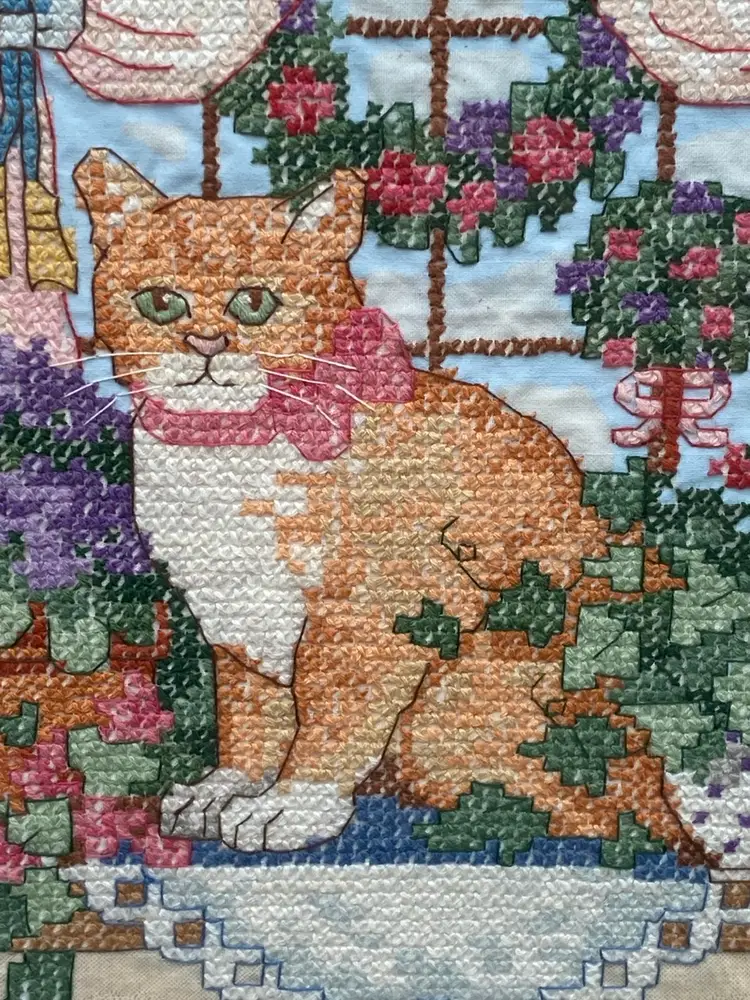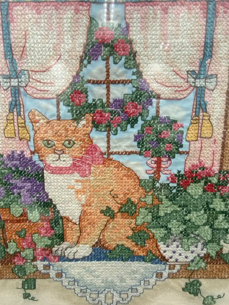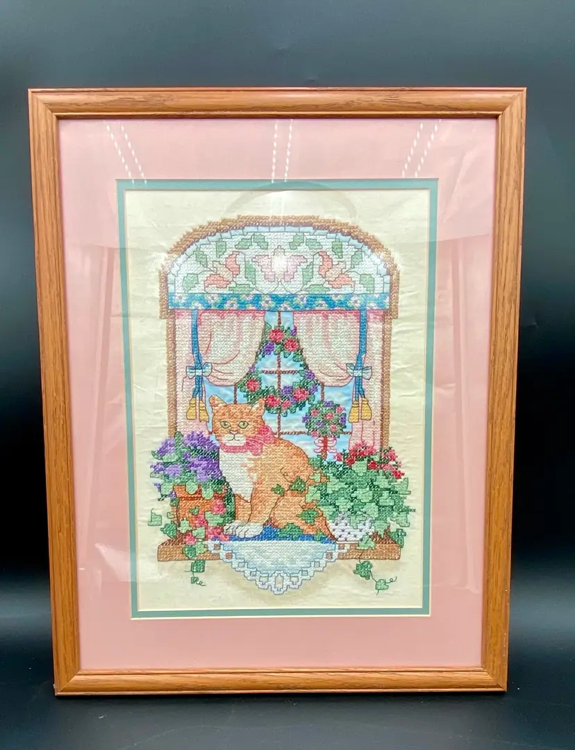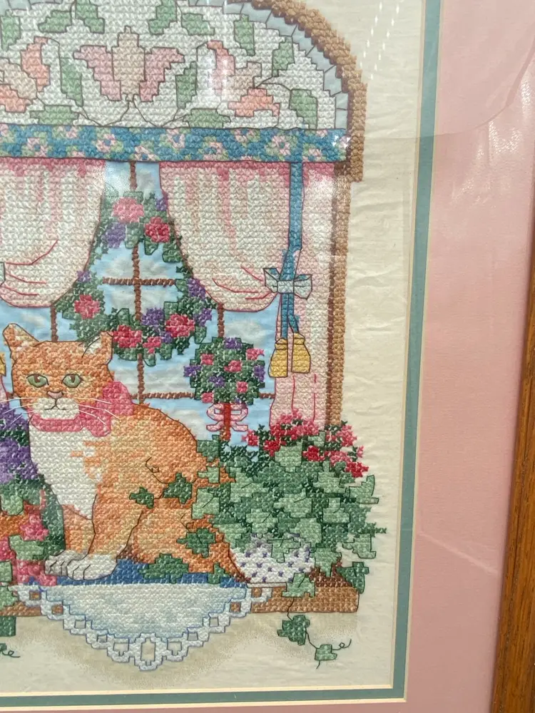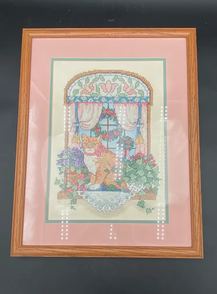 This vintage Sunset counted cross stitch art features a charming ginger tabby cat sitting on a windowsill. The piece comes professionally framed and double-matted, adding an extra touch of elegance to any room. The brand of the kit was Sunset and was made in the United States. This counted cross stitch art is perfect for someone who loves cats and would make a great addition to any collection.
