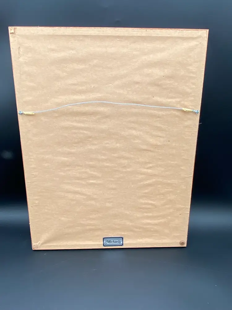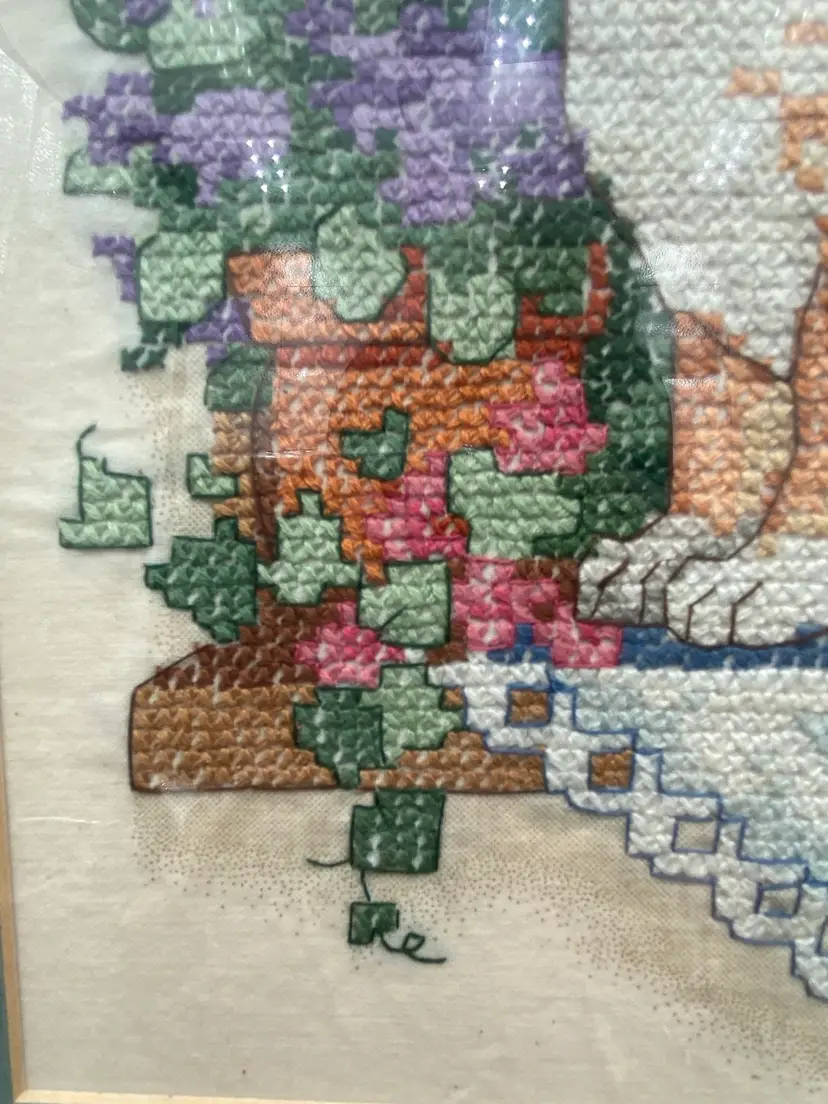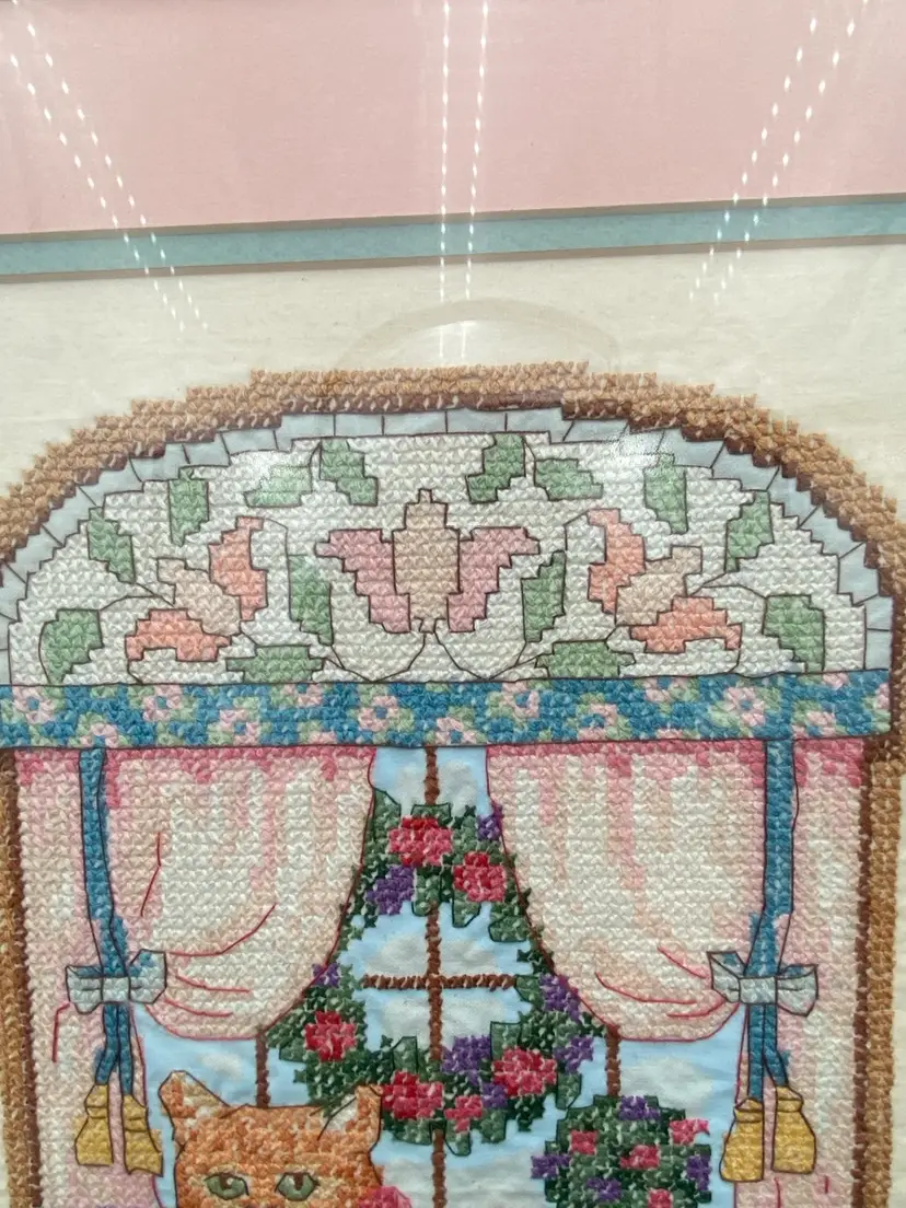 The cross stitch has been completed flawlessly and is in excellent condition. The double matting, glass and frame are all in excellent condition except for a little wear on the back of the frame (see picture).