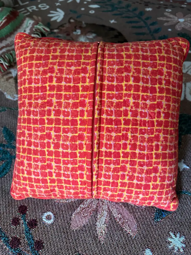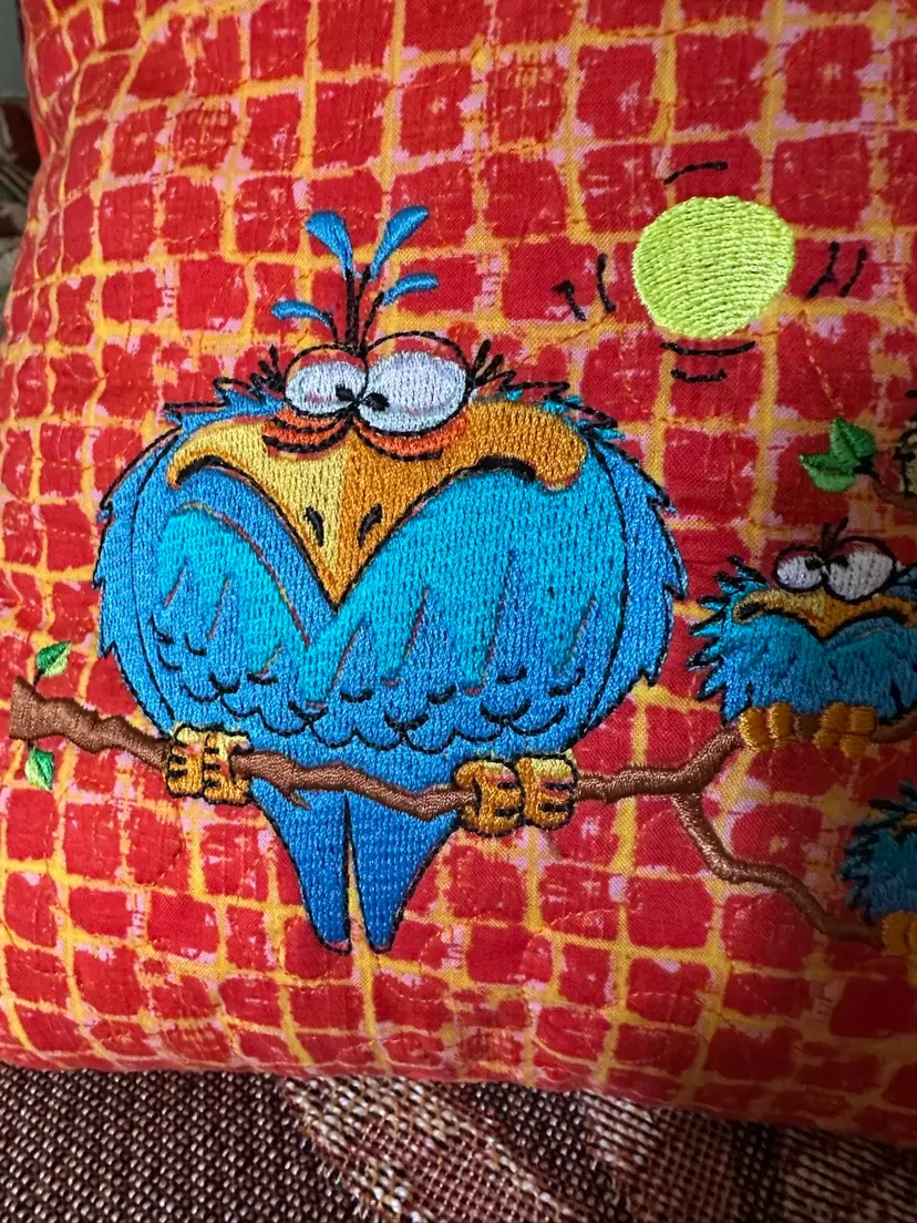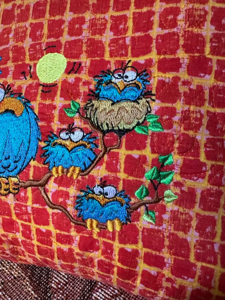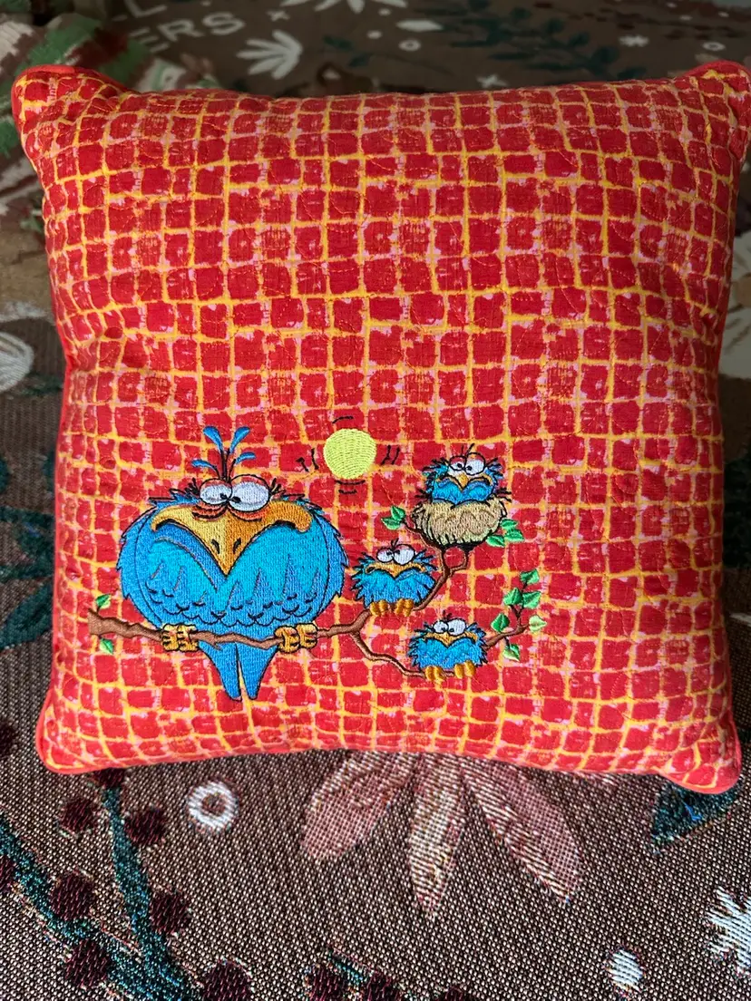 Vintage Handmade Embroidered Kitschy Bluebird & Chicks in a Tree Pillow