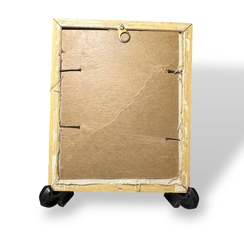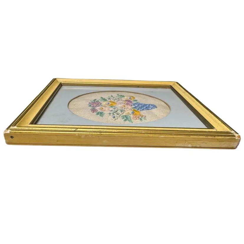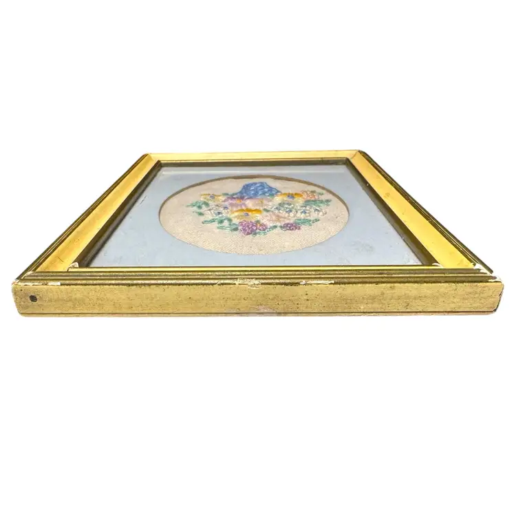 Vintage items will likely show signs of age and use. This is part of their vintage charm. I have not attempted to remove the backing to do any cleaning. The embroidery is in great intact condition. Frame shows some wear and damage especially to the corners.