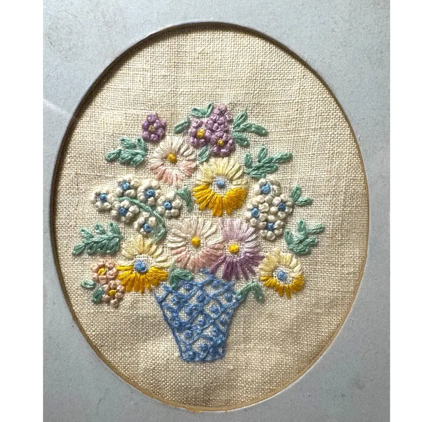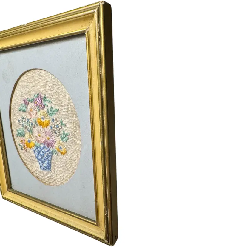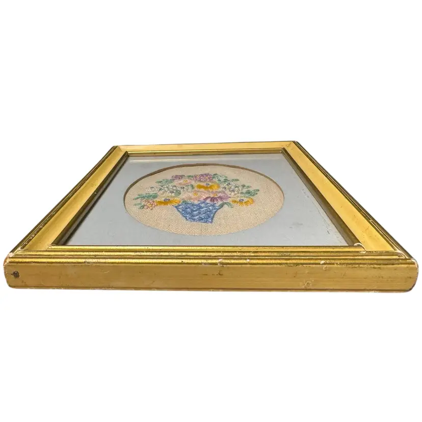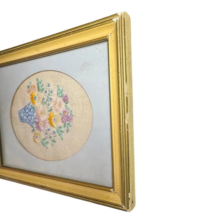 Vintage Framed Embroidery- Flower Bouquet in a vase