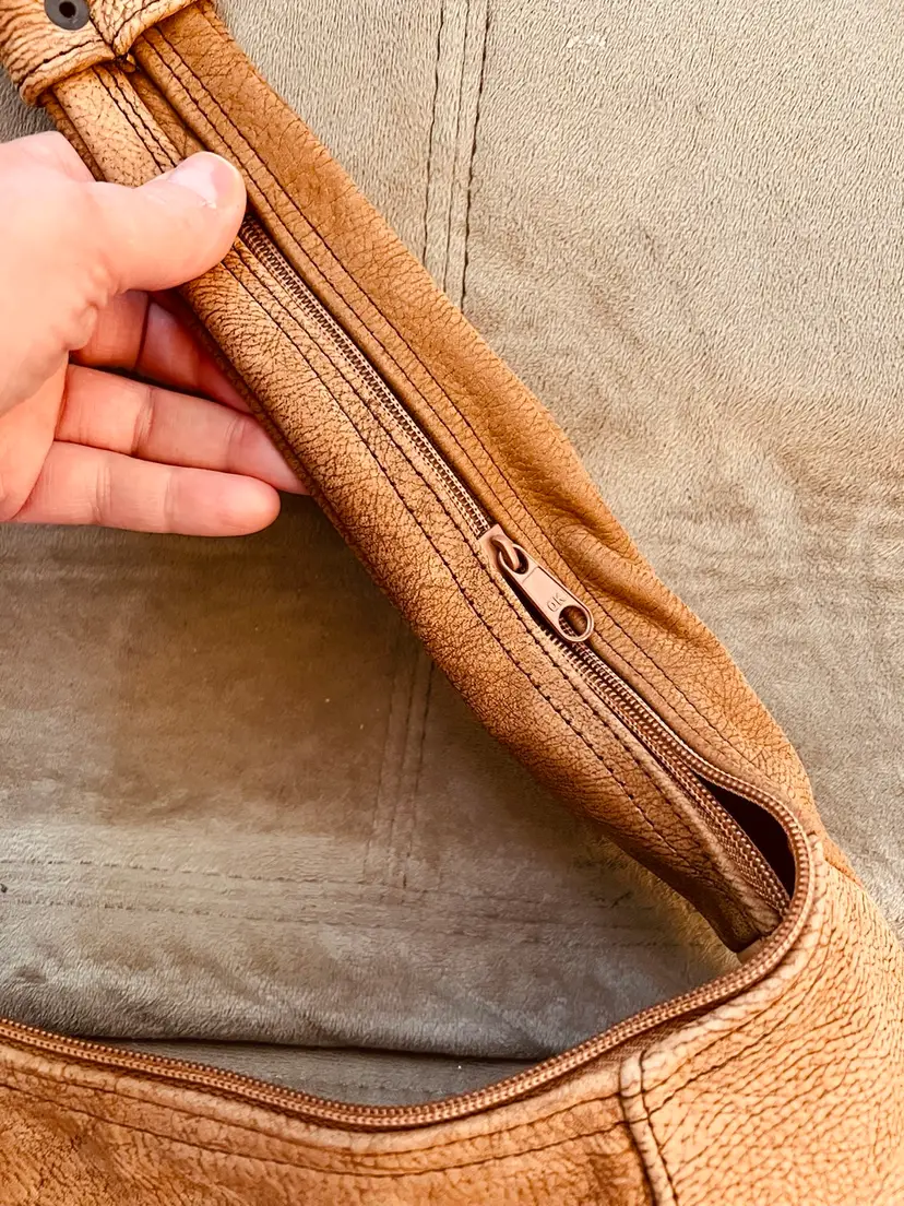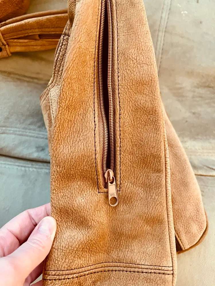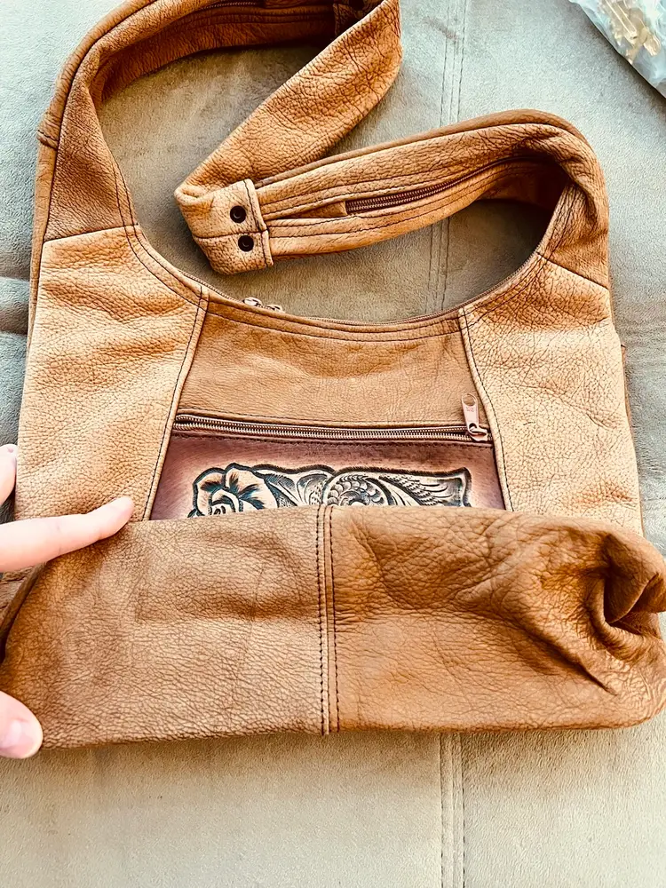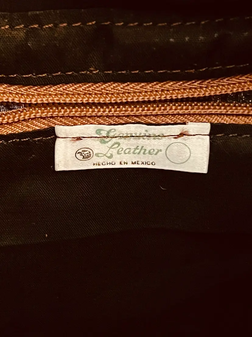 OMG!! All zippers work. Two outside zipper pockets. One zipper pocket on exterior side. Opposite side has open pocket. Zipper interior pocket. Made in Mexico/Genuine Leather stitched label in excellent condition inside.
