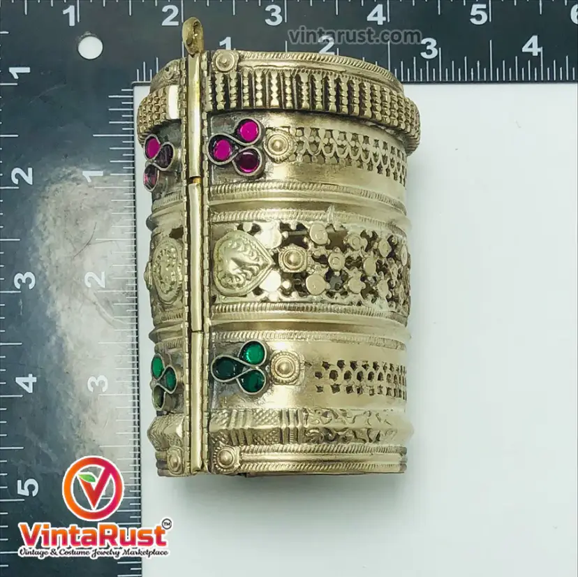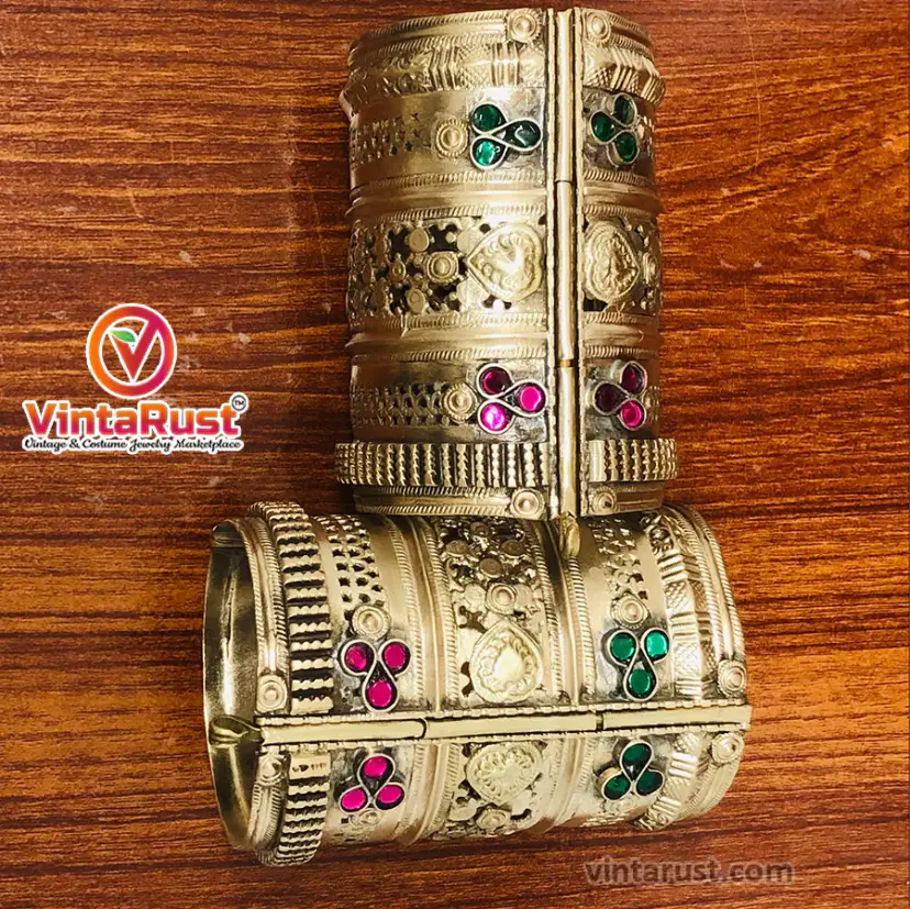 • This heavily embellished ornament is a vintage handcuff, crafted by the local artisans of South Asia. The exclusive design is inspired by the tribal style of jewelry. The vibrant multicolor stones embedded along with the fine and delicate engraved motifs is flaunting all the traditional and classical vibes. The timeless ornament is a tantalizing handmade bracelet is made with fine quality metal and easily adjustable with smooth inner side.