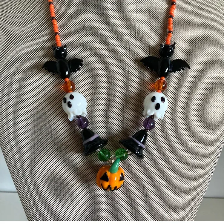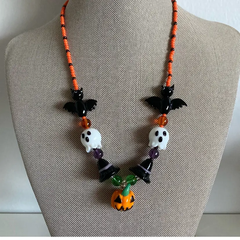 Vintage handmade Halloween glass beaded neckkace. Each lampwork glass ghost, bat and pumpkin are all slightly different since tgey are hand created. The necklace measure 19” long. This is an upcycled creation using vintage beads and findings.