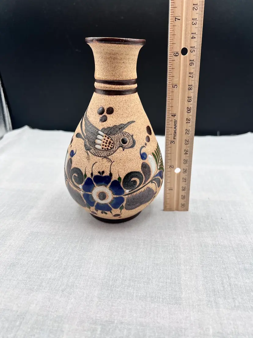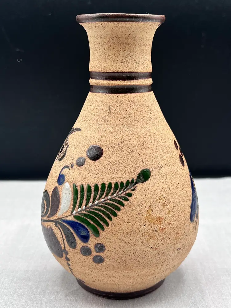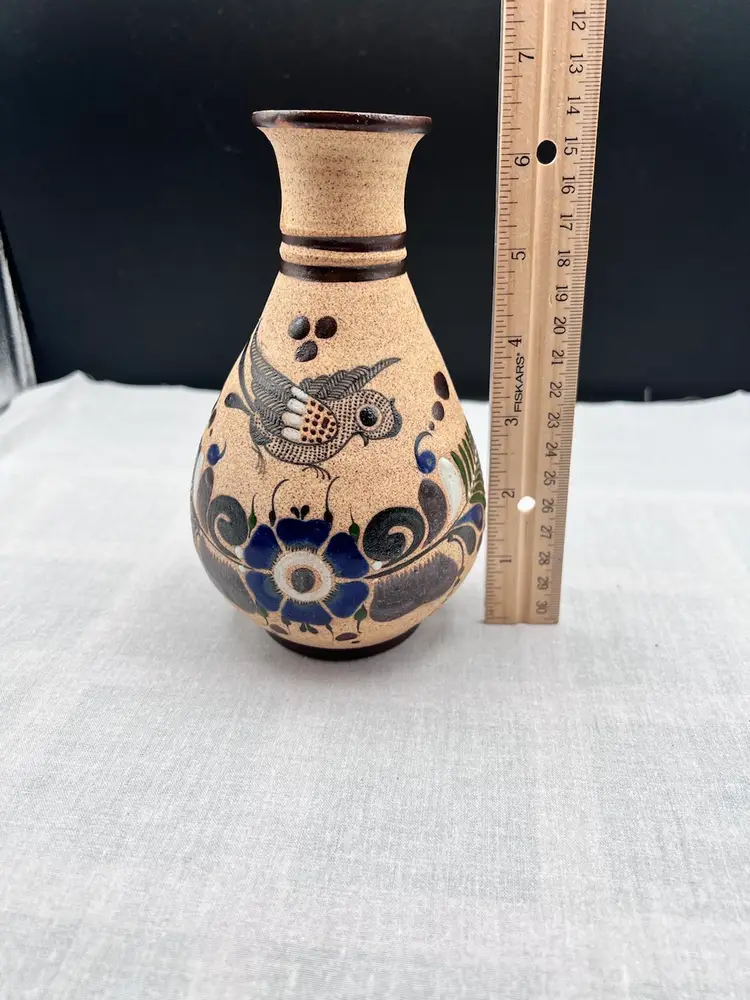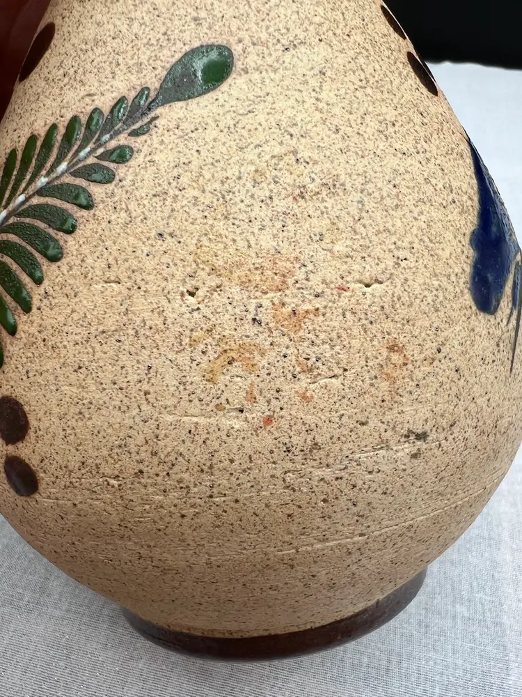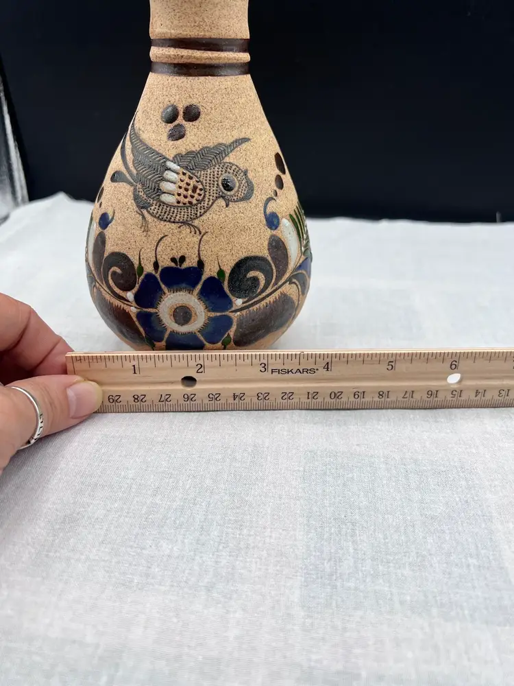 Beautiful vintage handmade Mexican clay vase with bird and floral designs in browns, blue, green and white.