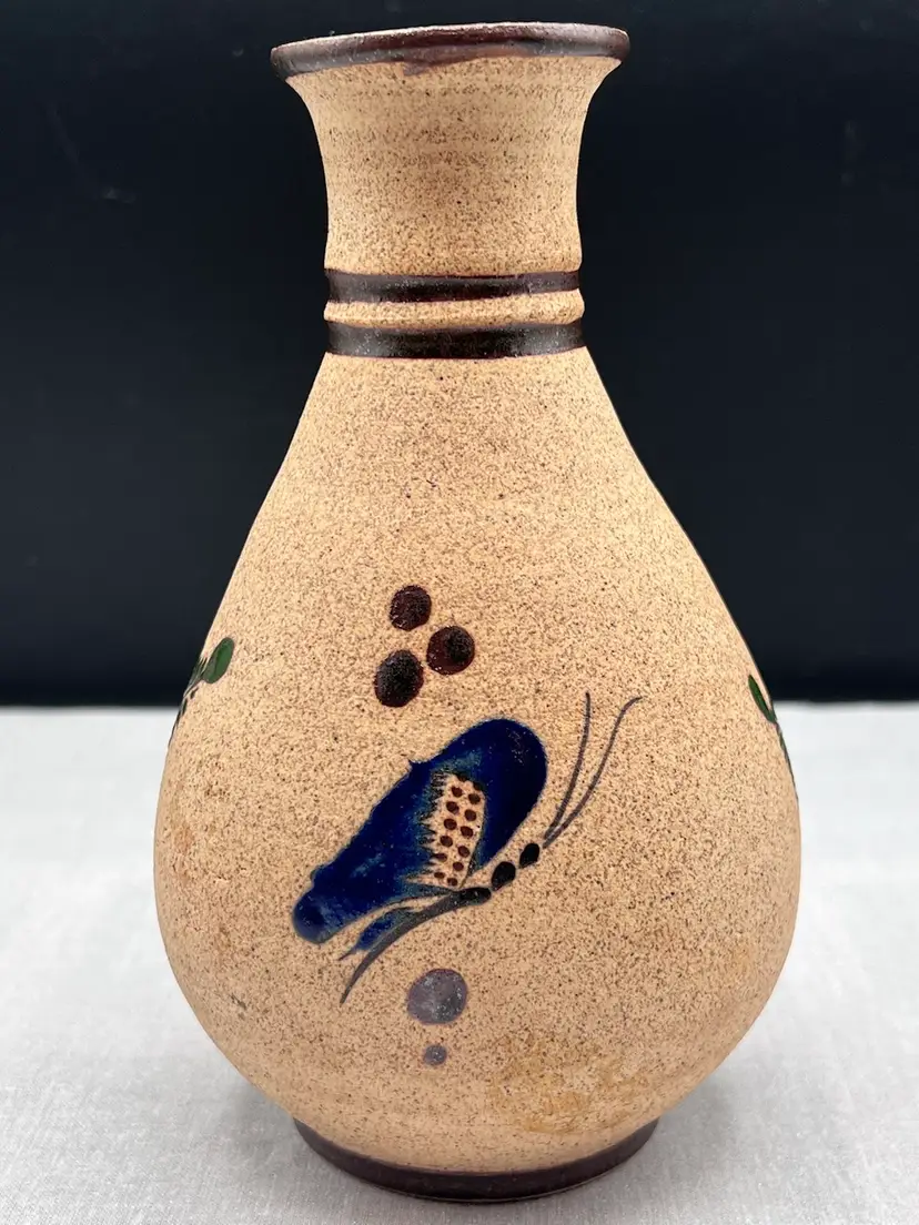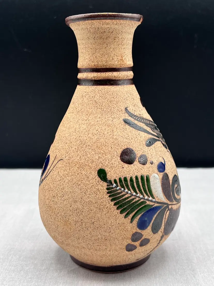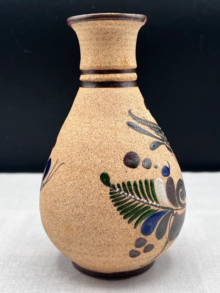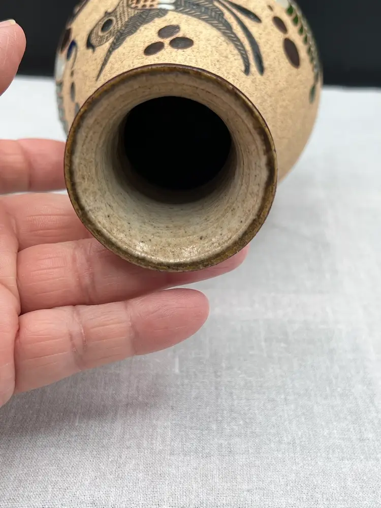 Beautiful vintage handmade Mexican clay vase with bird and floral designs in browns, blue, green and white.