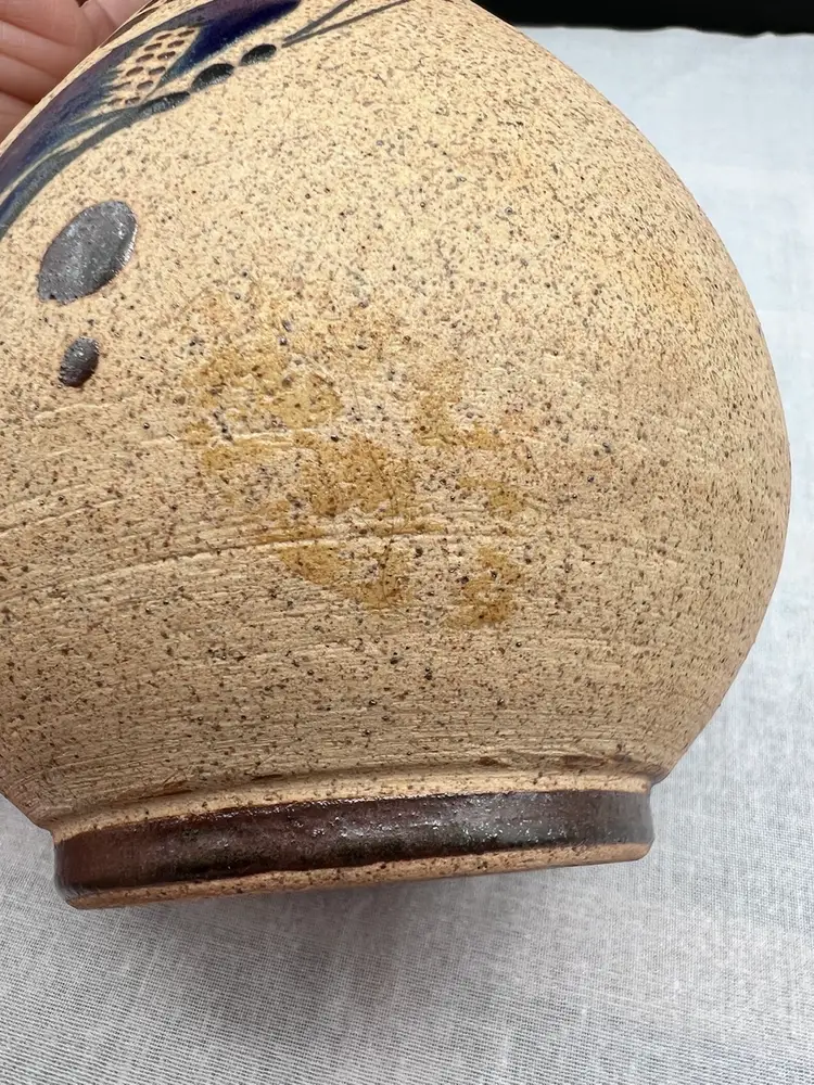 The vase is in very good condition, there are no chips or cracks. There are two spots that are discolored/stained them. Barely noticeable due to the nature and color of the clay