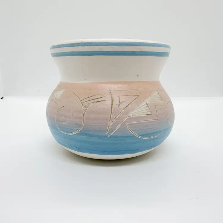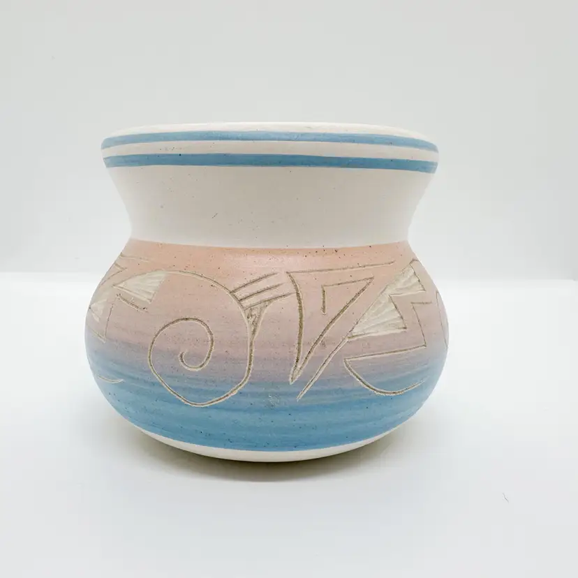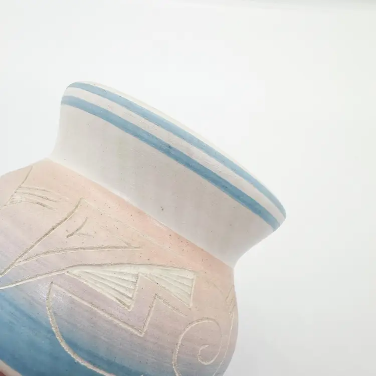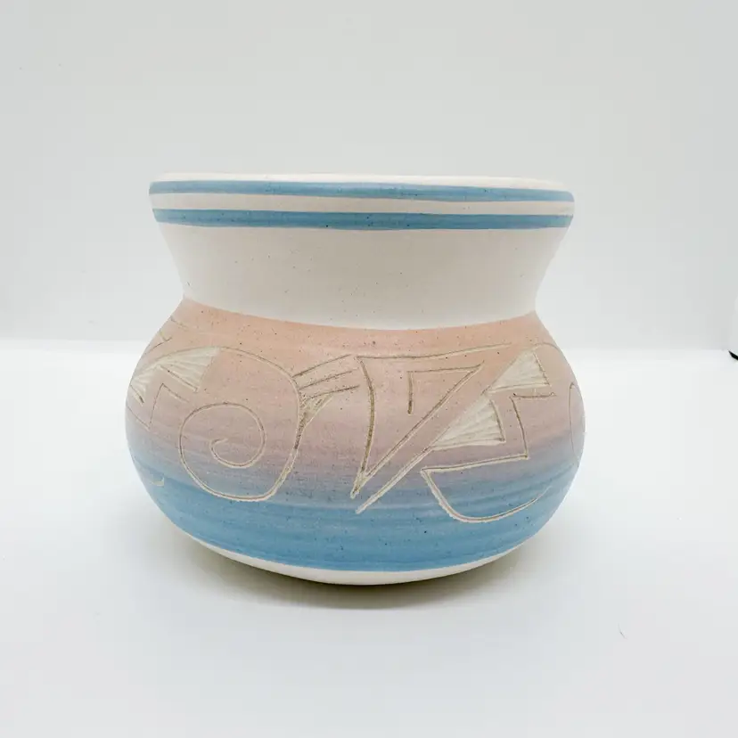 Vintage Hand Painted Native American Pot/Planter, signed by artist. Base color is a white with a gradient from pink to purple to blue. Painted and etched by hand. About 3.5" x 3.5". No chips or cracks. General wear for age, more wear on bottom.