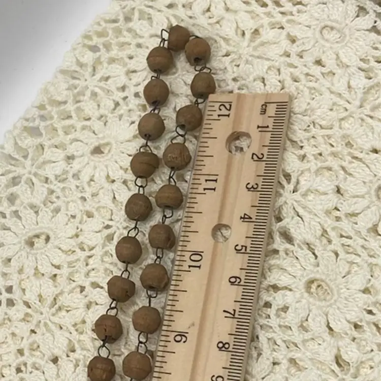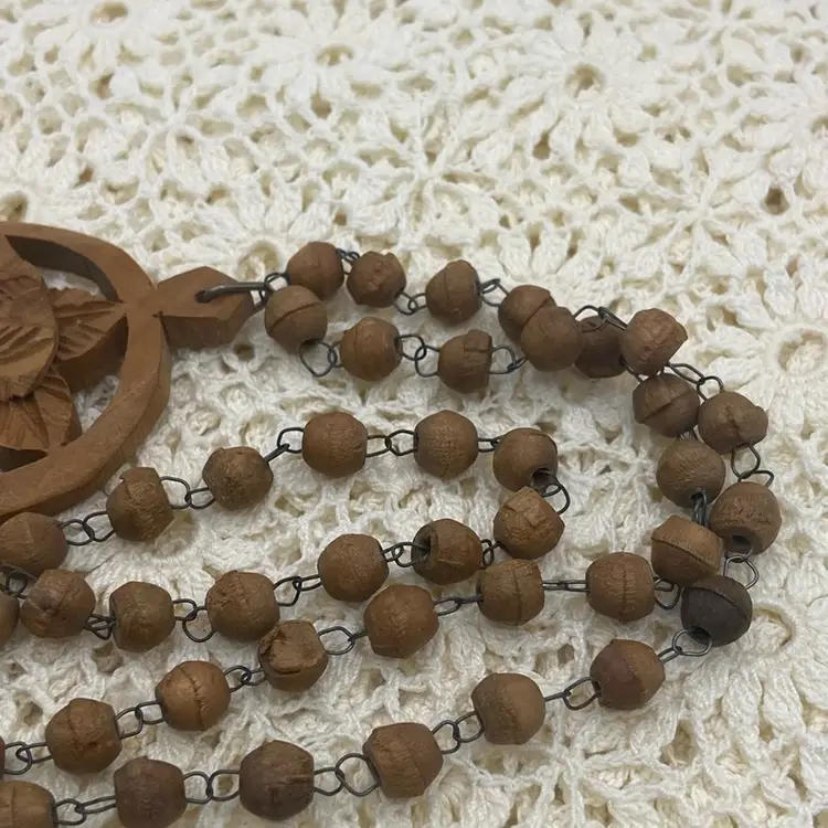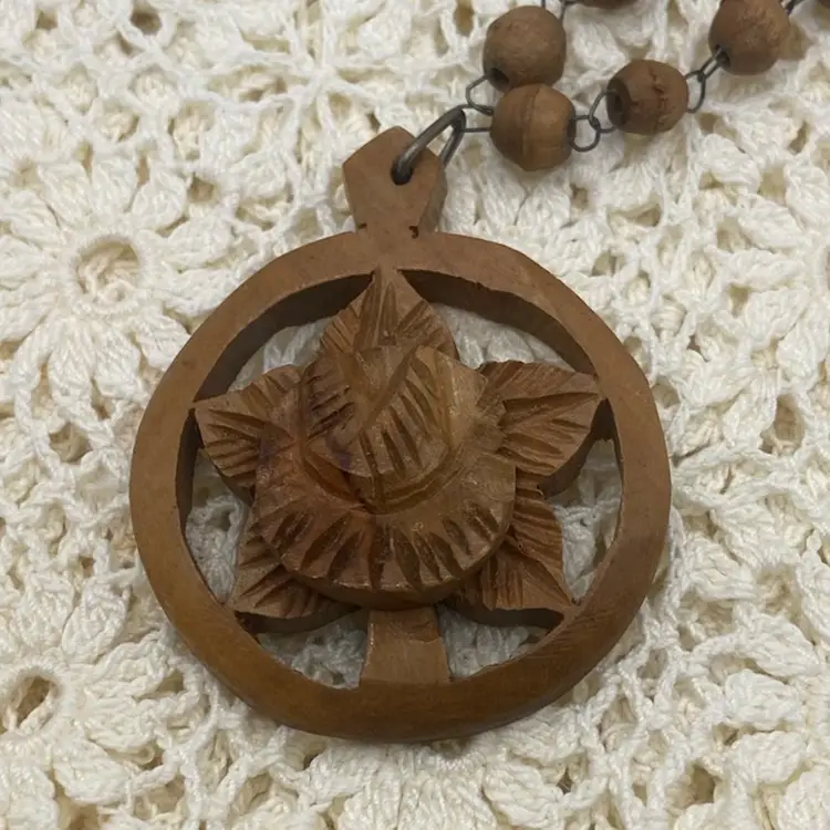 This is a hand carved olive wood necklace with individual beads connected to make a strand over 12” long. It’s a 3D floral design pendant. Made in the holy land.