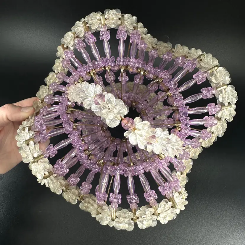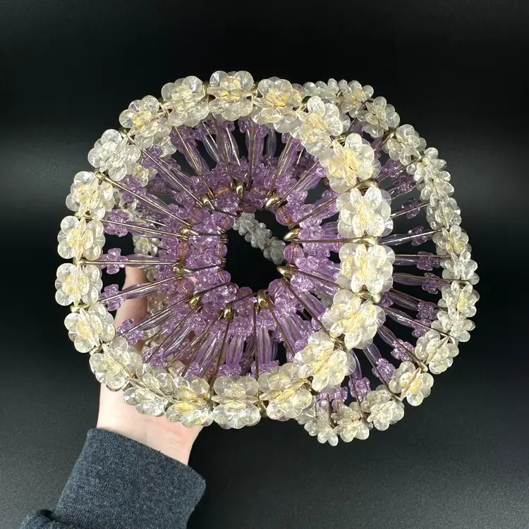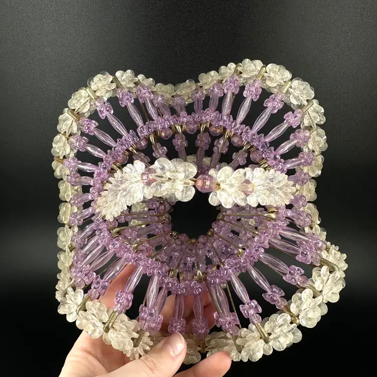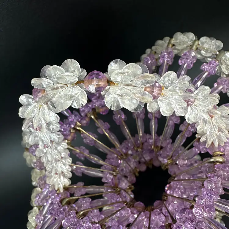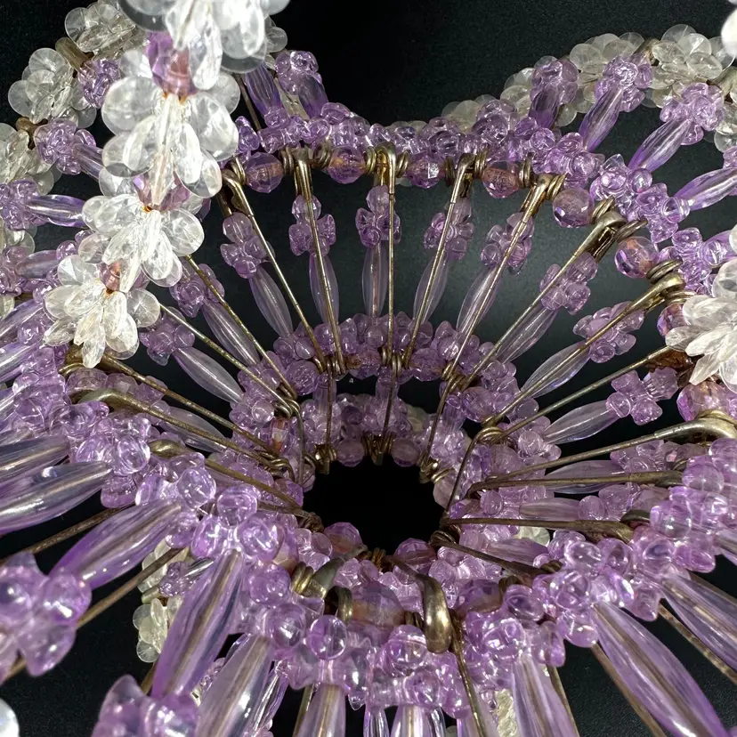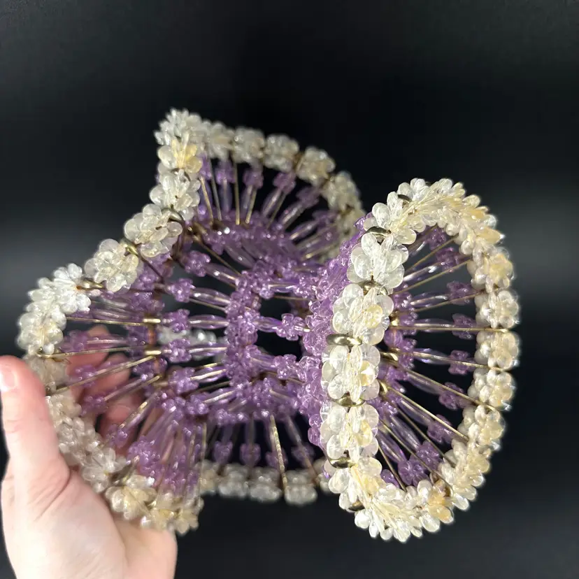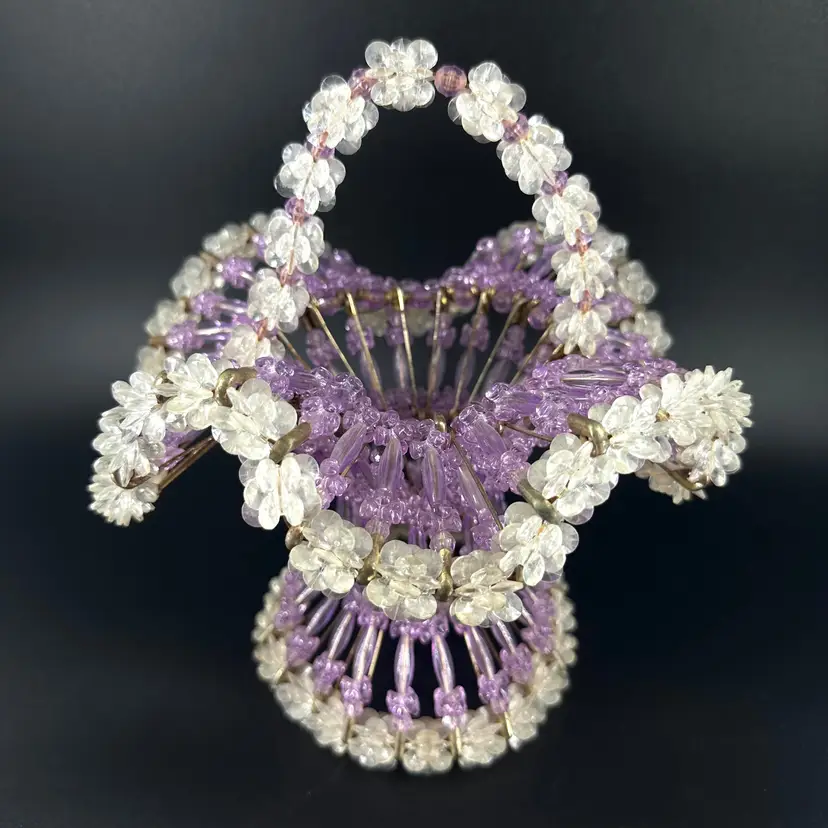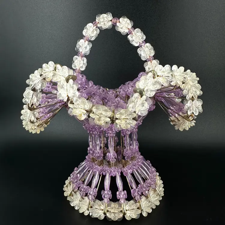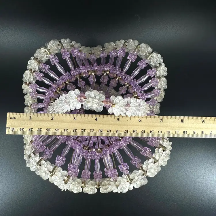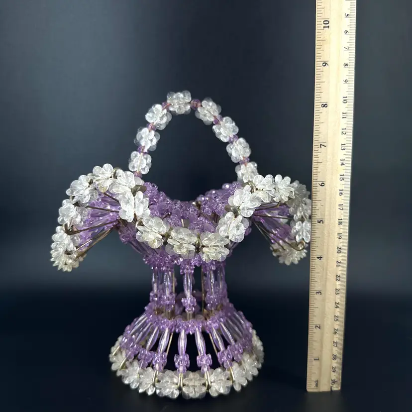 This Vintage Handmade Purple Safety Pin Beaded Basket does have some oxidation on the safety pins. there are no chips or cracks on the beads. Height is approximately 8" 1/2". Is not signed or marked.