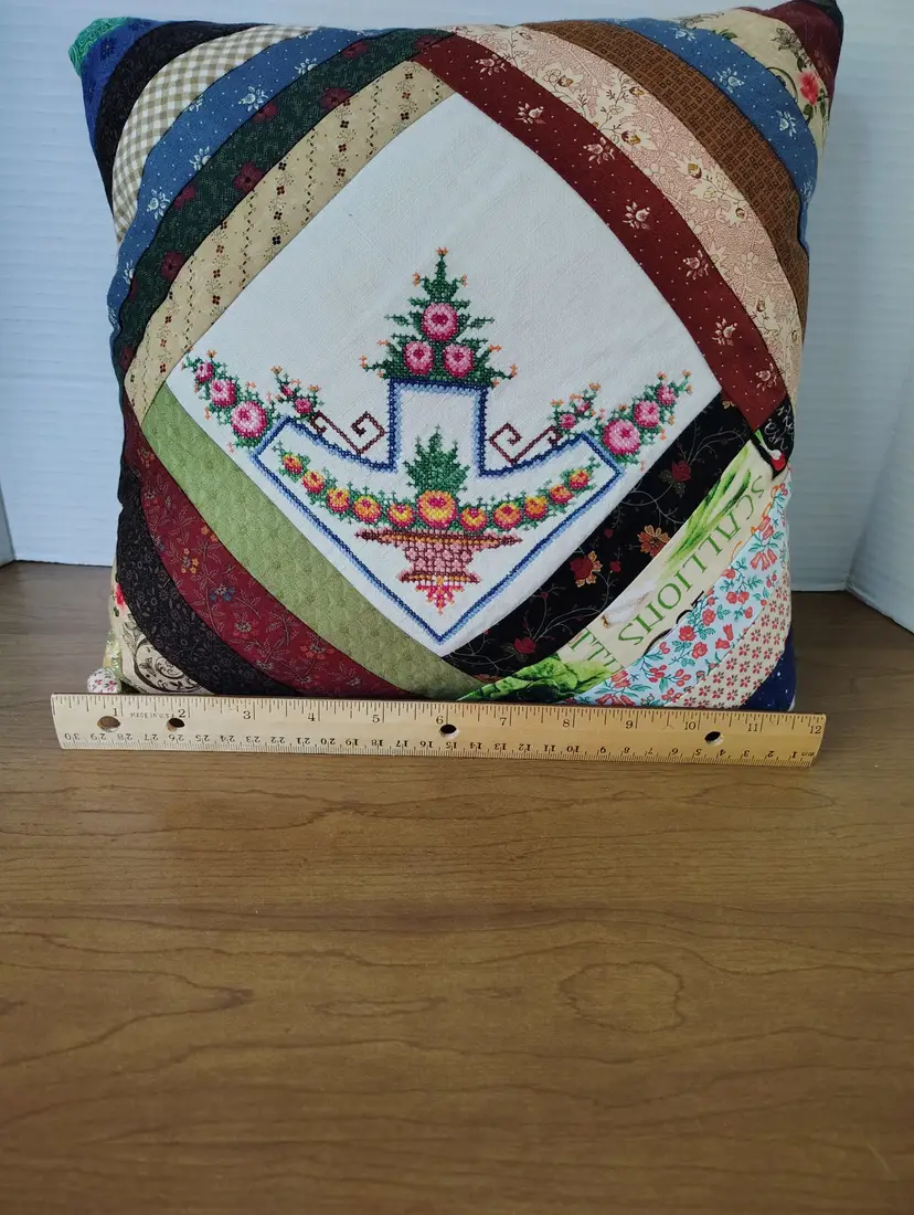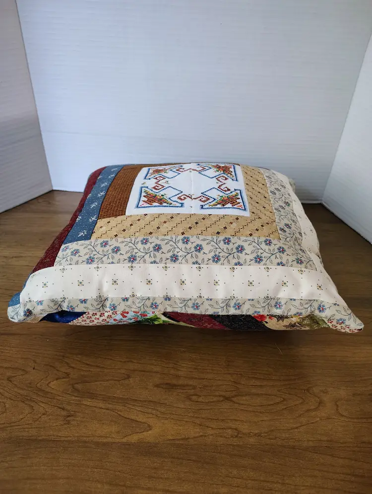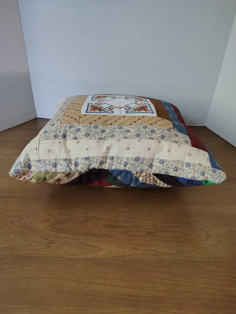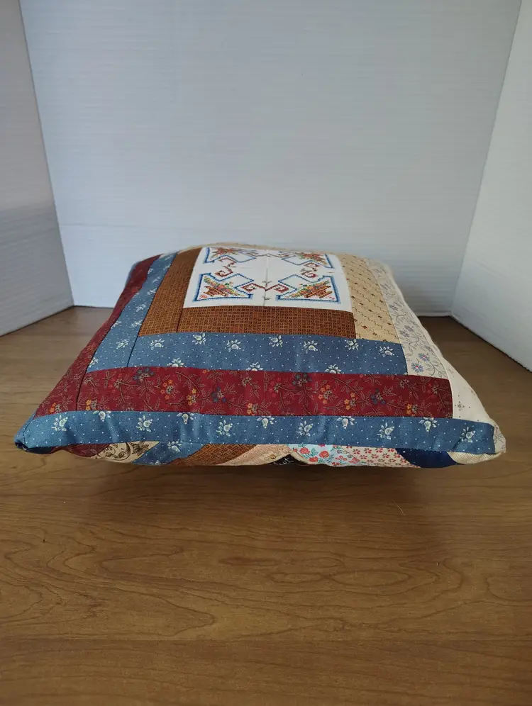 This vintage handmade quilted patchwork pillow features a charming cross stitch floral design within a log cabin pattern.
