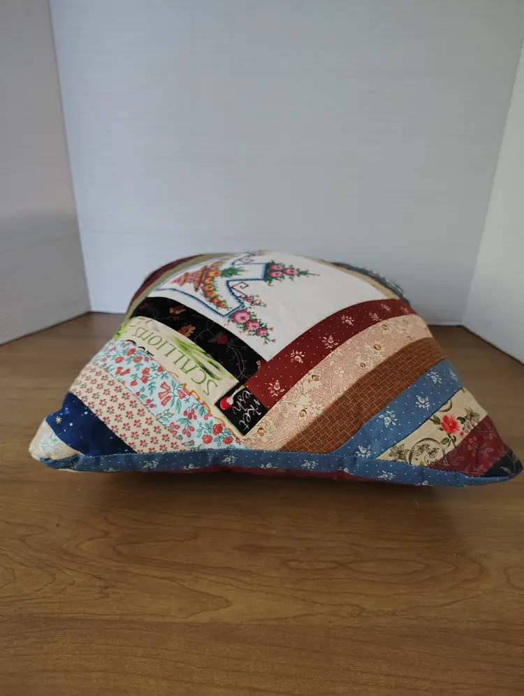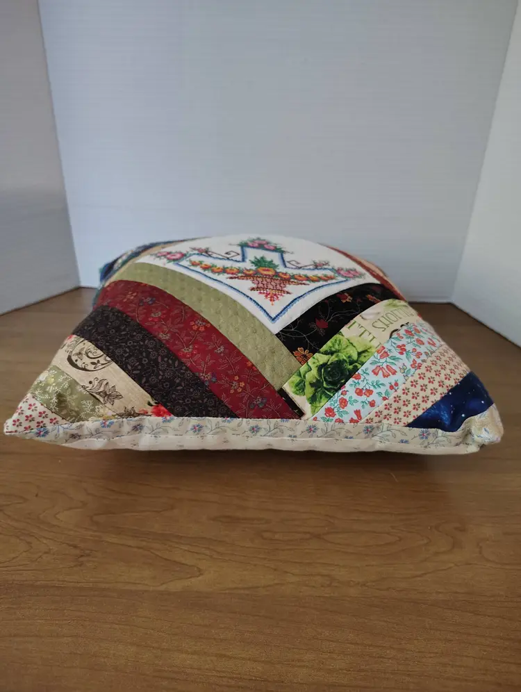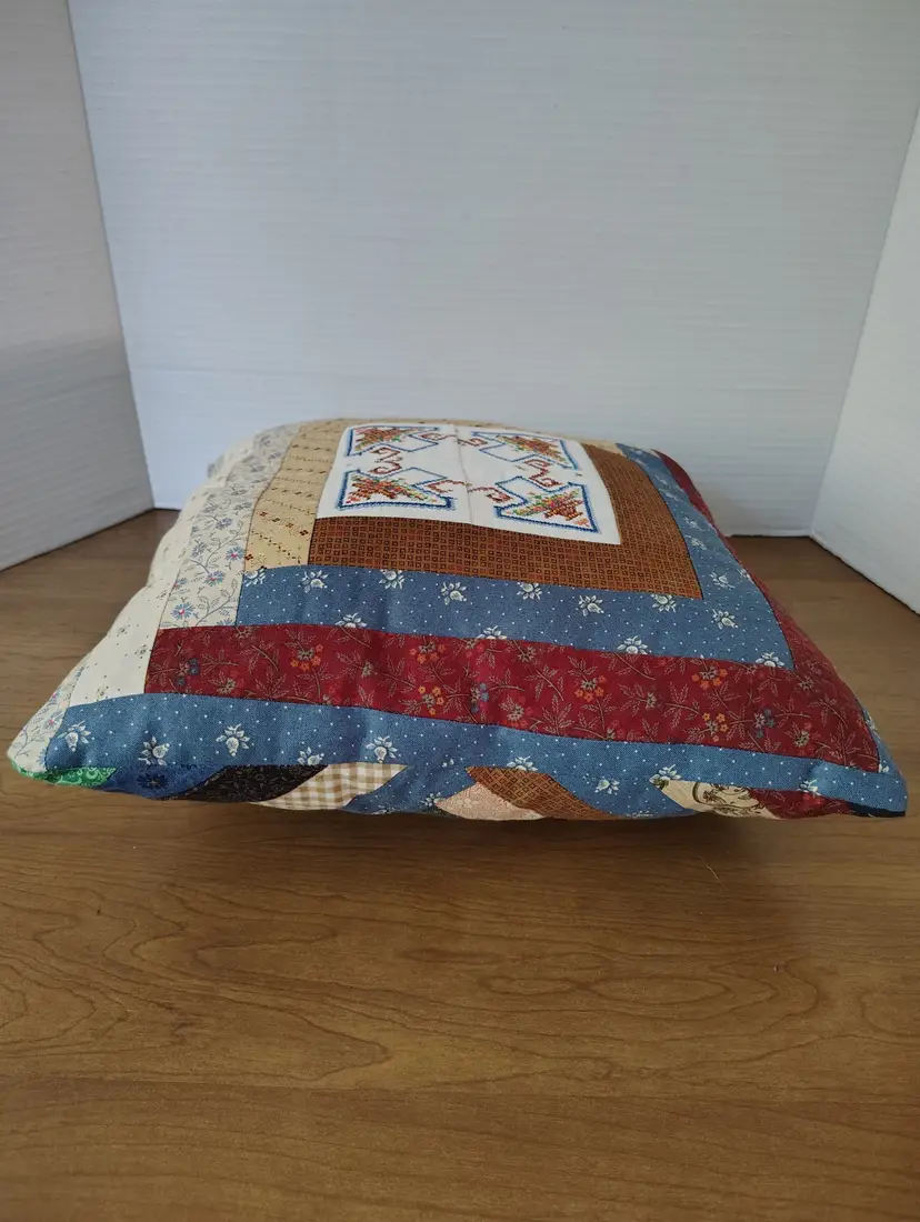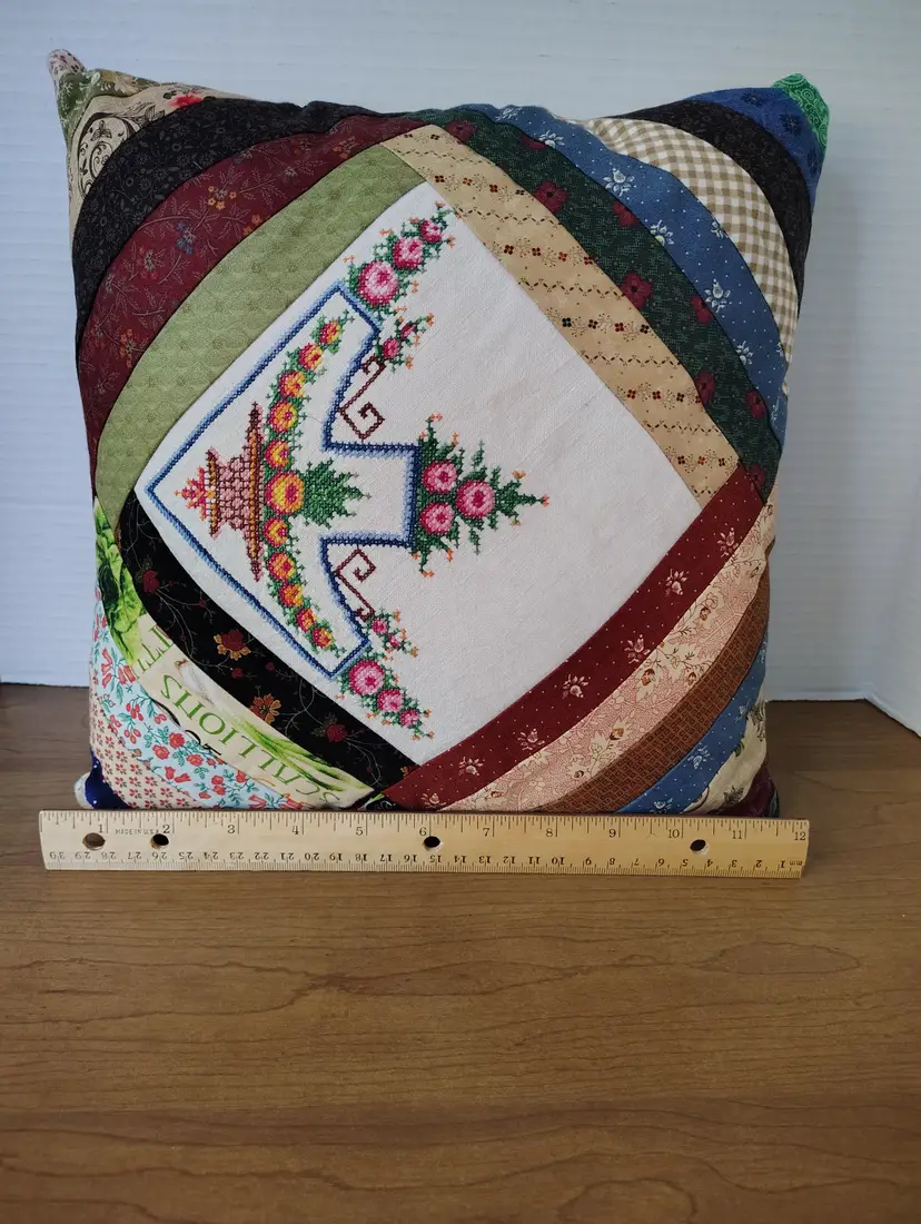 This vintage handmade quilted patchwork pillow features a charming cross stitch floral design within a log cabin pattern.