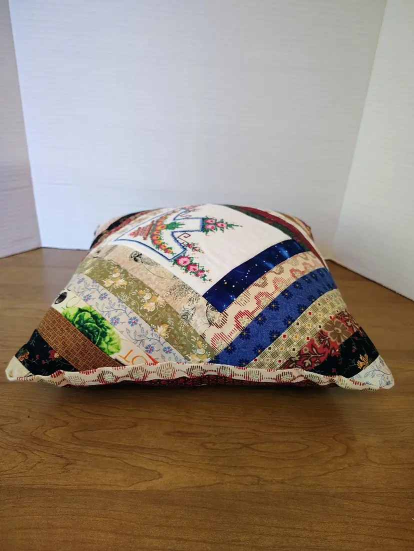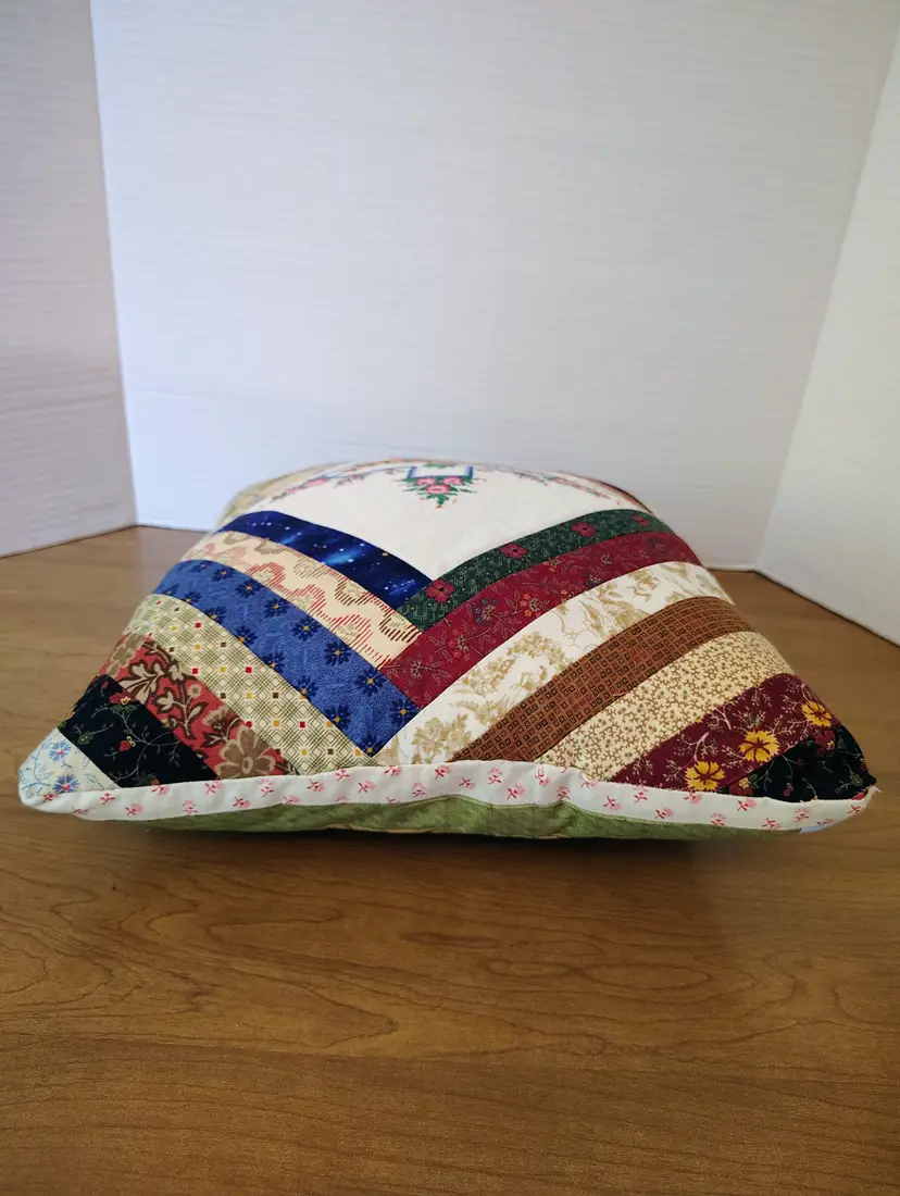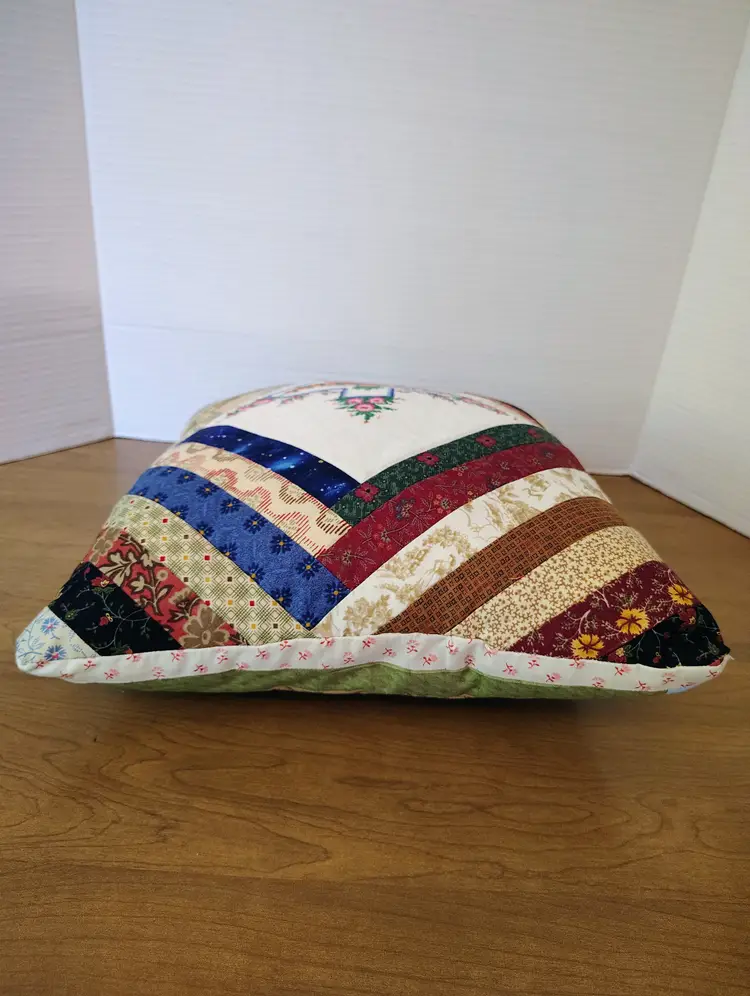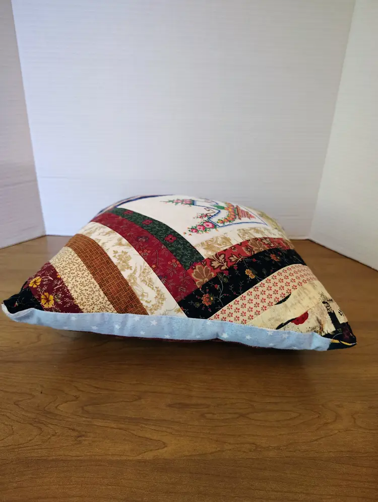 The pillow is made with multiple fabric patterns.