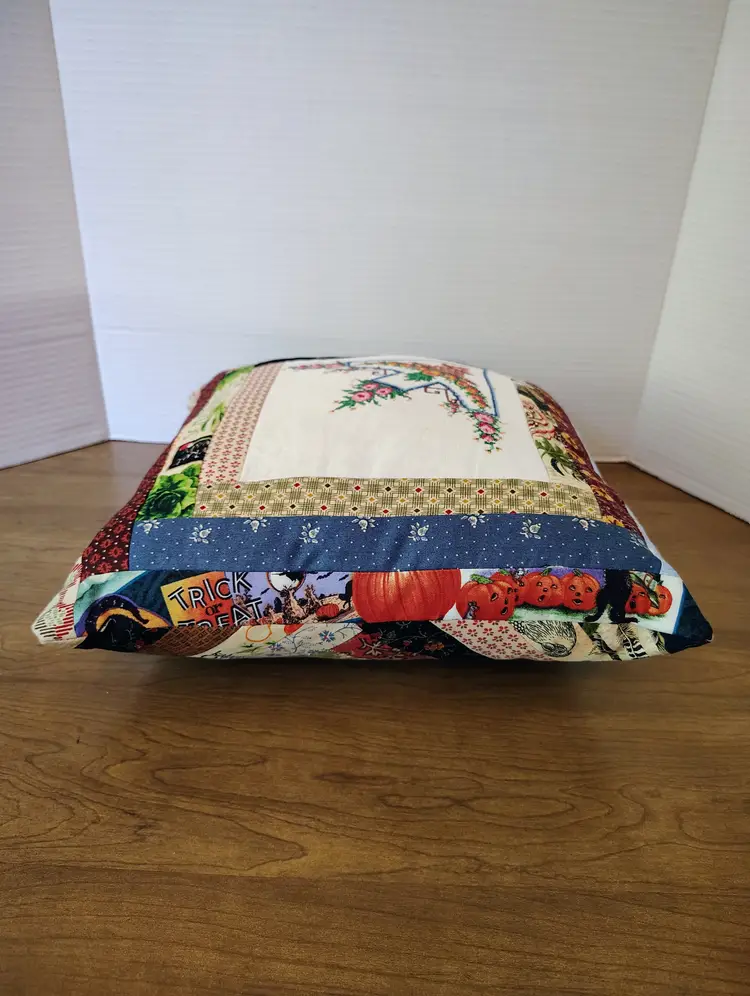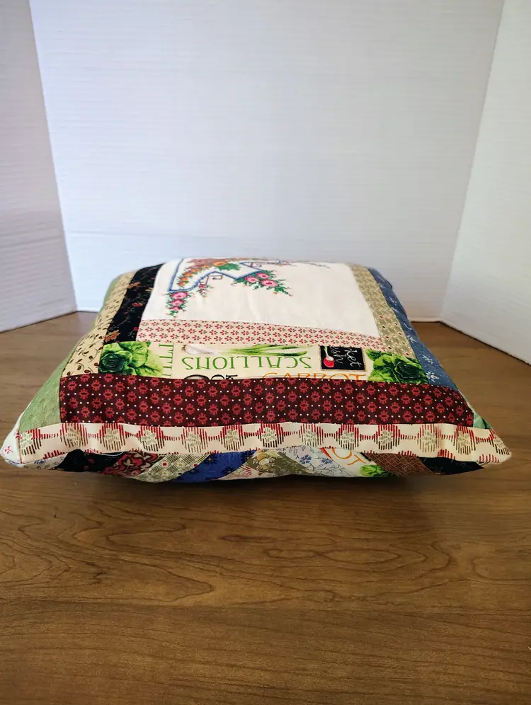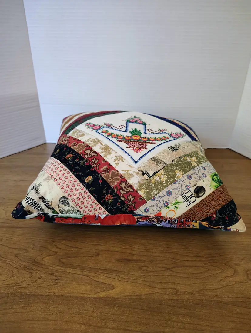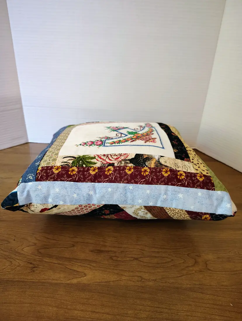 The pillow is made with multiple fabric patterns.