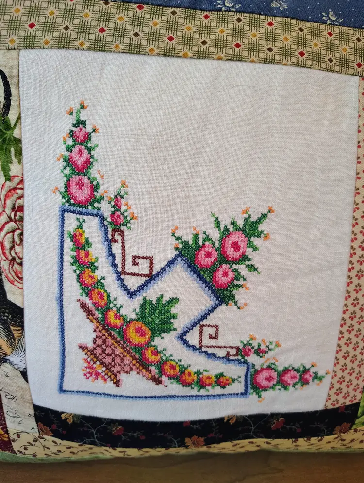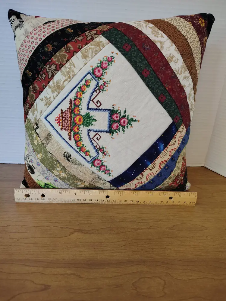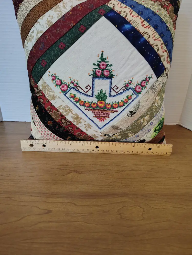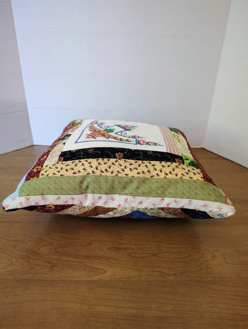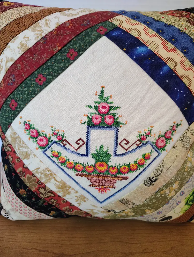 This vintage handmade quilted patchwork pillow features a charming cross stitch floral design within a log cabin pattern.