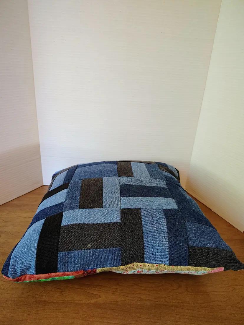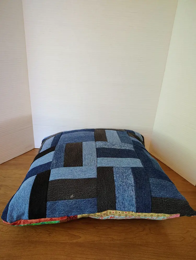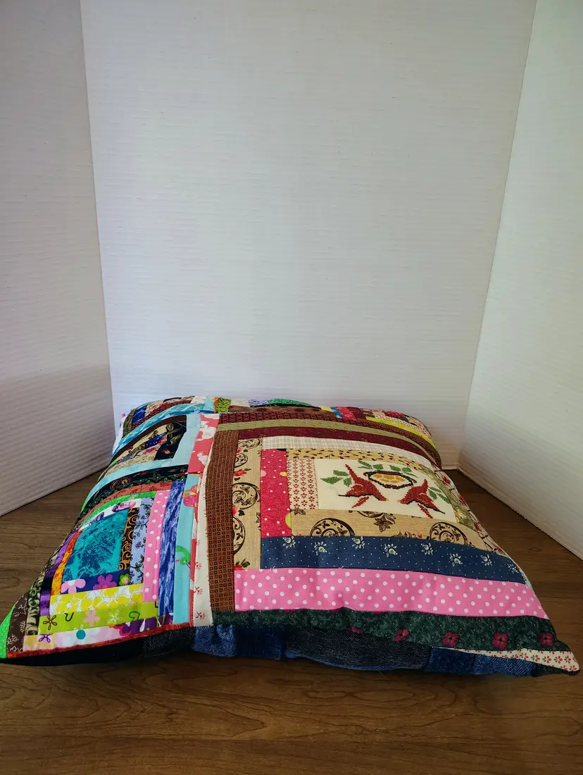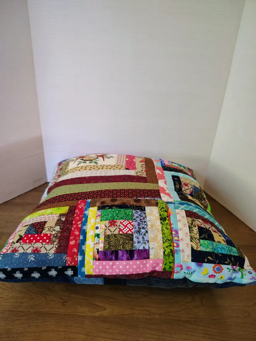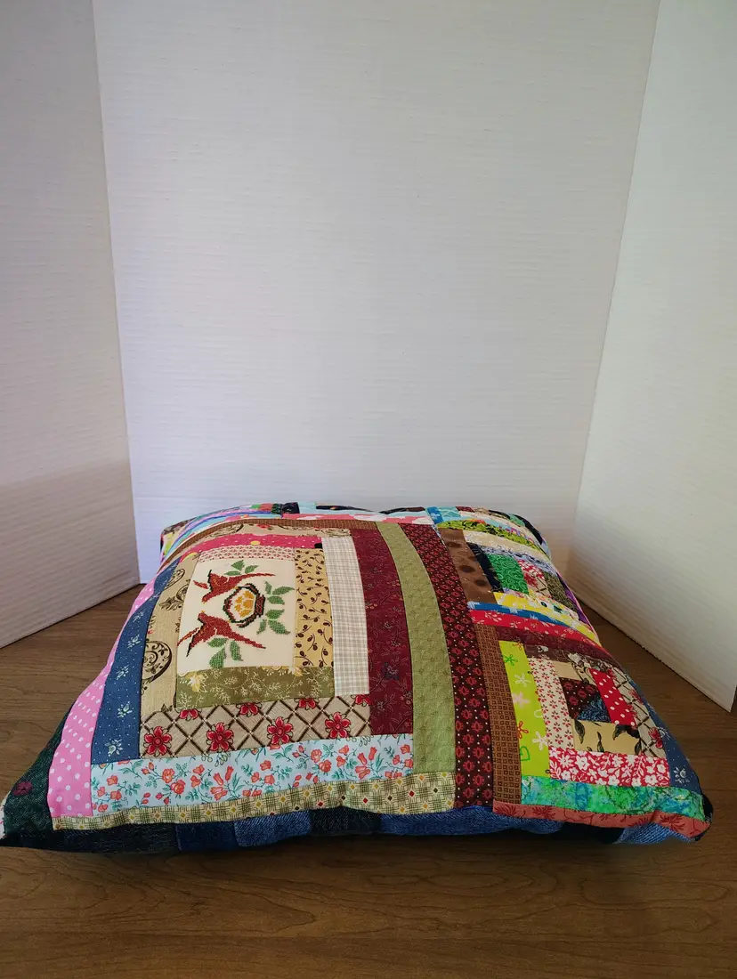 The pillow is made with multiple fabric patterns.