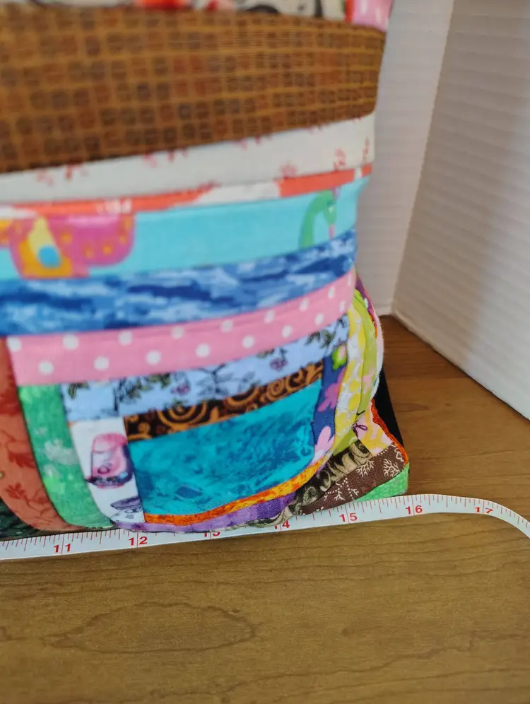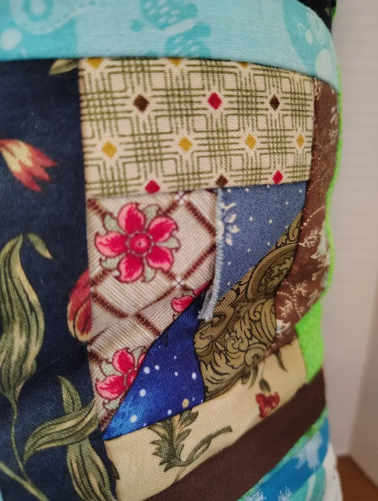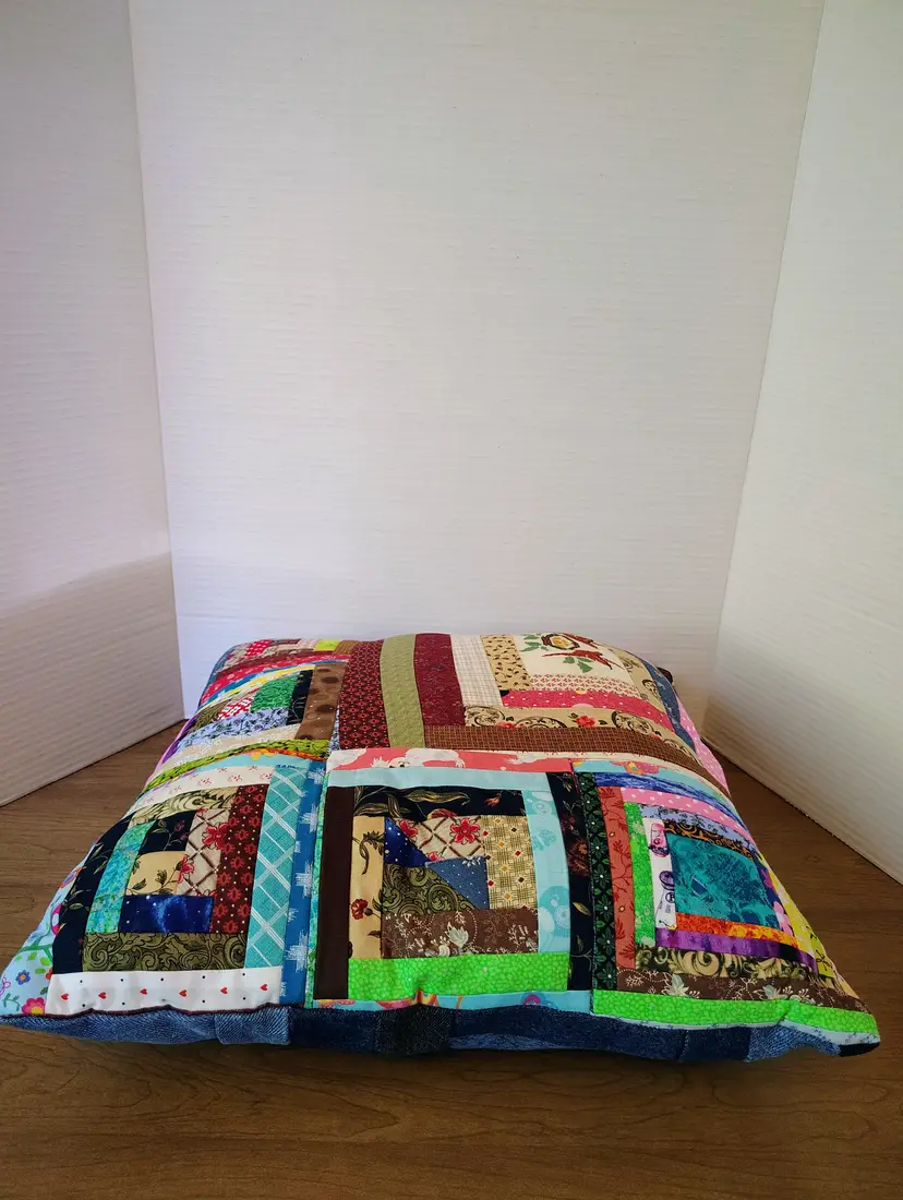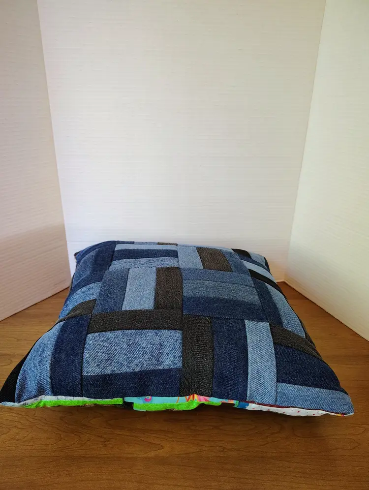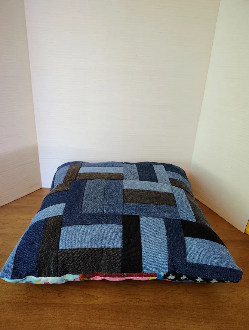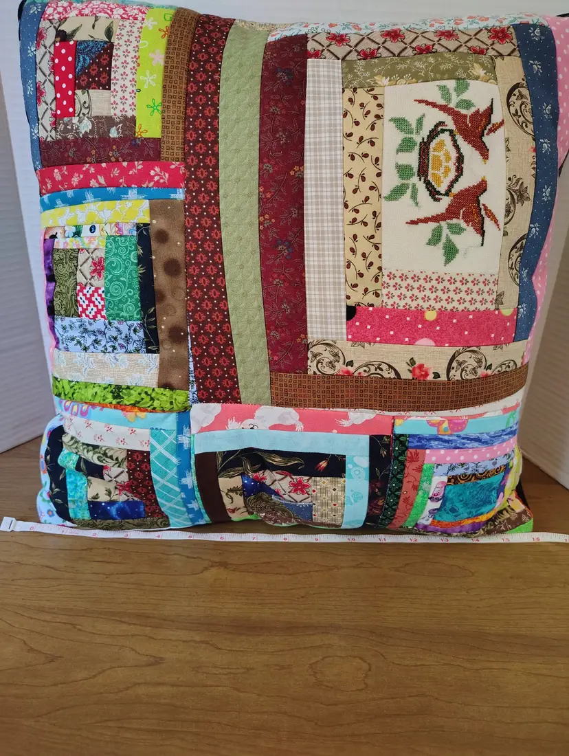 The pillow is made with multiple fabric patterns.