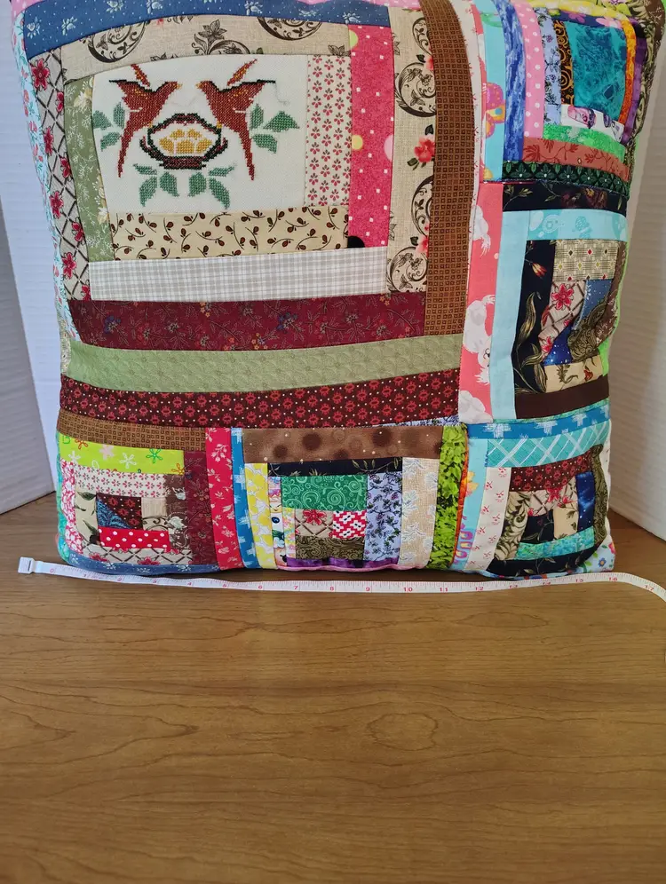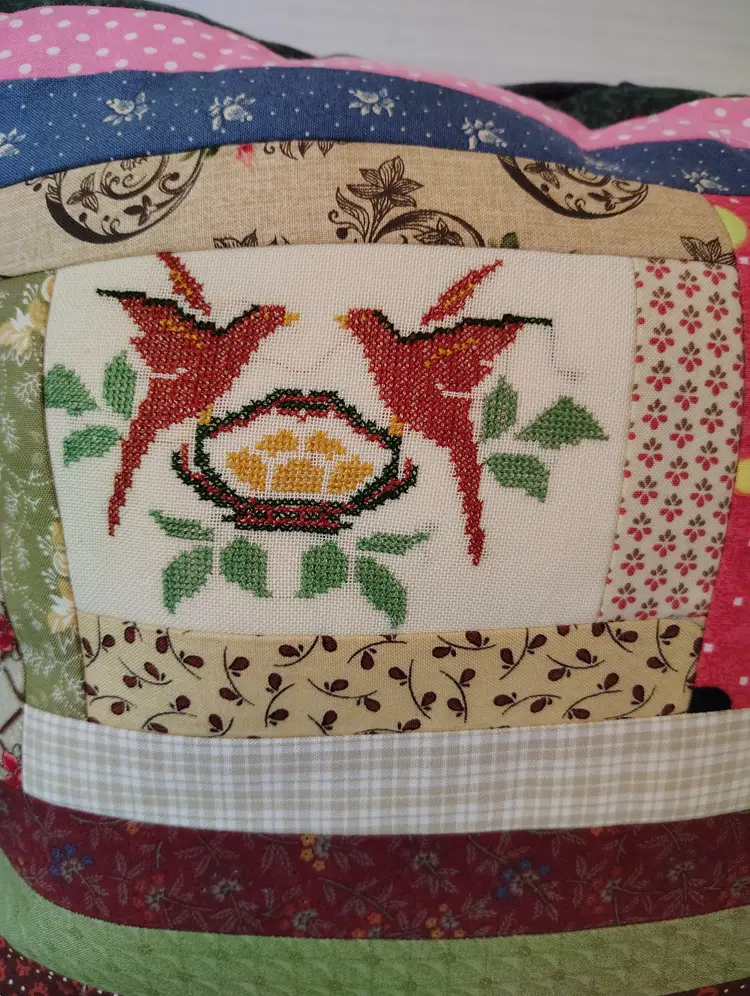 This vintage handmade quilted patchwork pillow features a charming cross stitch birds over a nest design within a log cabin pattern.