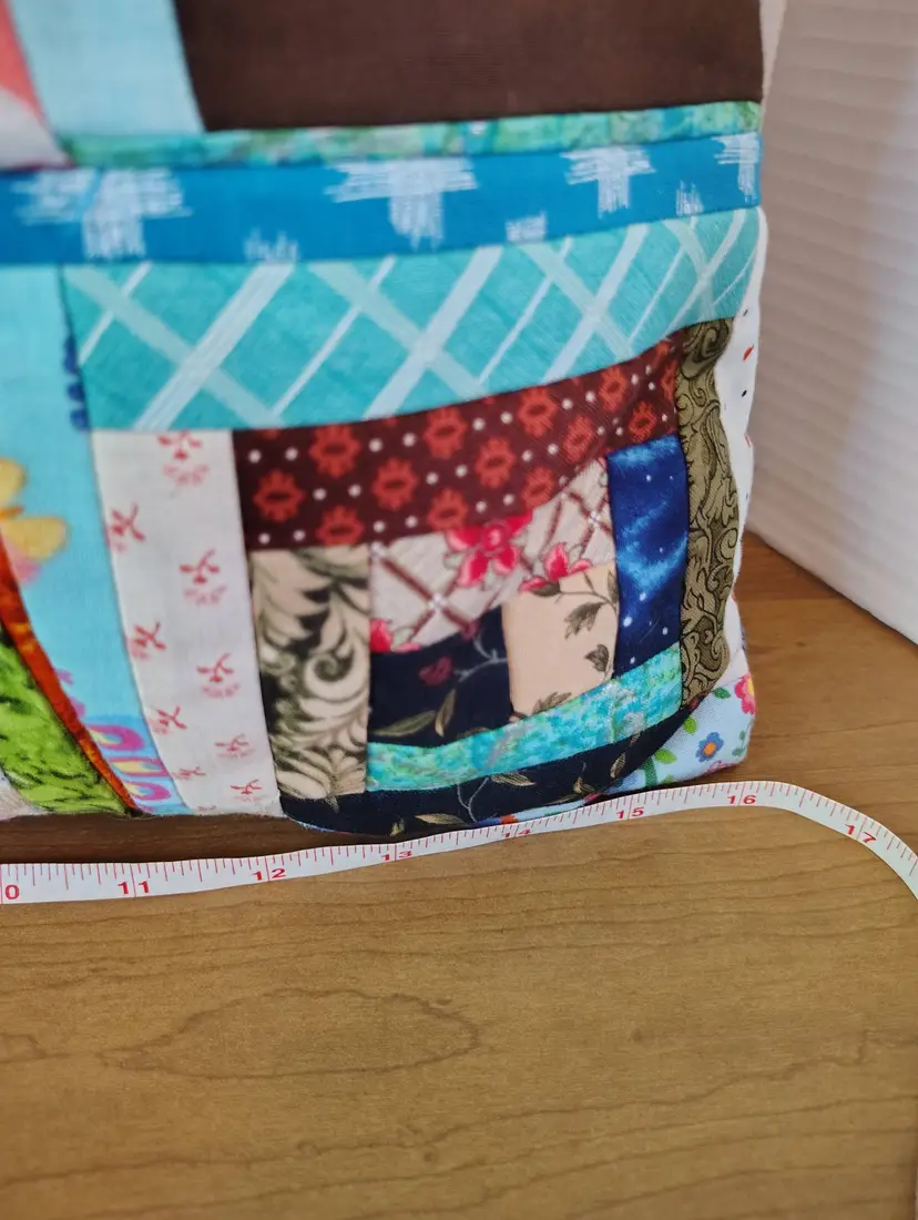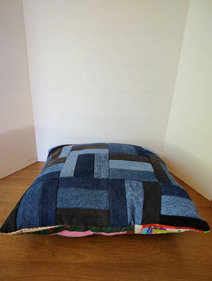 Side one has a log cabin square with birds along with smaller squares of multicolored patterns. Side two features patchwork pattern of denim in different shades of blue and black.