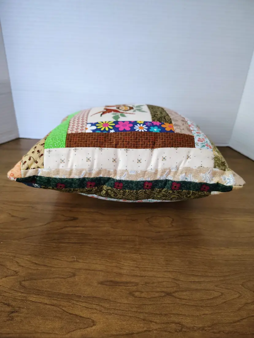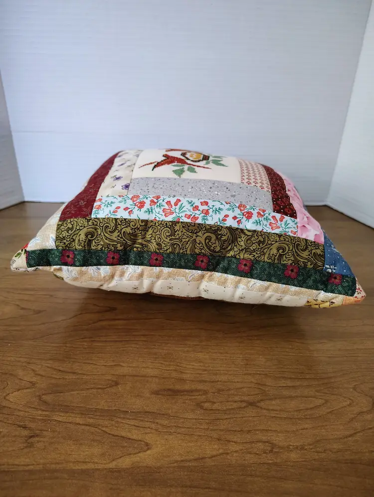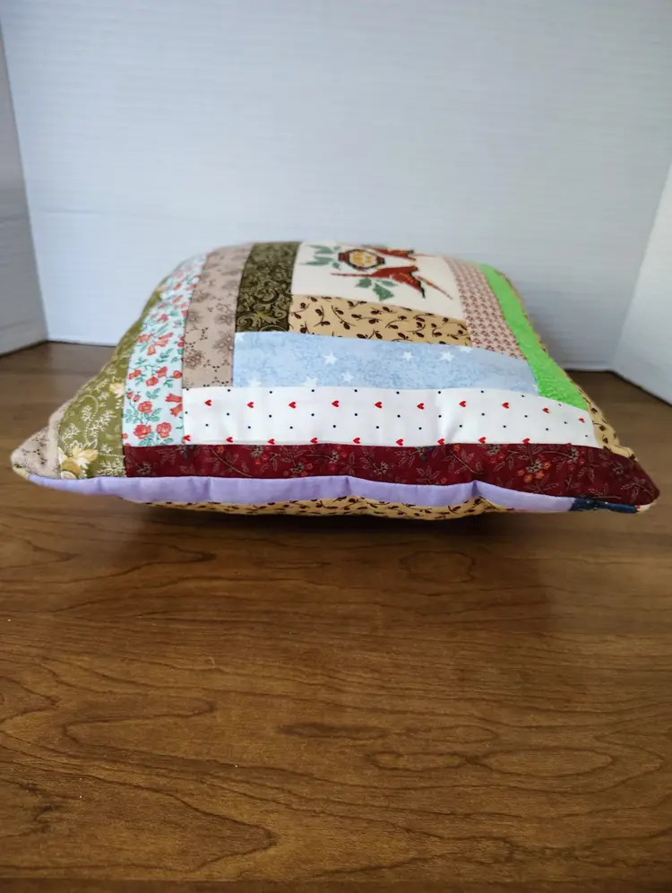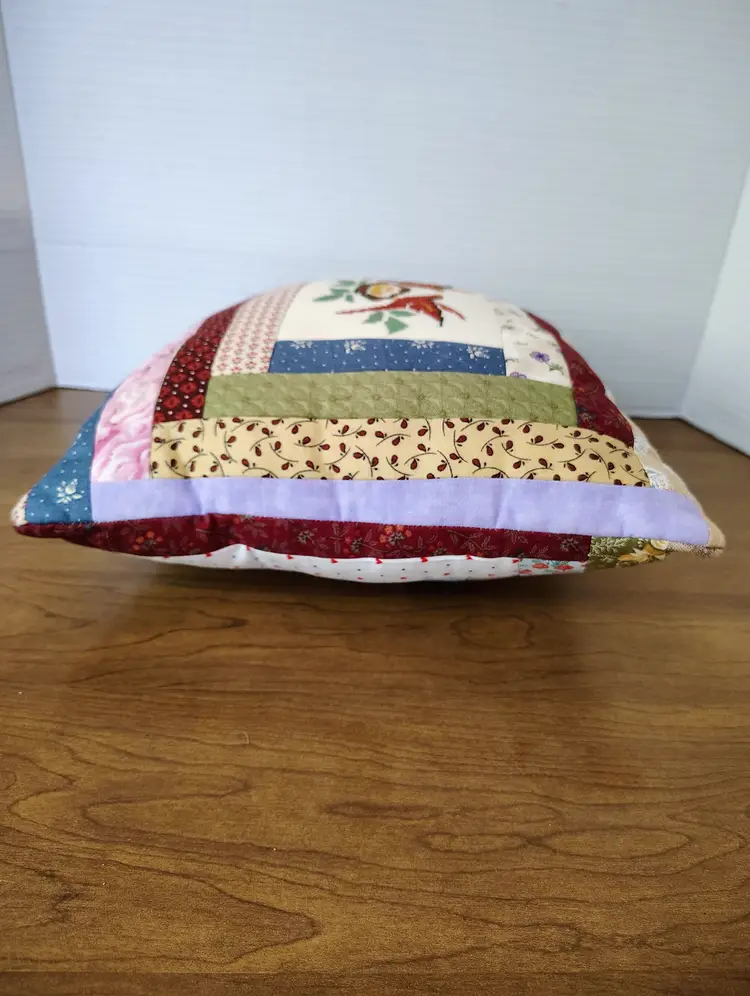 This vintage handmade quilted patchwork pillow features a charming cross stitch design of birds within a log cabin pattern.