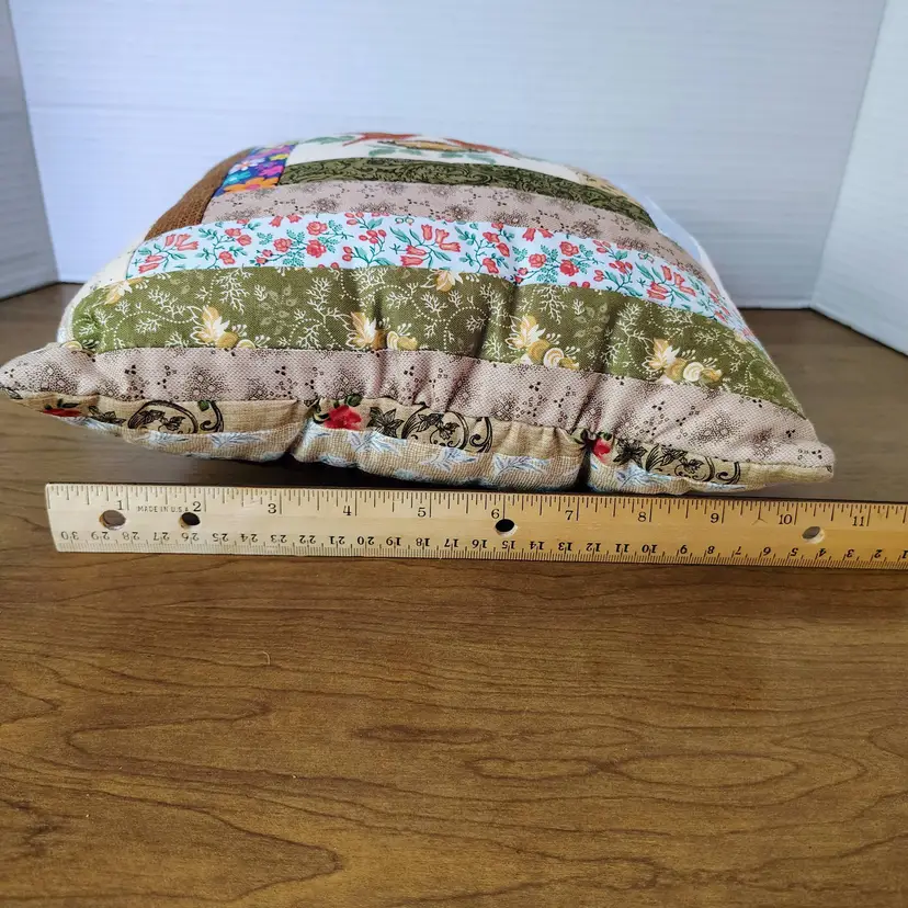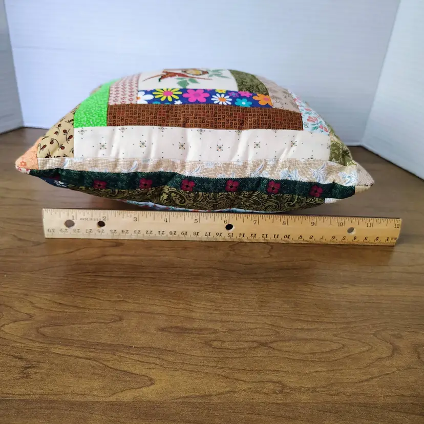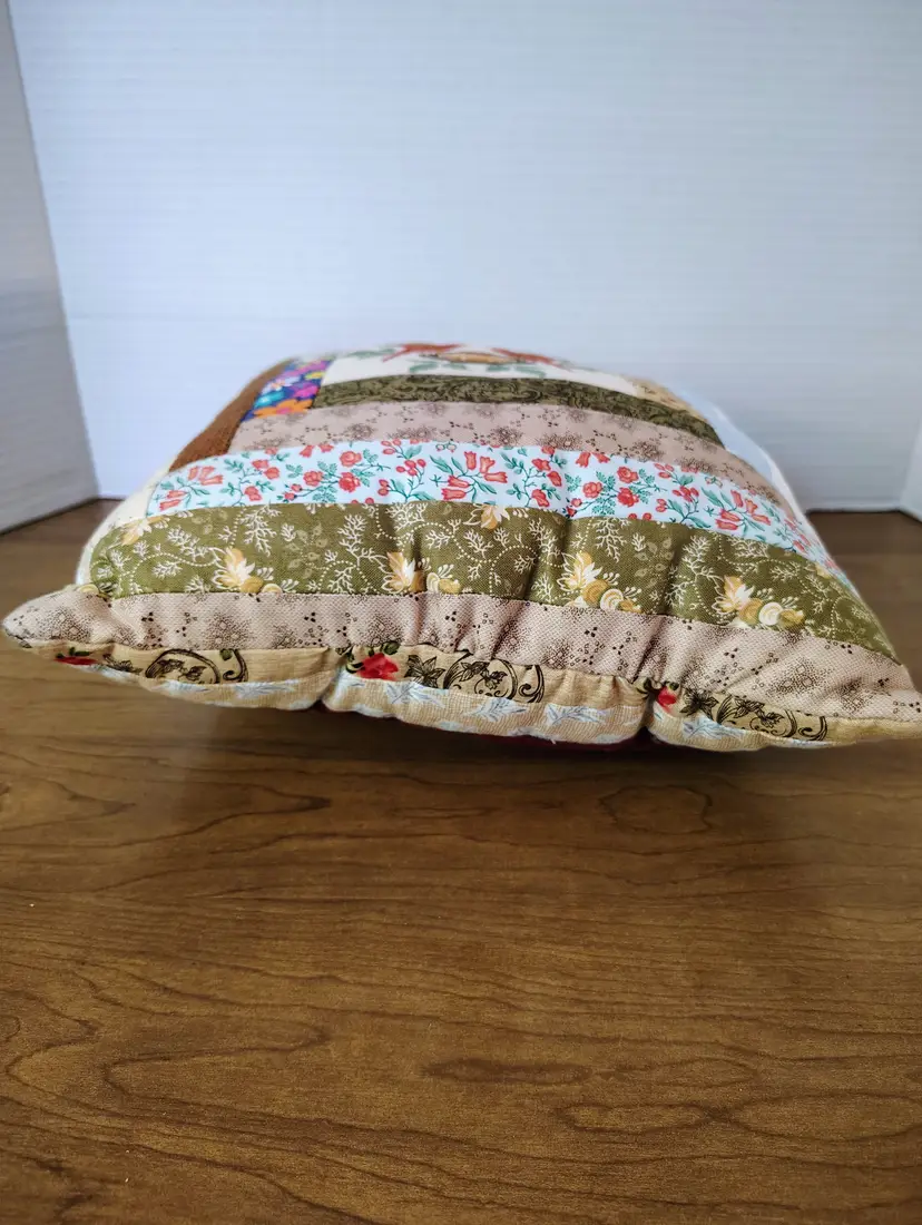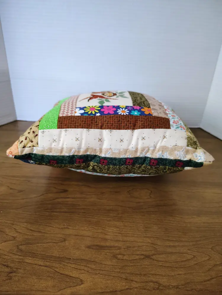 The pillow is made with multiple fabric patterns.