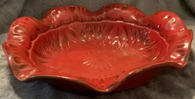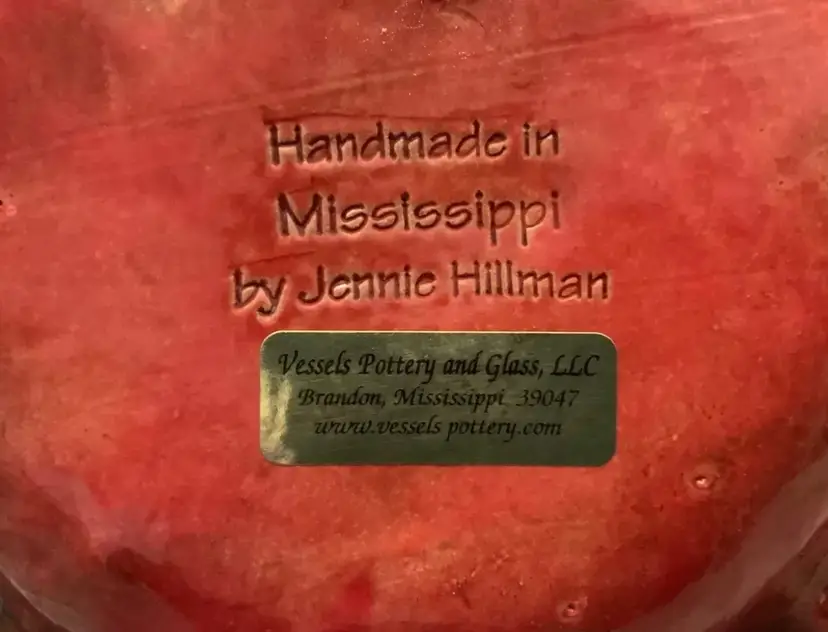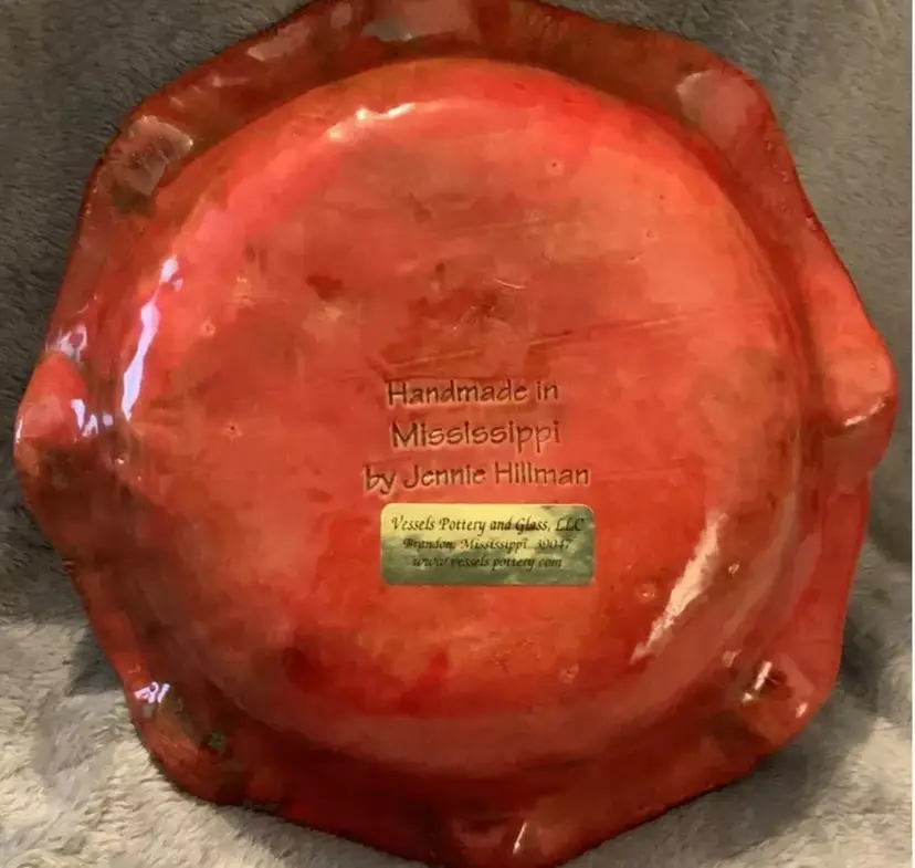 This exquisite round studio pottery bowl is a work of art by renowned artist Jennie Hillman from Brandon, Mississippi. The bowl features a stunning abstract pattern in vibrant red color that adds a touch of elegance to your home decor. The scalloped edge and etched decorative design make it a great centerpiece for all occasions. Handmade and hand-painted with care instructions of hand wash only, this original and licensed reproduction bowl is part of the art pottery product line with a painted finish. Perfect for serving, display or as a collectible, this bowl is a must-have for any pottery lover. No chips or cracks. Measures 9x2. Weighs 2lb.